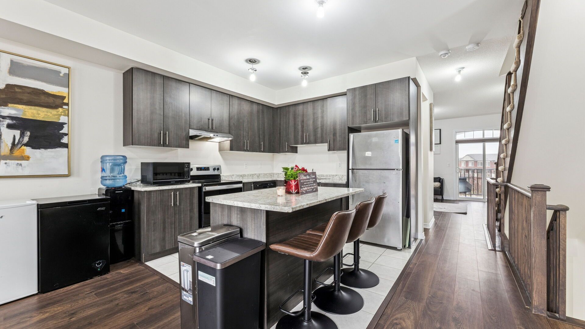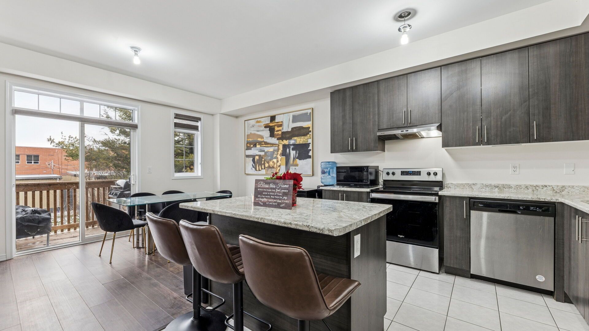 Immaculate showstopper in the heart of ajax! This freehold townhouse is perfectly situated near major shopping centers, public transit, scenic walking trails, and top-rated schools. Offering 4 spacious bedrooms and 4 washrooms, this rare layout is ideal for families and multi-generational living. The ground-level suite provides excellent flexibility, featuring its own washroom and kitchenette-perfect for in-laws, guests, or a private home office. Bright and thoughtfully designed, the home is filled with natural light from large windows throughout, creating a welcoming and open atmosphere. Enjoy the convenience of a direct garage entrance, two washrooms with double sinks for busy mornings, and two generous balconies at the front and back-ideal for relaxing outdoors. The elegant exterior sits on a quiet, child-friendly street with sidewalks for added safety. A school right in the backyard and a park just steps away make this location especially attractive for families. Minutes to costco, walmart, home depot, grocery stores, restaurants, and quick access to highways 401 and 407, this home offers unmatched convenience for commuting and daily living. Move in and enjoy a beautifully laid-out townhome in a vibrant, family-oriented community-this one truly has it all.