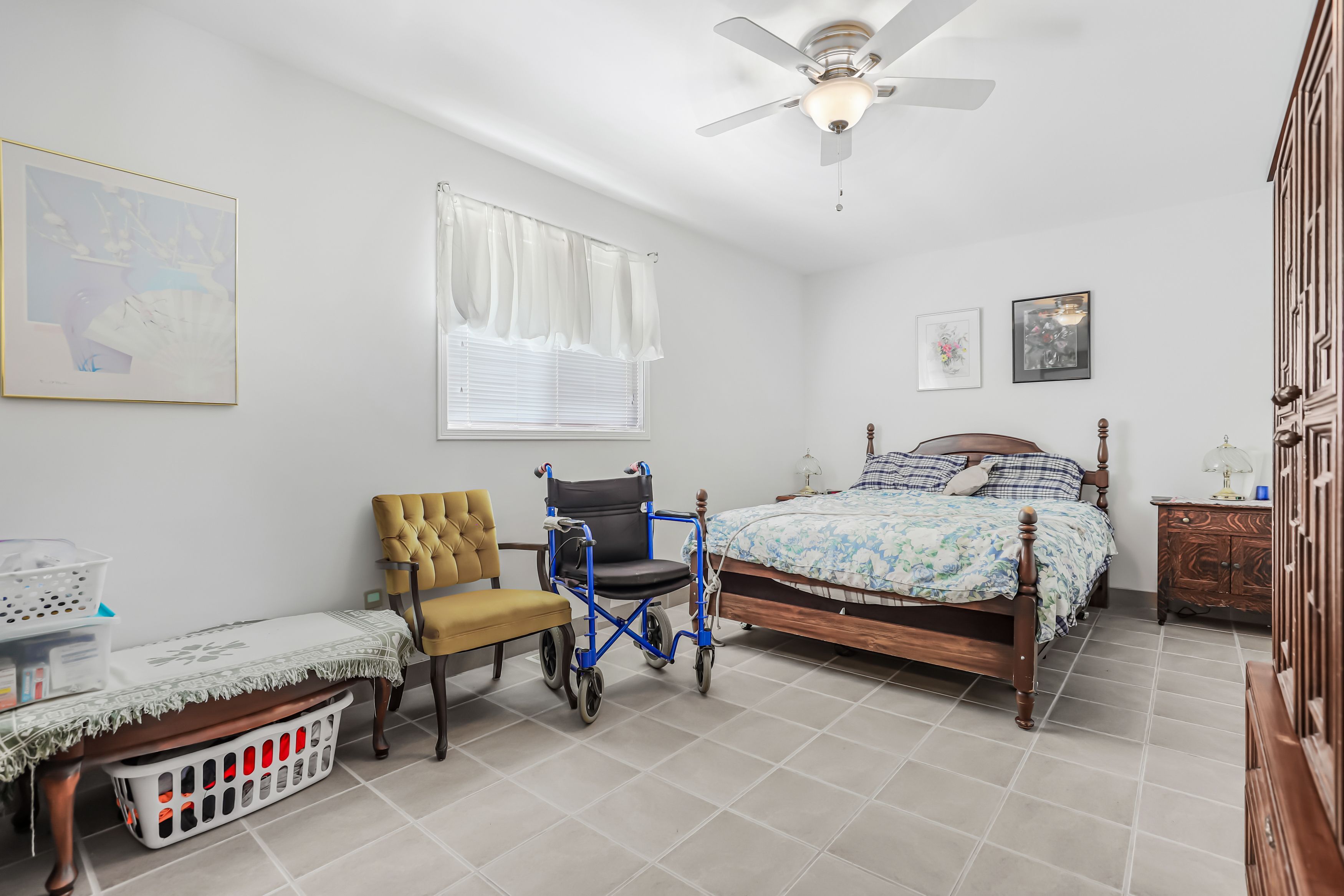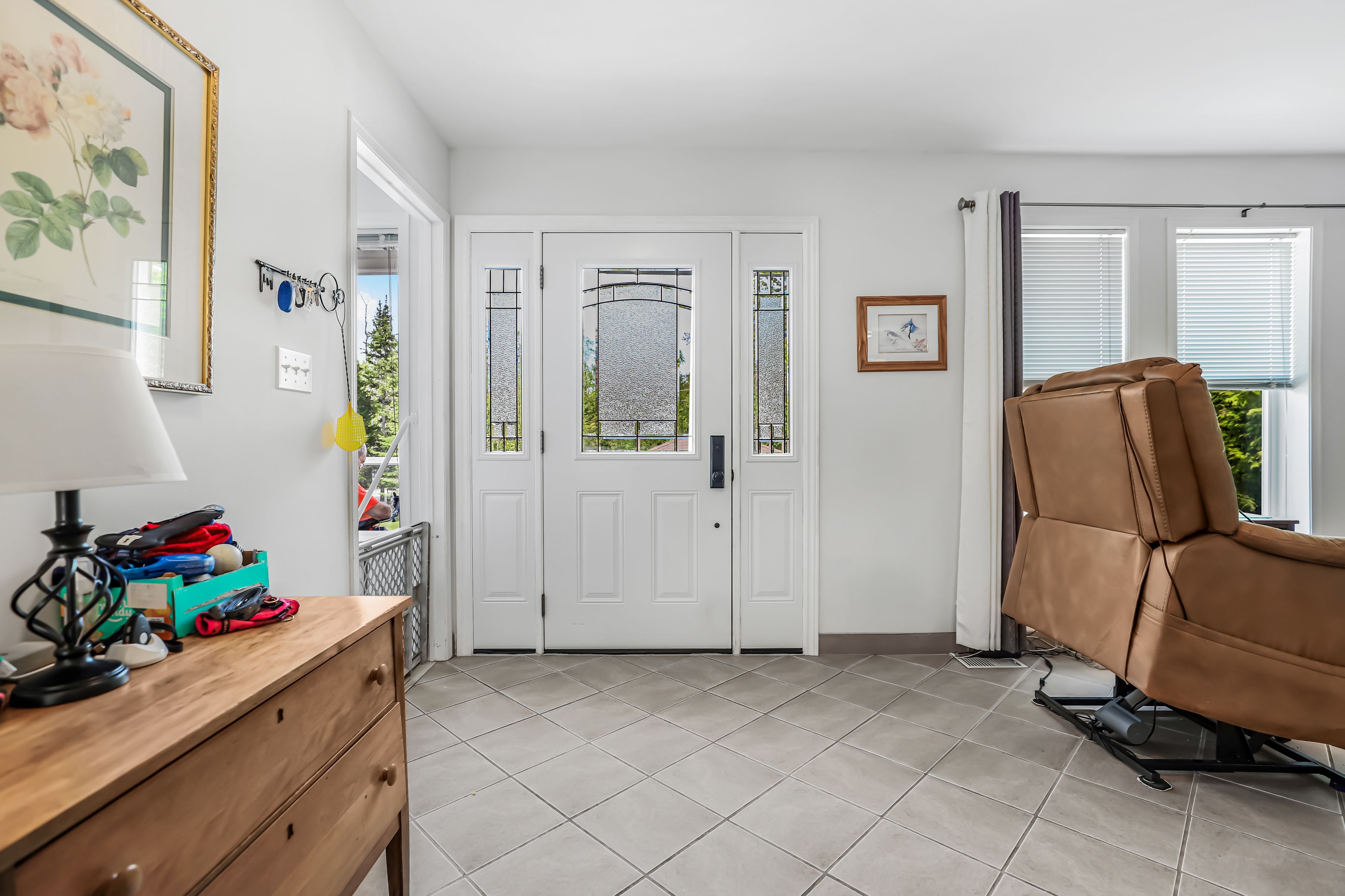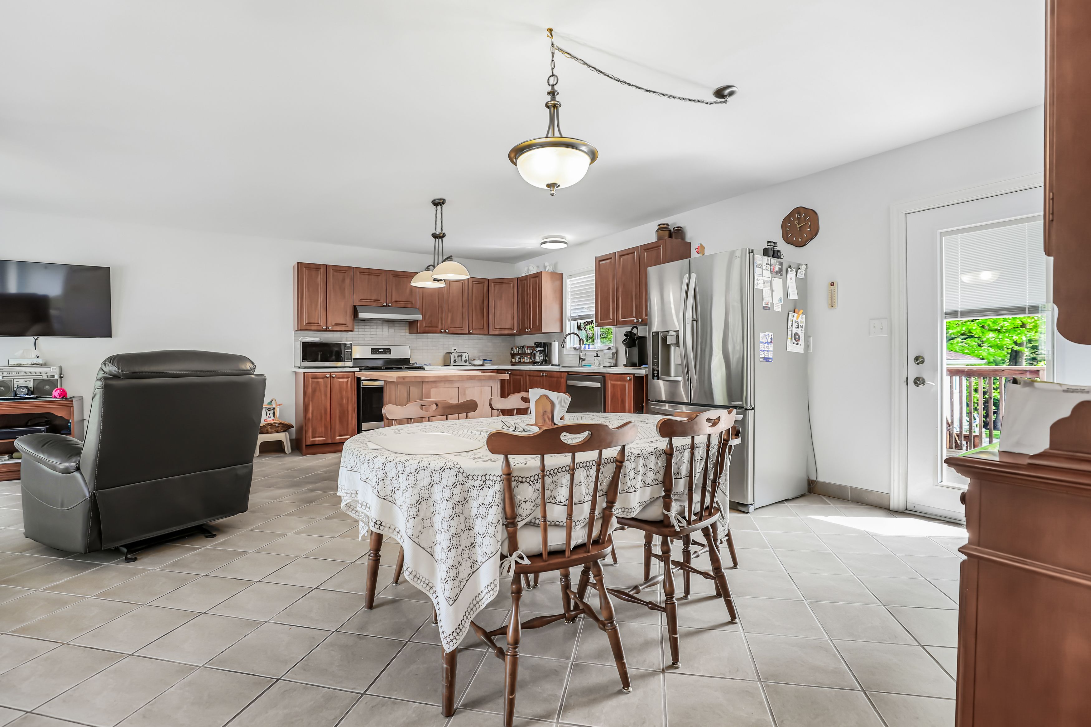 • Bright interior with open-concept layout and tile floors throughout.