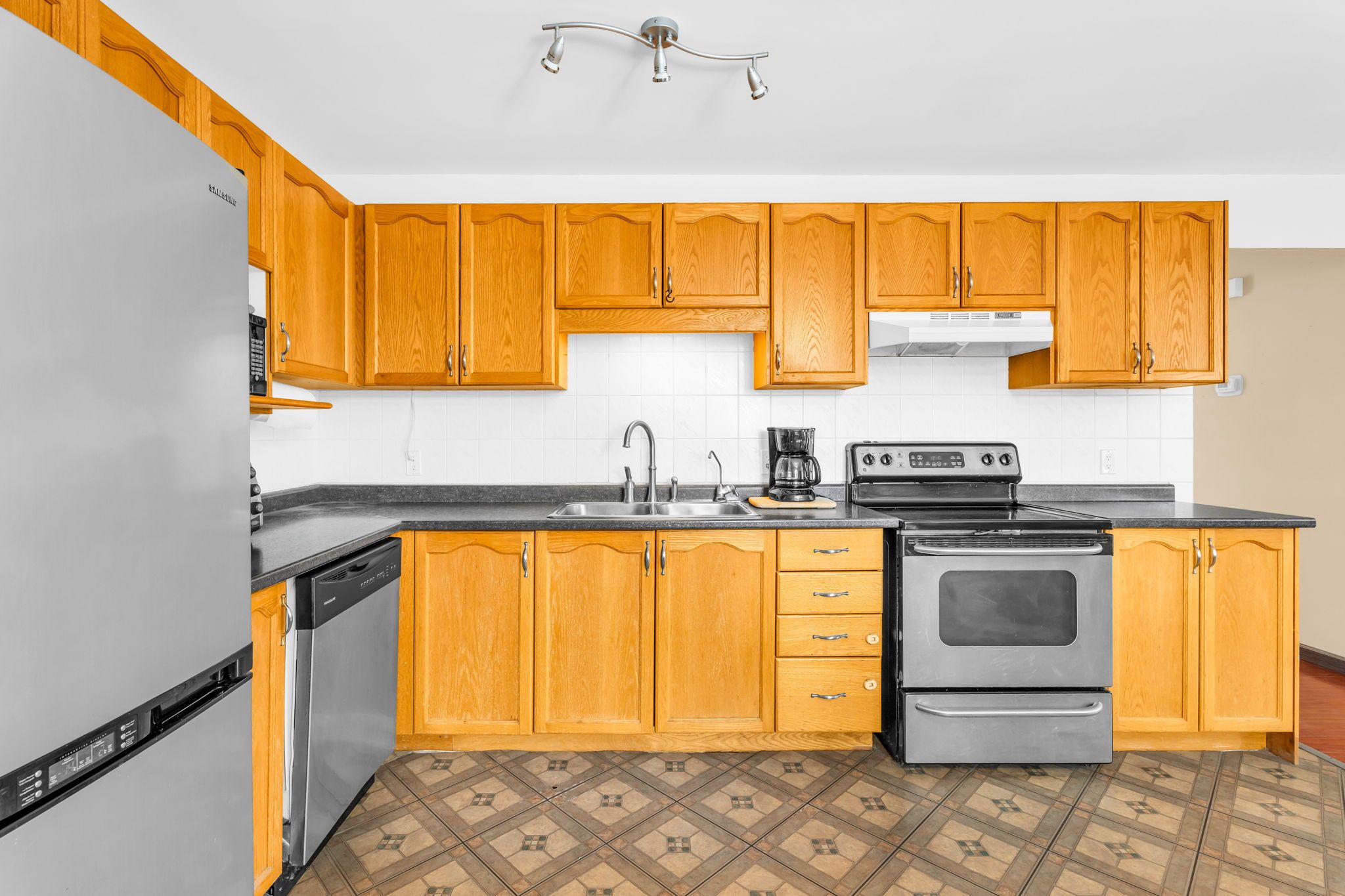 • Open-concept living room and kitchen with stainless steel appliances.