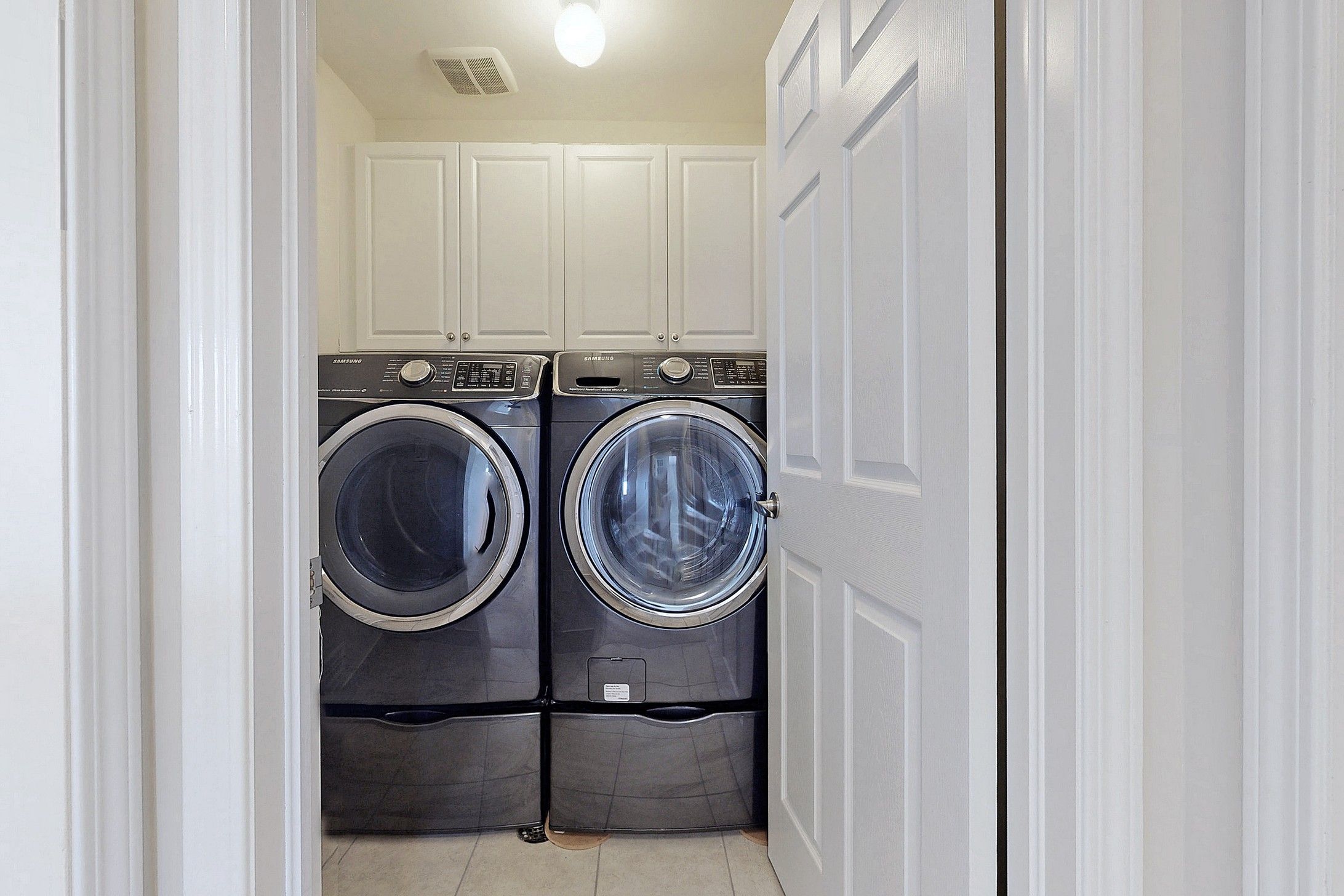• Remodeled kitchen features quartz counters and ample pantry space.