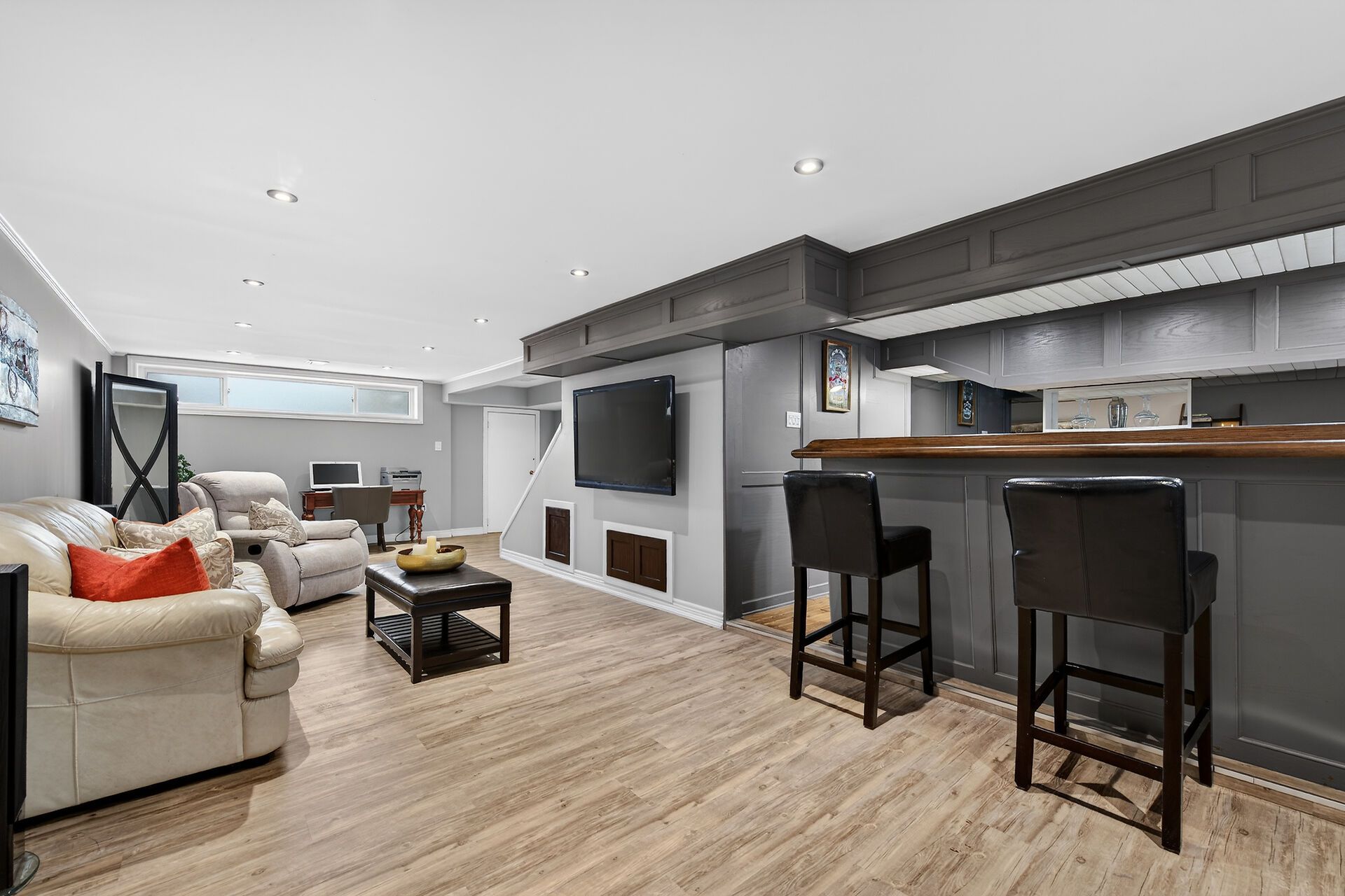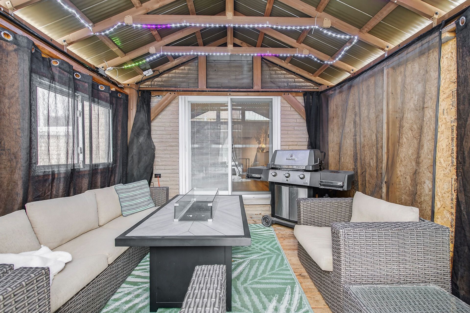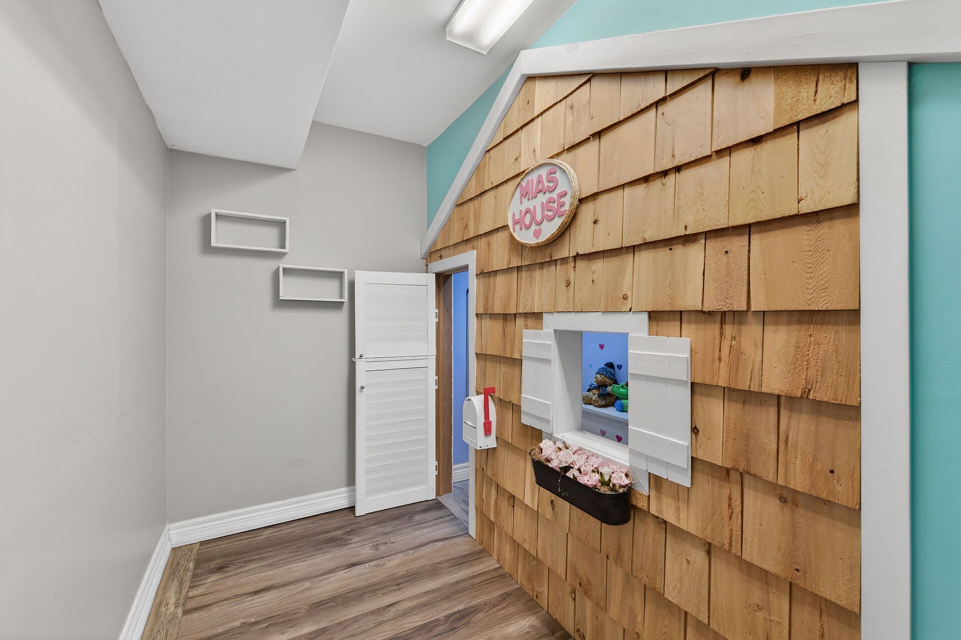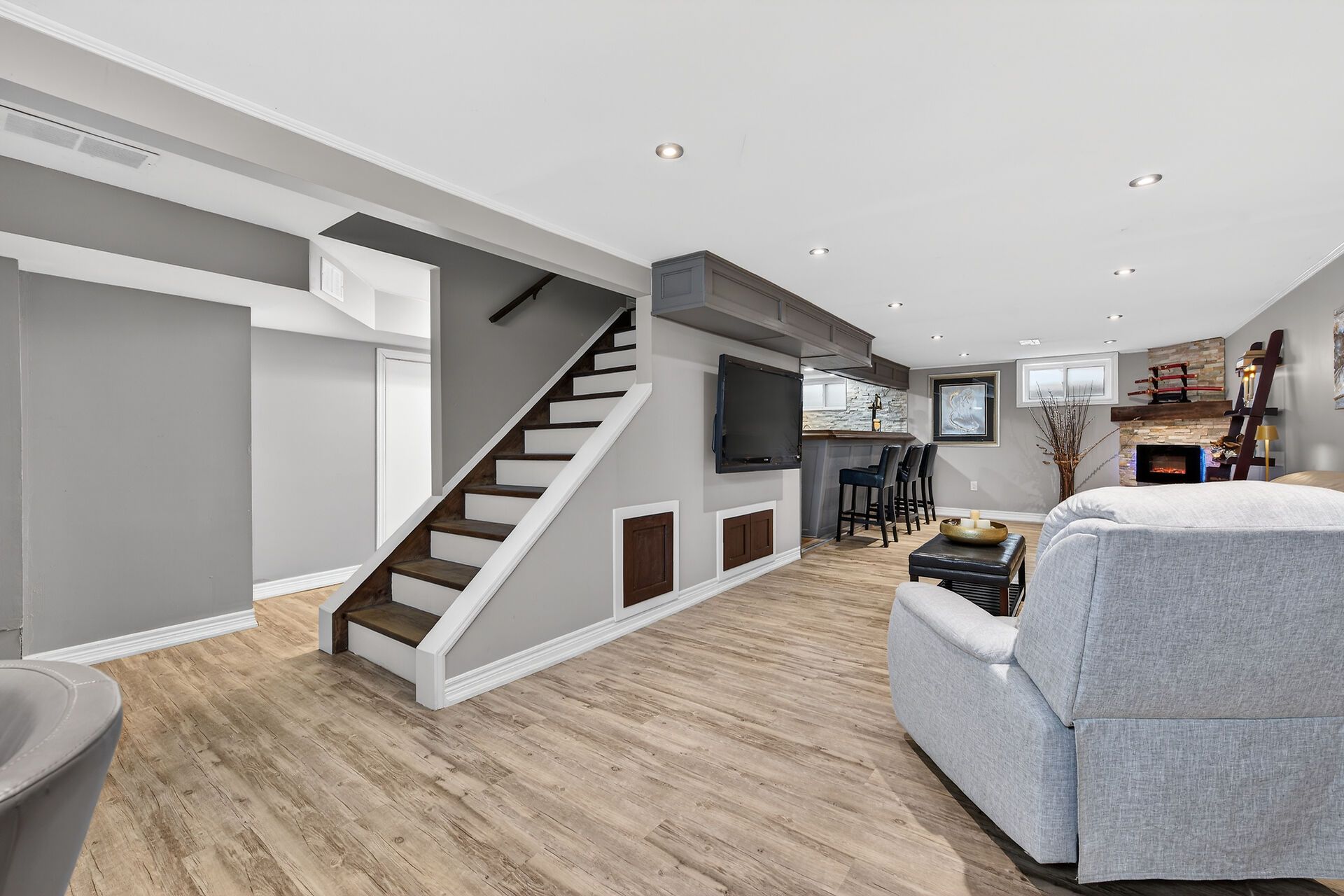 • Large recreation room with wet bar, electric fireplace, and kid-friendly playhouse.