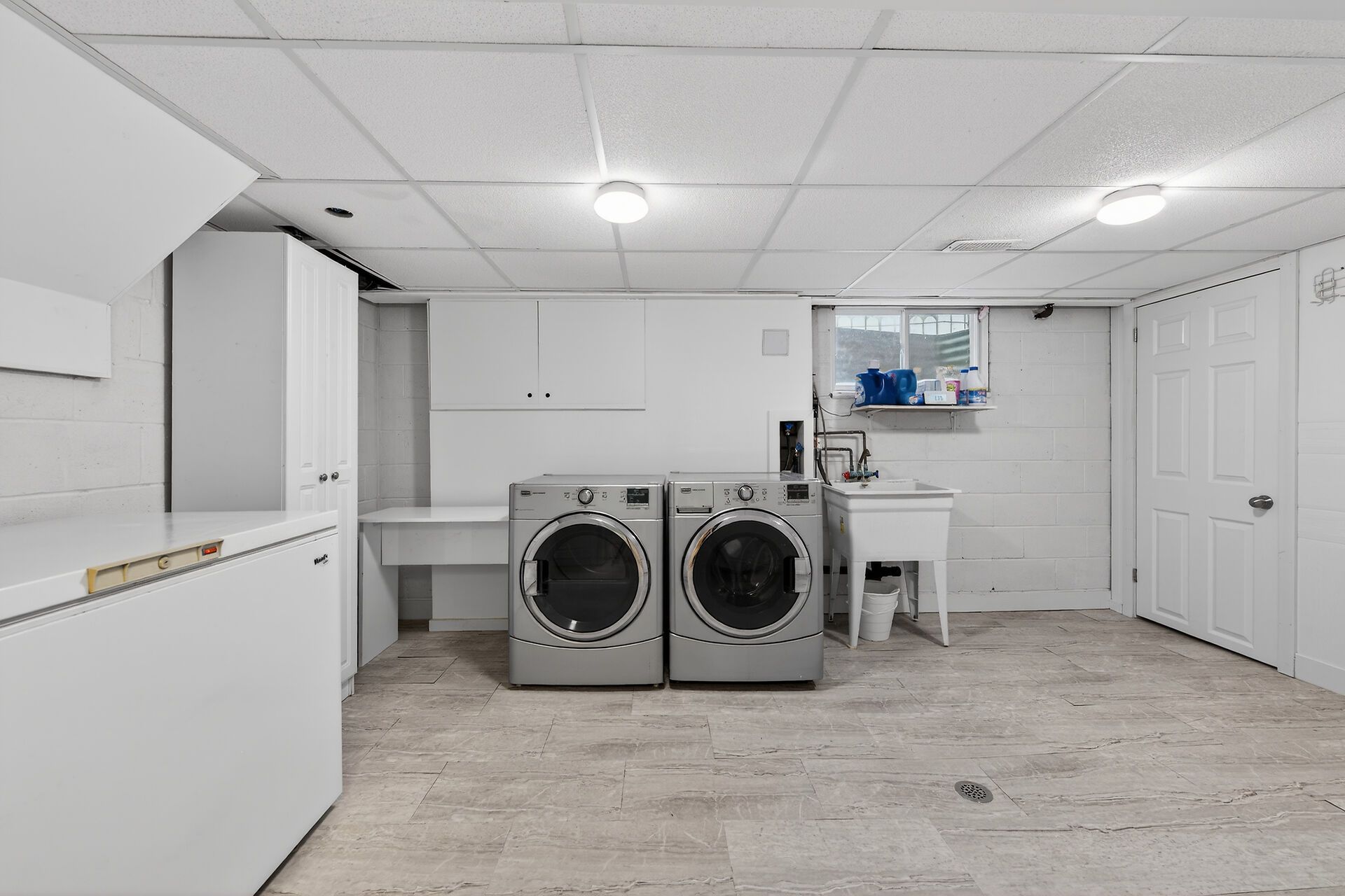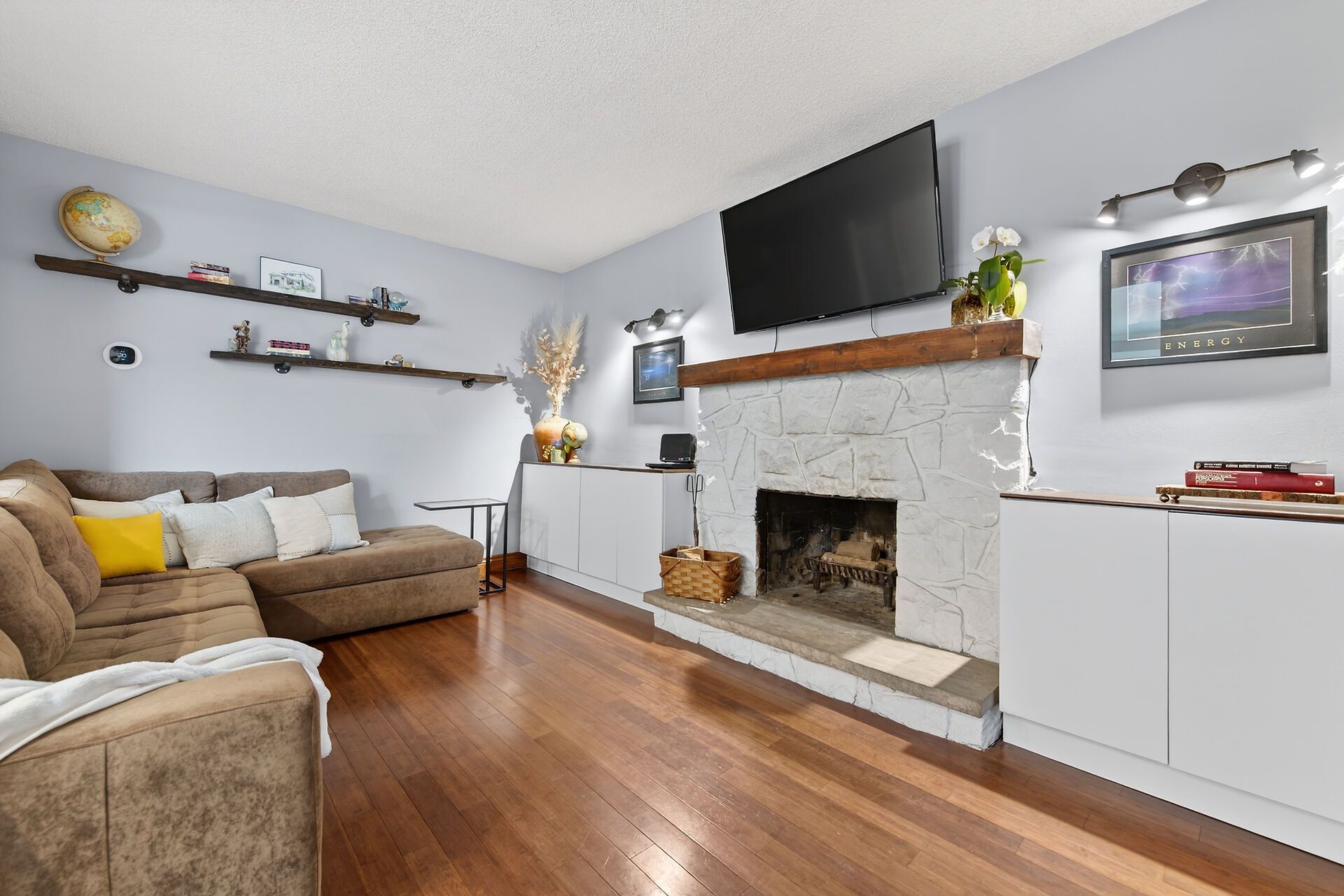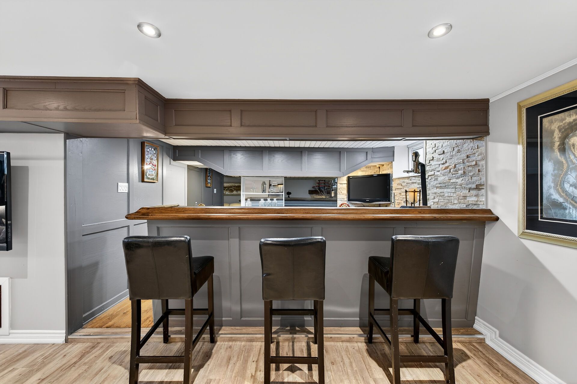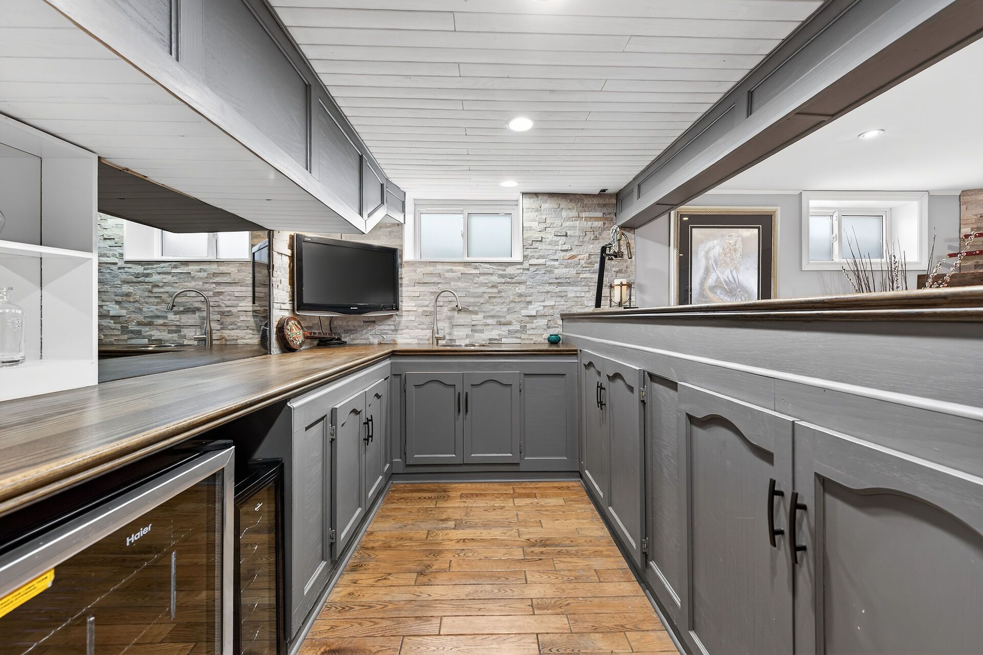 • Large recreation room with wet bar, electric fireplace, and kid-friendly playhouse.