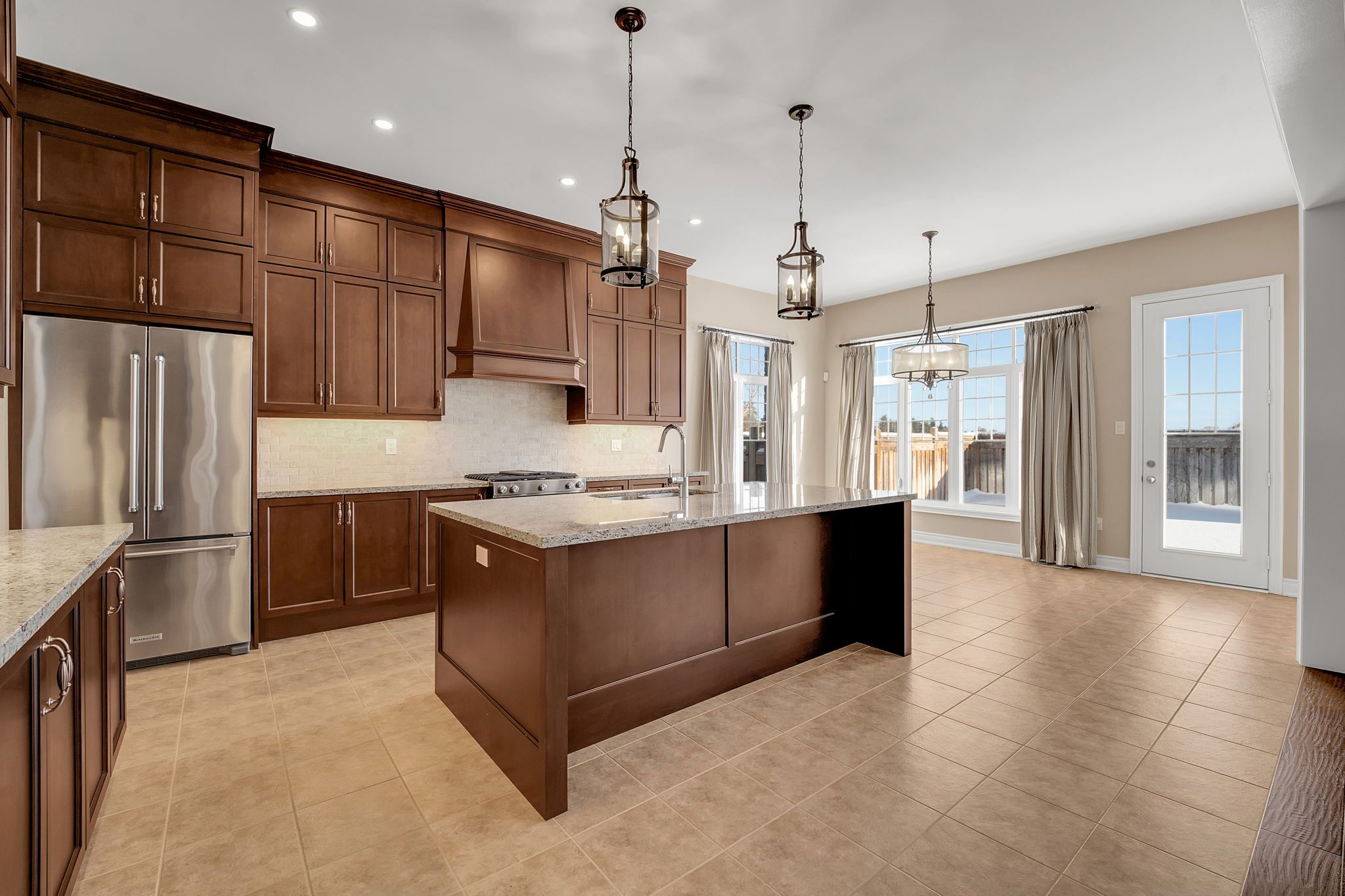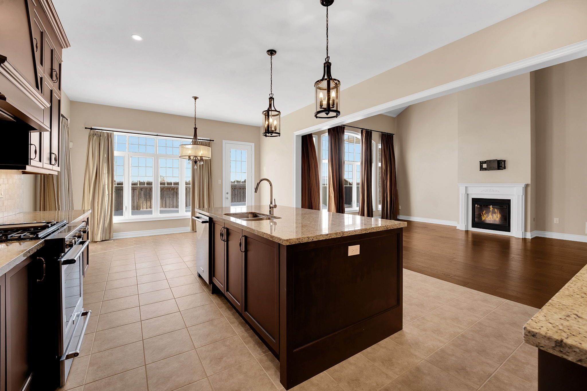 • Dramatic family room features a high ceiling and gas fireplace.