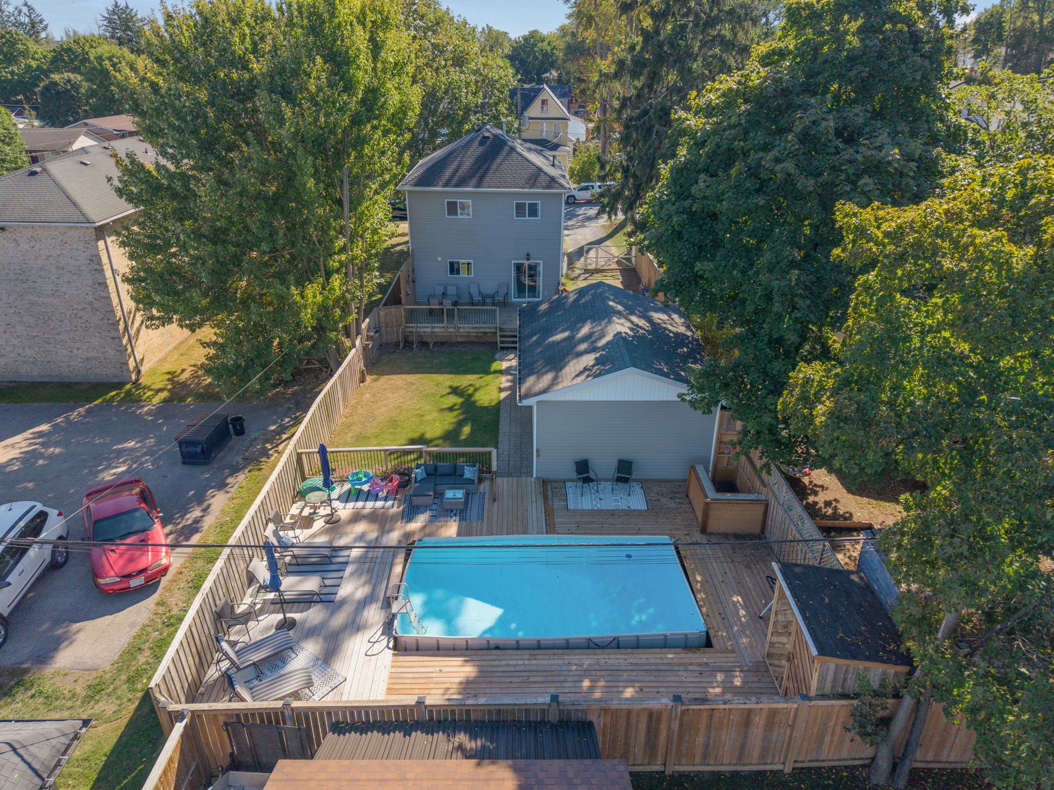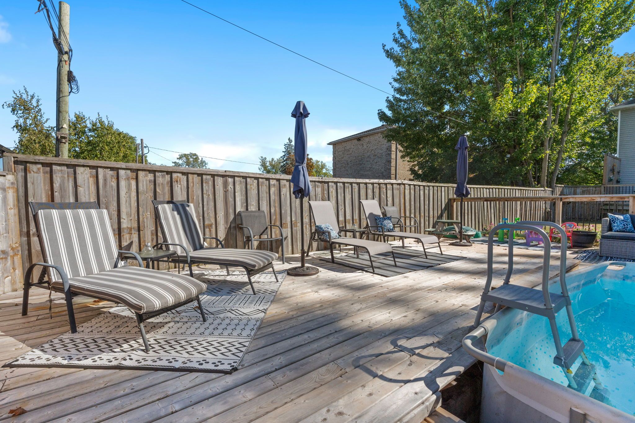 • Large fenced yard with a deck and above-ground pool for relaxation.