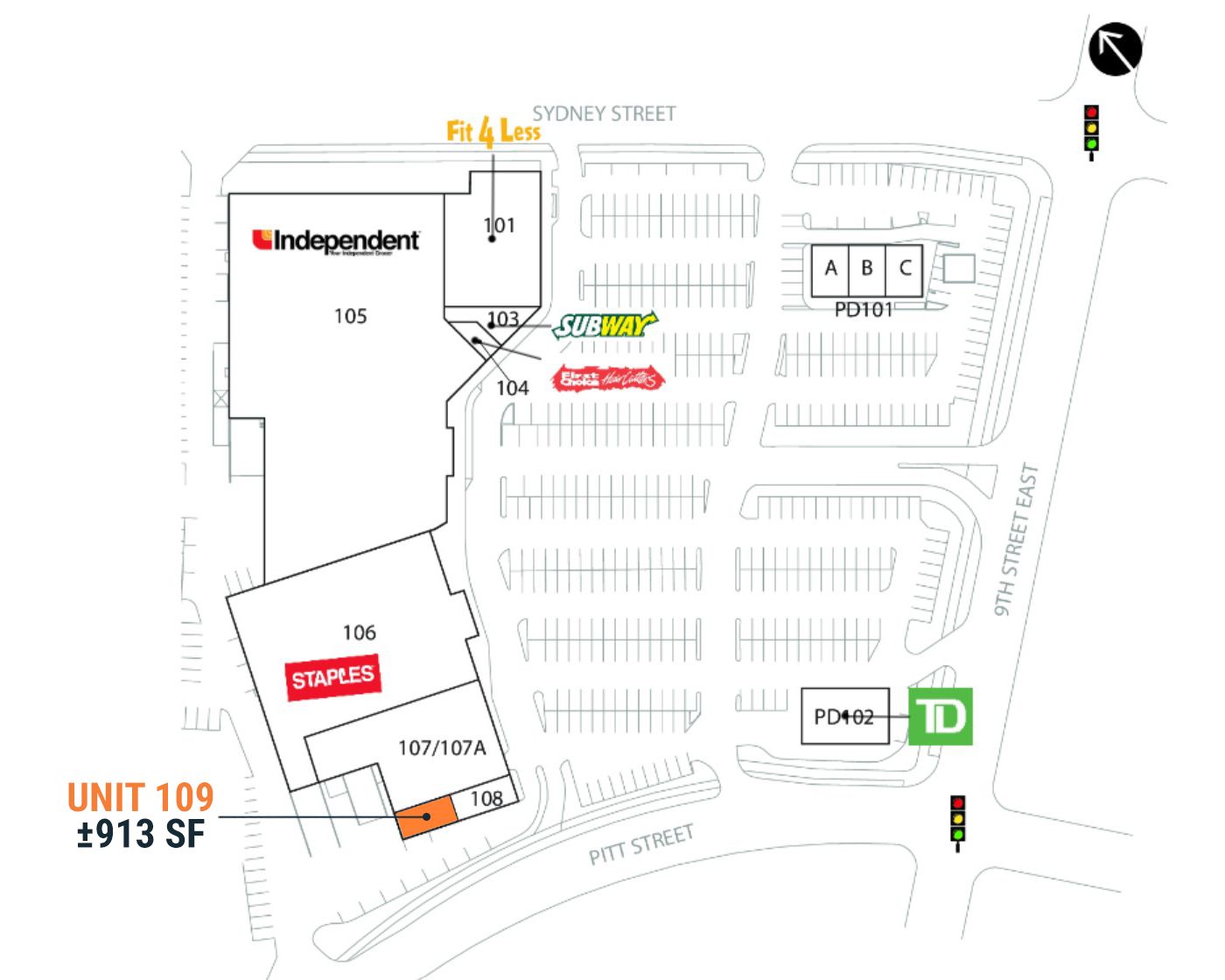 Endcap retail space available in a grocery-anchored centre at 31 ninth street east in cornwall. This 913 sf unit is positioned alongside national and regional retailers including your independent grocer, jean coutu, staples, td bank, subway, and barburrito. The site experiences over 14,740 vehicles daily at ninth street east & sydney street, offers ample on-site parking, and is surrounded by strong neighbourhood demographics. Available immediately, this location provides excellent exposure in one of cornwall's busiest retail corridors.