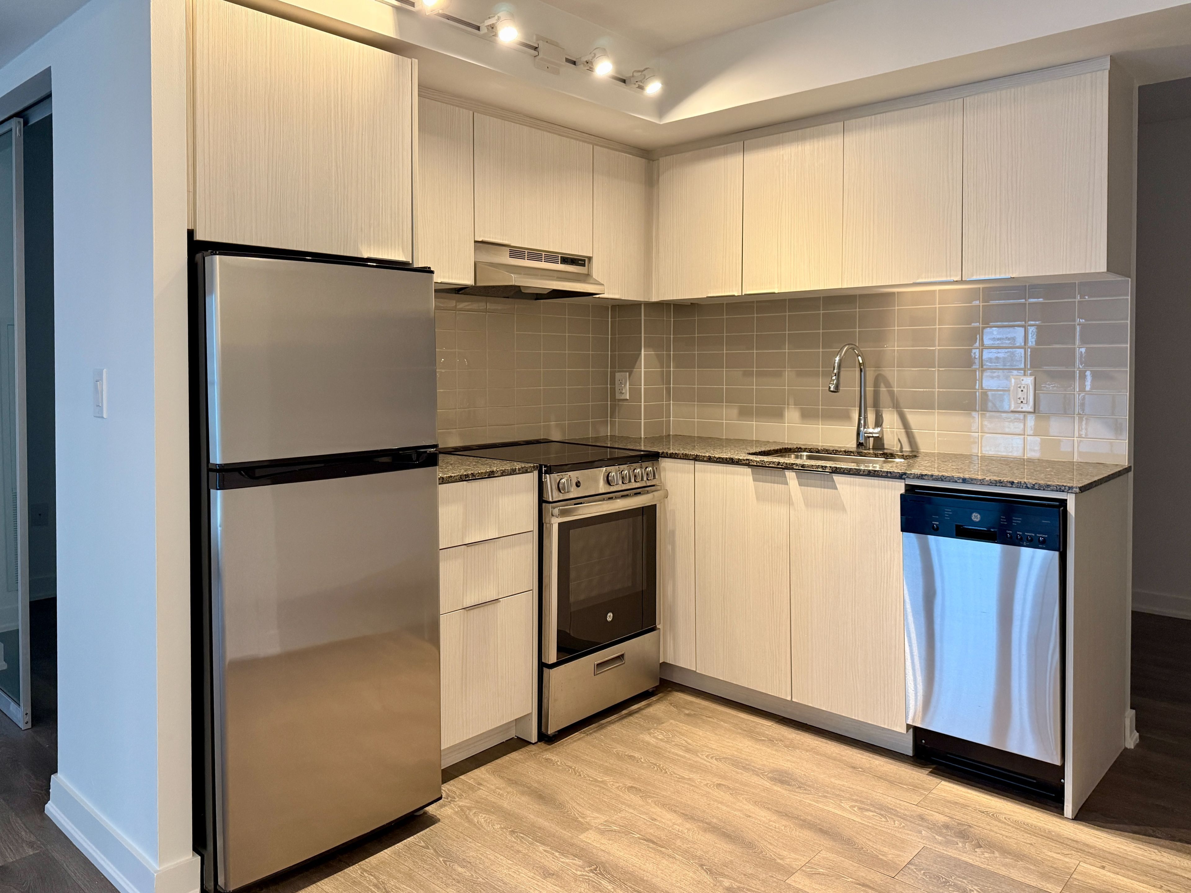 • Modern kitchen features stainless steel appliances and granite countertops.