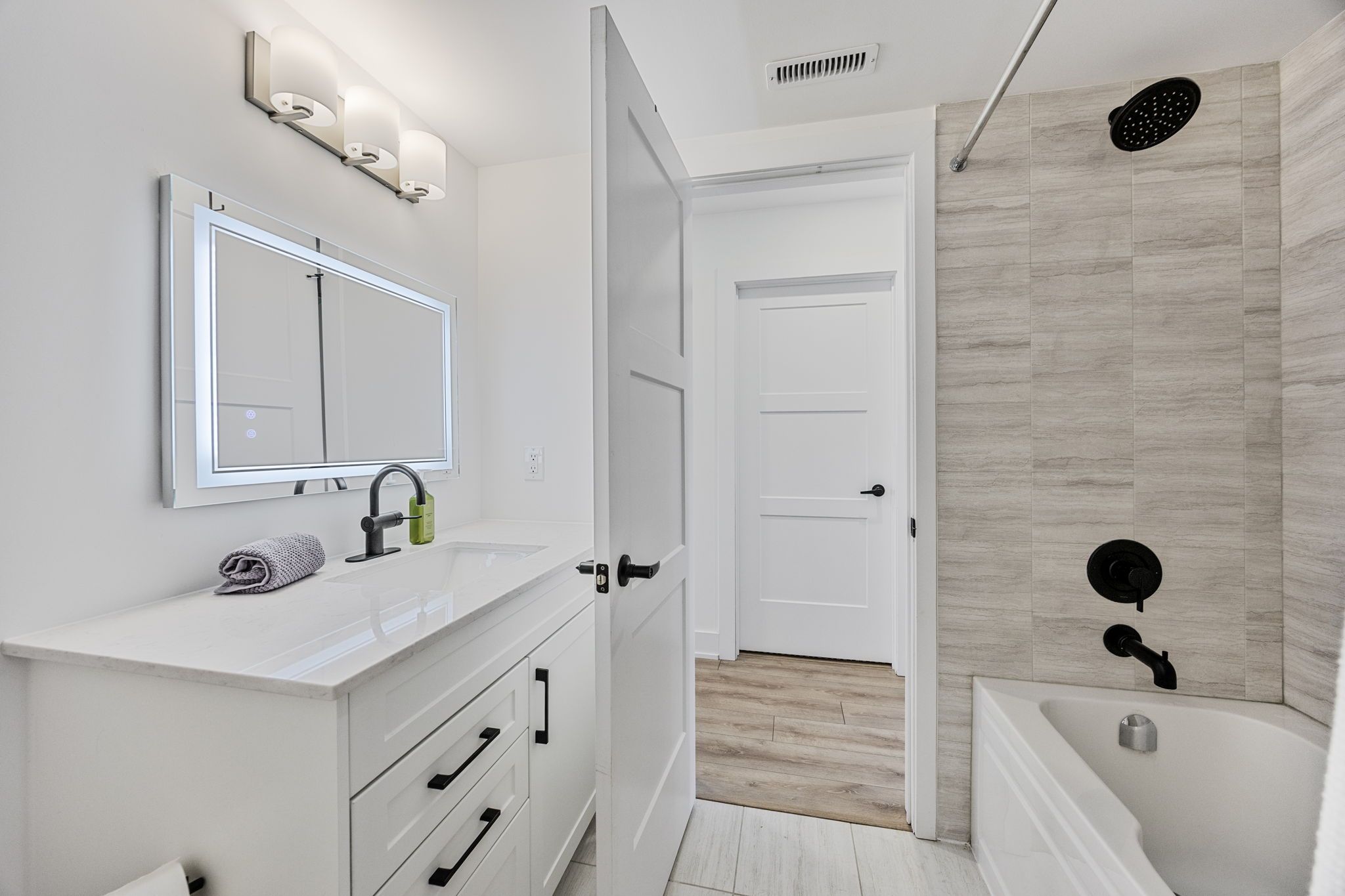 • Oversized kitchen with modern amenities and a stunning quartz island.