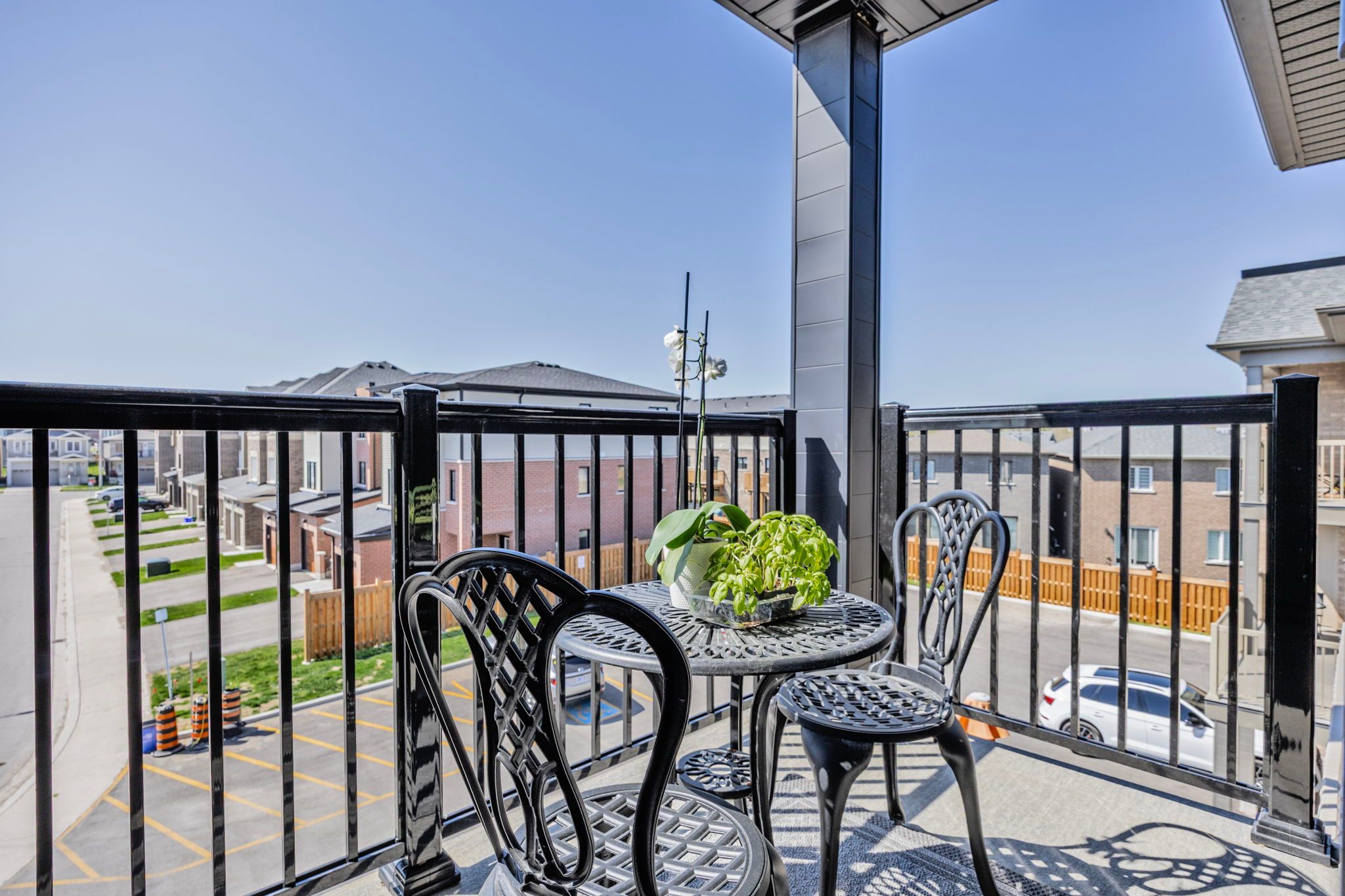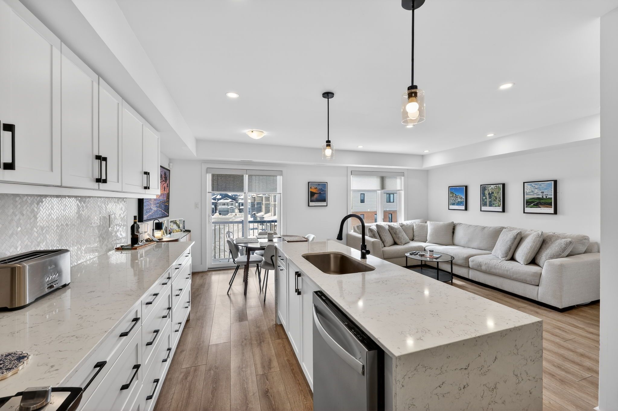 Stylishly upgraded condo townhome in barrie's desirable southeast end. Step into this beautifully upgraded condo-townhome that seamlessly blends modern design with practical living. No detail was overlooked & no expense sparred featuring an oversized kitchen outfitted with white shaker-style cabinetry, soft-close doors, sleek black hardware, upgraded black faucets, under-cabinet lighting, and a premium stainless steel appliance package. The show stopping oversized island boasts quartz waterfall countertops, perfect for entertaining. Enjoy open-concept living with pot lights and high-end vinyl flooring throughout. The spacious living room is flooded with natural light from large south-facing windows, complemented by 'hunter-douglas' automatic blinds and a generous balcony ideal for bbqs and soaking in the sunshine. You'll find three spacious bedrooms, all with upgraded closet doors, black hardware, and continued vinyl flooring. The primary retreat includes a walk-in closet and a beautifully finished 3-piece ensuite with a glass walk-in shower and quartz vanity. The two additional bedrooms share a modern 4-piece bathroom, also with quartz countertops. Additional highlights include a 1-car garage with inside entry and an automatic door opener, a dedicated outdoor area with potential for a private fenced yard, and visitor parking for guests. Conveniently located near park place, friday harbour, beaches, top-rated schools, golf courses, and everyday amenities. Also easy access to go-train & highway 400 for commuters or going to the gta for more entertainment.