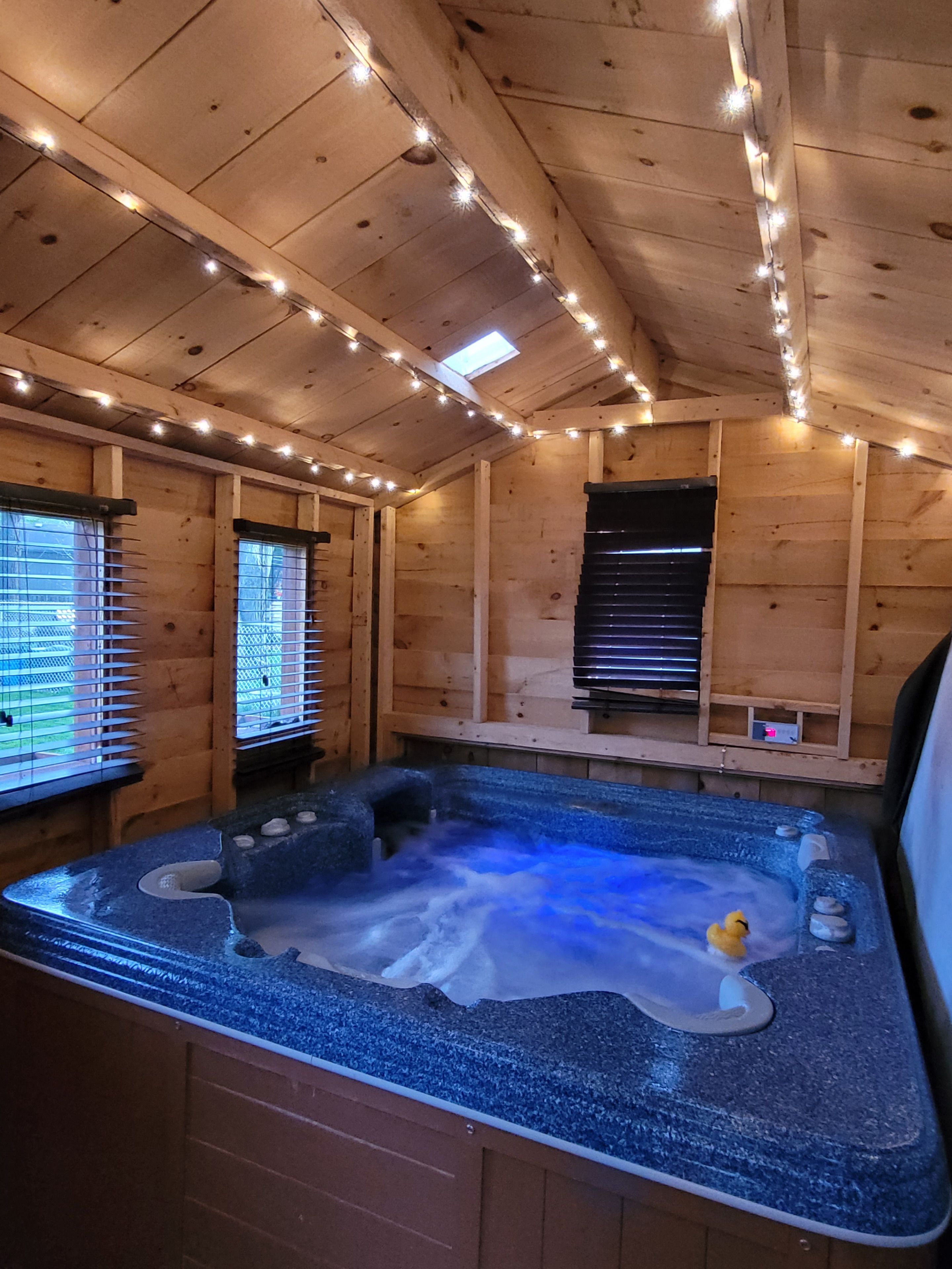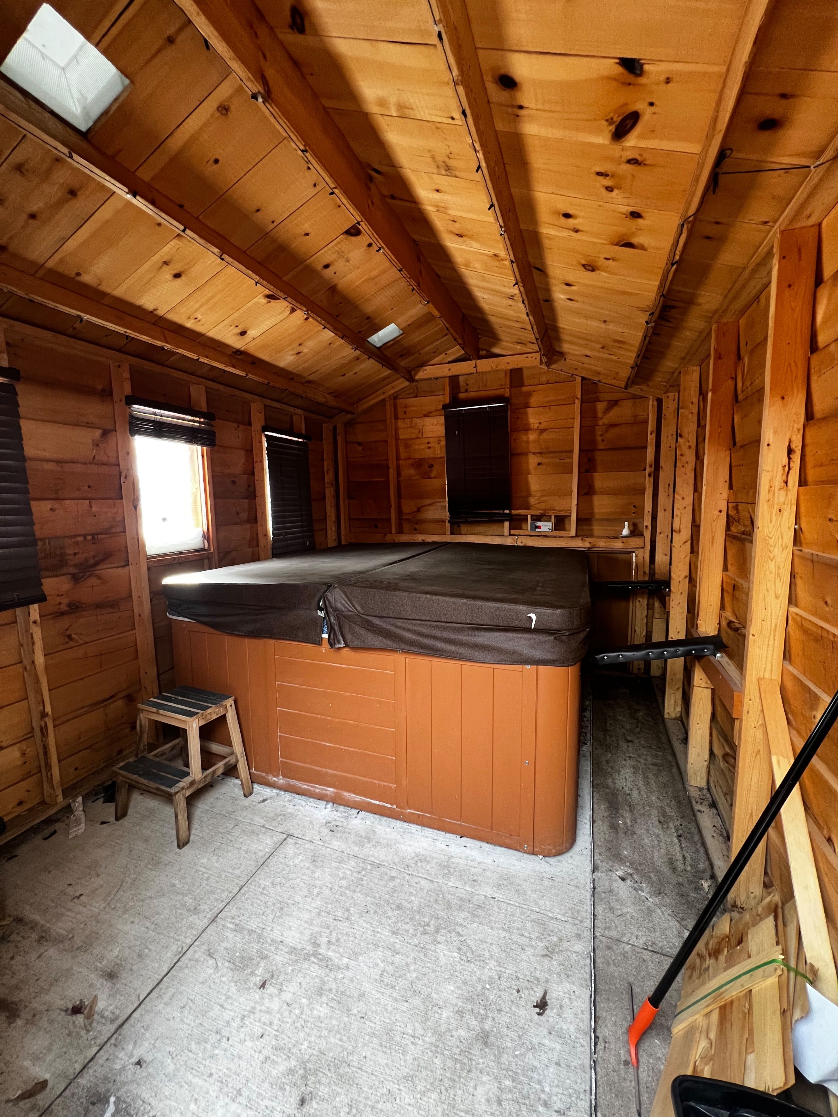 • Private outdoor space with enclosed hot tub and garden shed.