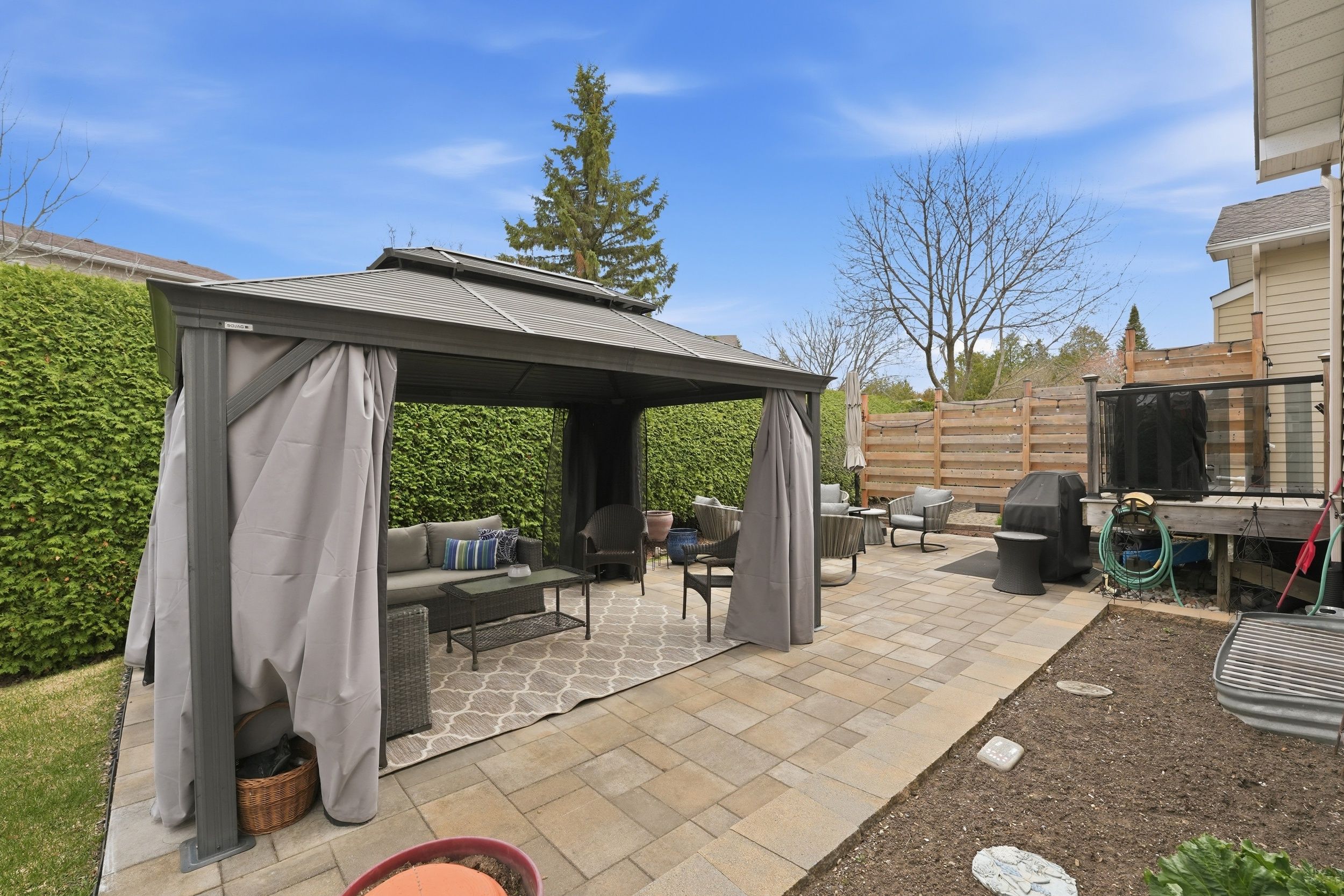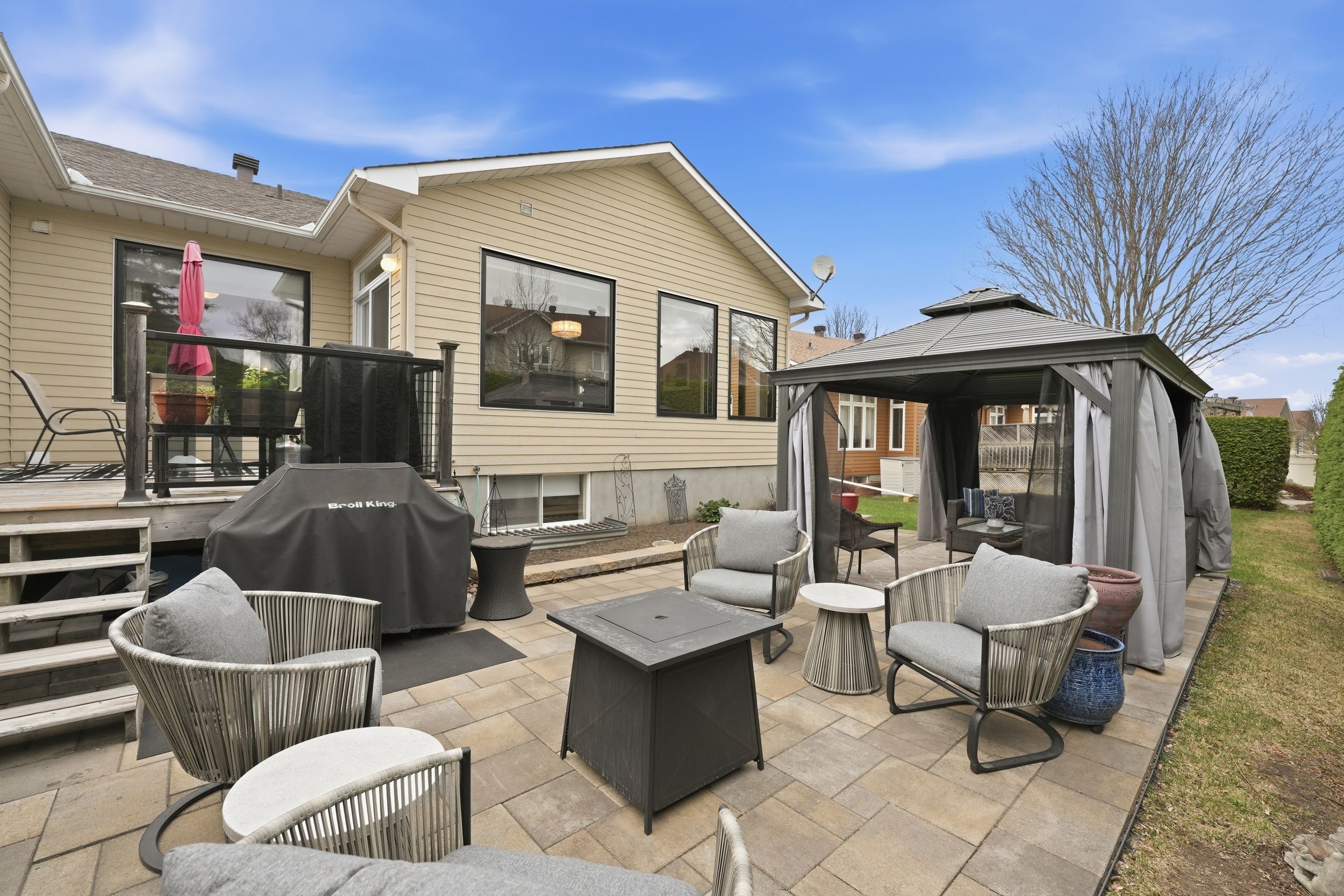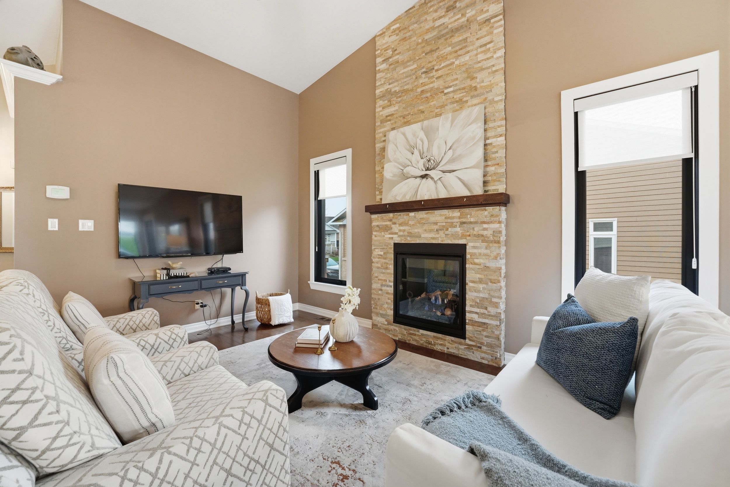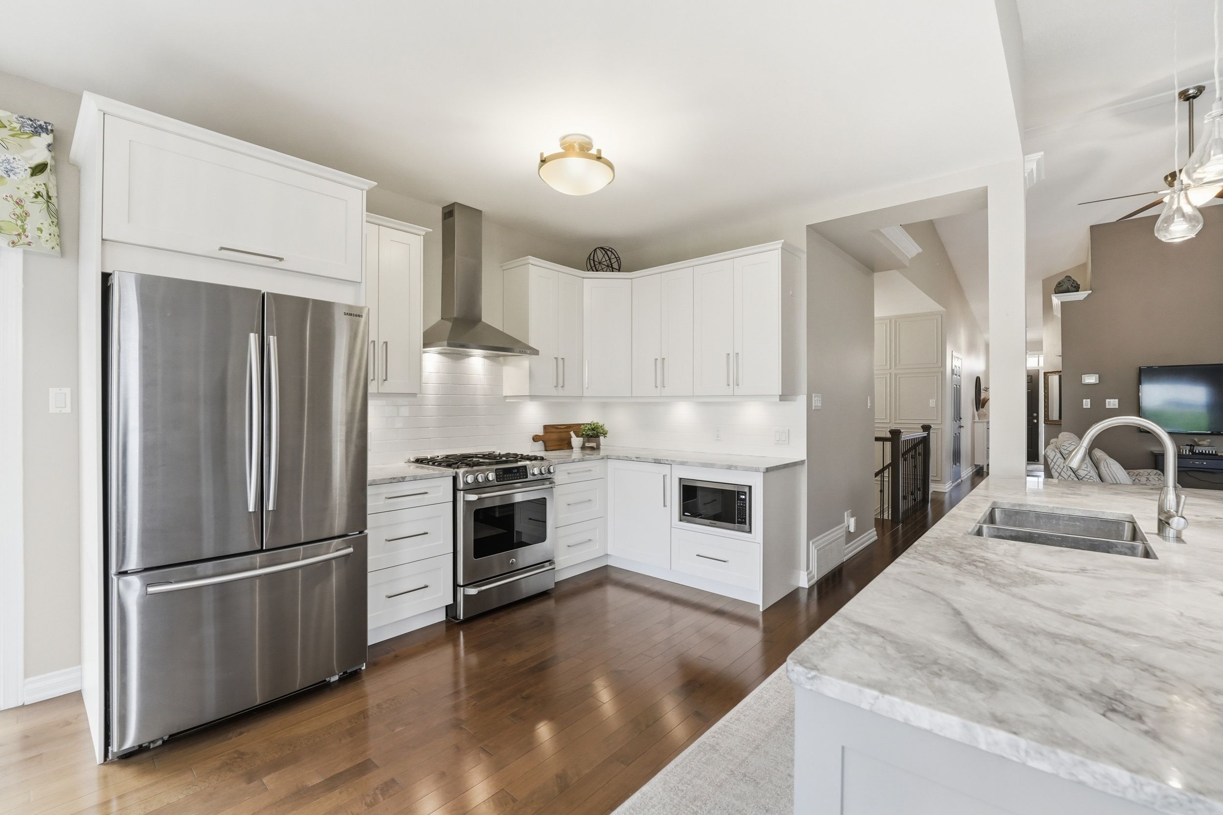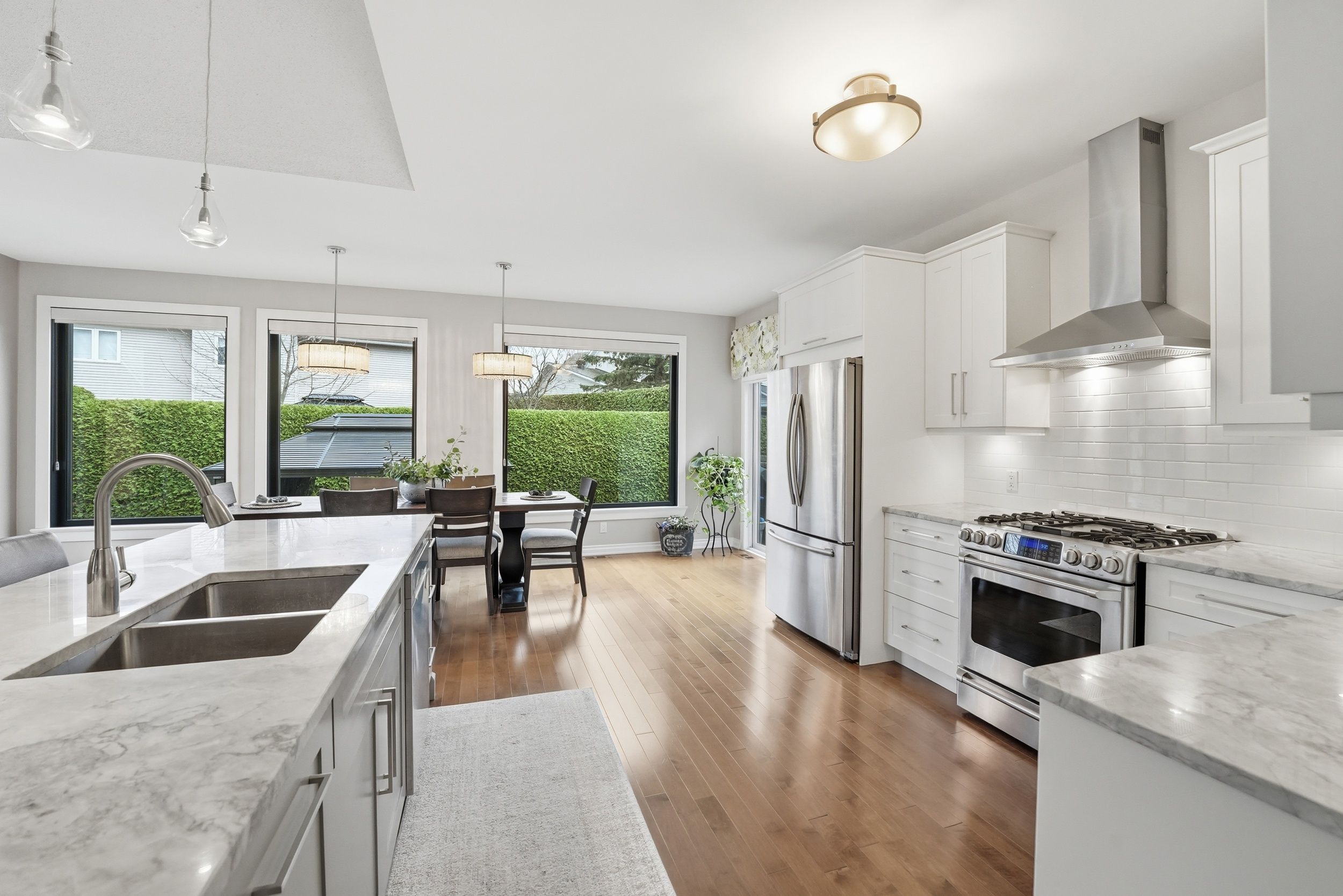 Welcome to 31 sable run, a beautifully renovated holitzner end-unit bungalow with a double car garage, located in the highly sought-after crossing bridge community in stittsville. This 3-bedroom, 3 full bathroom home has been meticulously maintained by its owners-and it shows. Stunning hardwood flooring welcomes you through the main level, where you'll find a front bedroom or office alongside a full bathroom with a stand up glass shower. The main level features an open-concept layout with vaulted ceilings and striking black-framed picture windows that truly take your breath away. The living room showcases a beautiful fireplace feature, with stone extending up to the high ceilings and mantle, creating a warm focal point. The laurysen kitchen is fit for a chef, complete with an oversized island with breakfast bar seating, extra storage, marble countertops, stainless steel appliances, a built-in microwave, and an open hood range. It overlooks a large dining space with surrounding views of the yard and mature hedges. New patio doors lead to the deck and finished interlock area, perfect for all your entertaining needs! The primary bedroom offers ample space to accommodate any furniture setup and features double walk-in closets and ensuite. The renovated ensuite includes a larger tub insert and a linen closet, completing this comfortable retreat. An accent stairwell leads to the lower level, which does not disappoint, featuring a spacious rec room with high ceilings and an oversized bedroom or secondary rec space. A third finished room provides extra finished storage area, along with a walk-in laundry room and a full bathroom with a stand-up shower. Located close to walking trails, parks, shopping, recreation, and highway access, this home is in the perfect location. 24hrs irrevocable on offers as per form 244