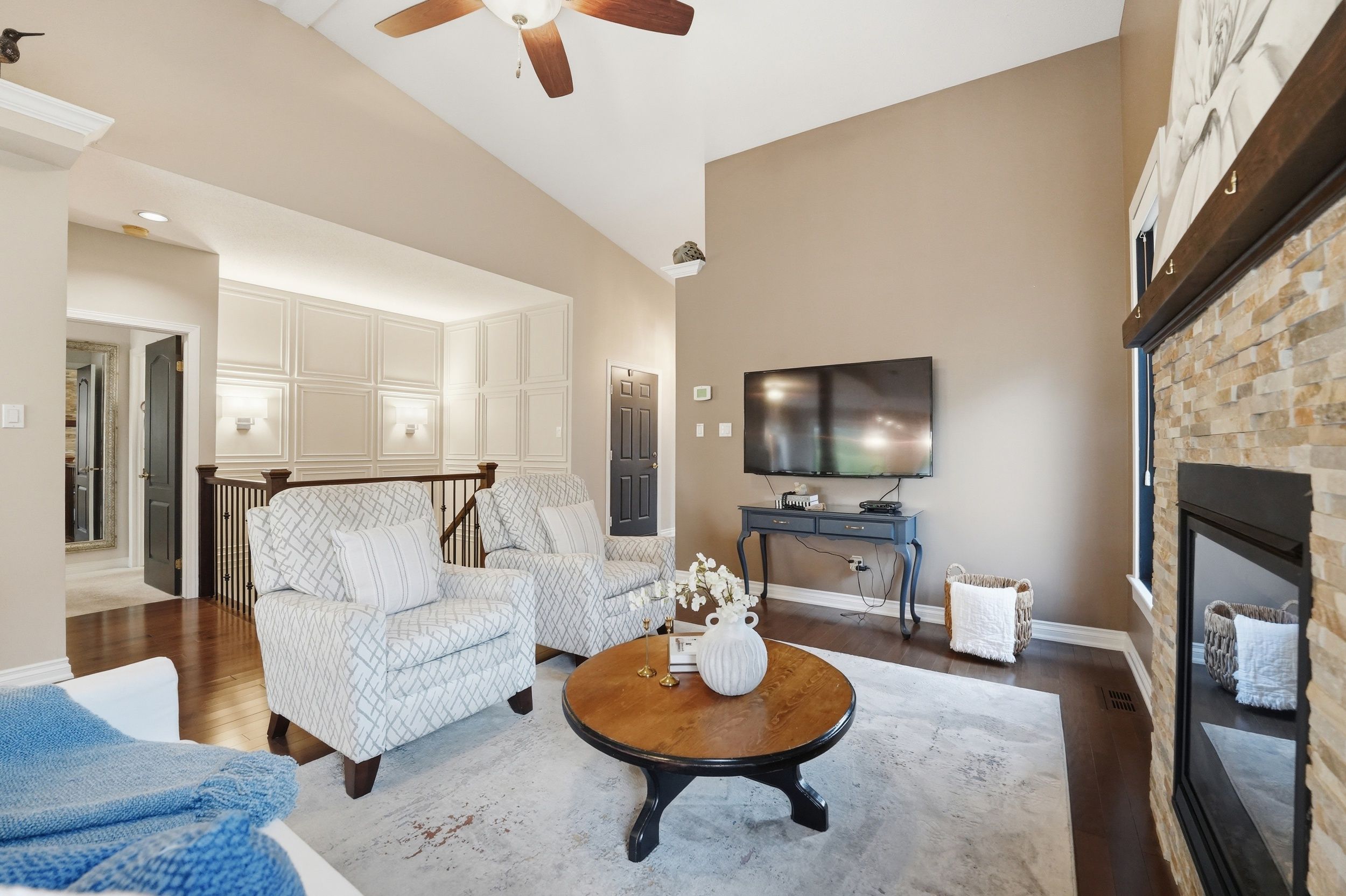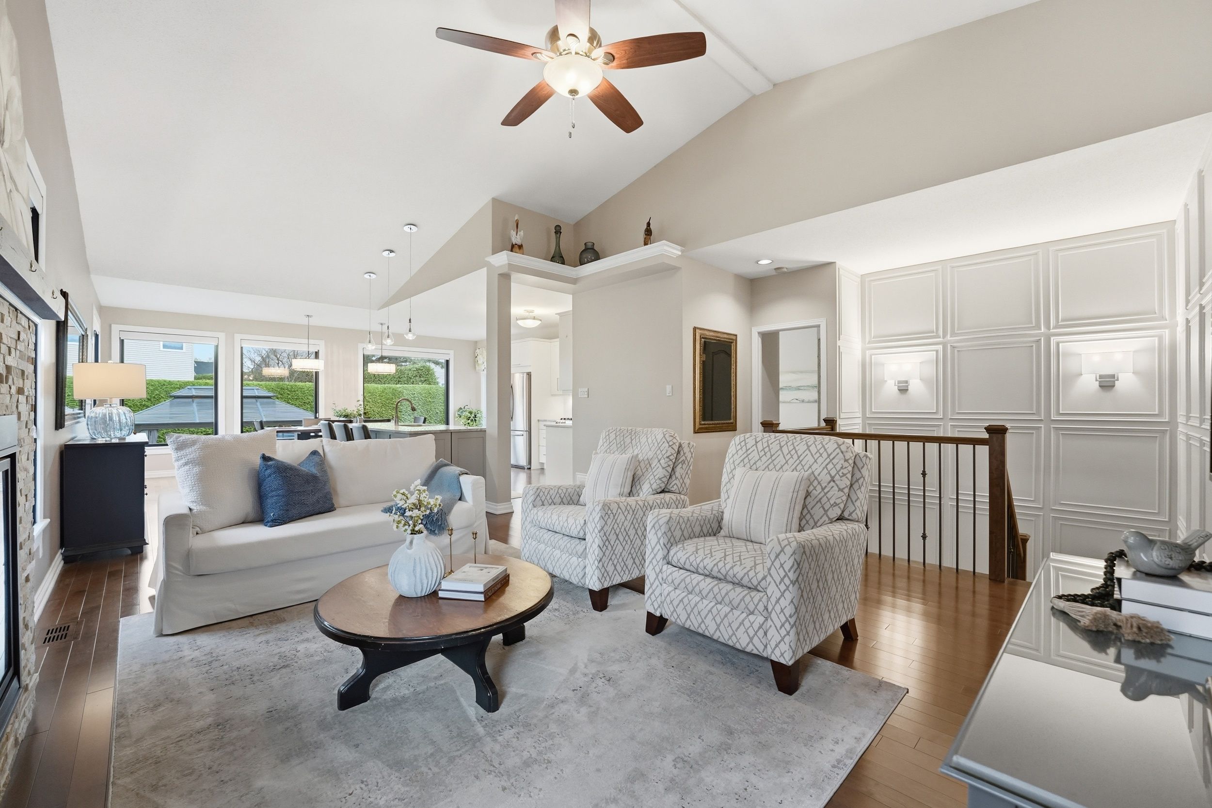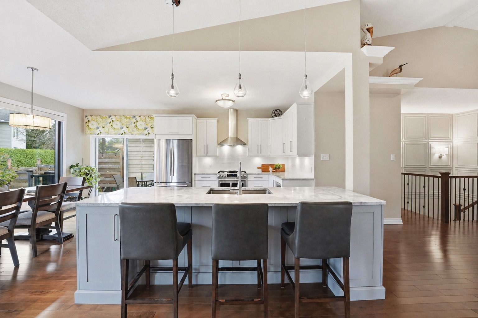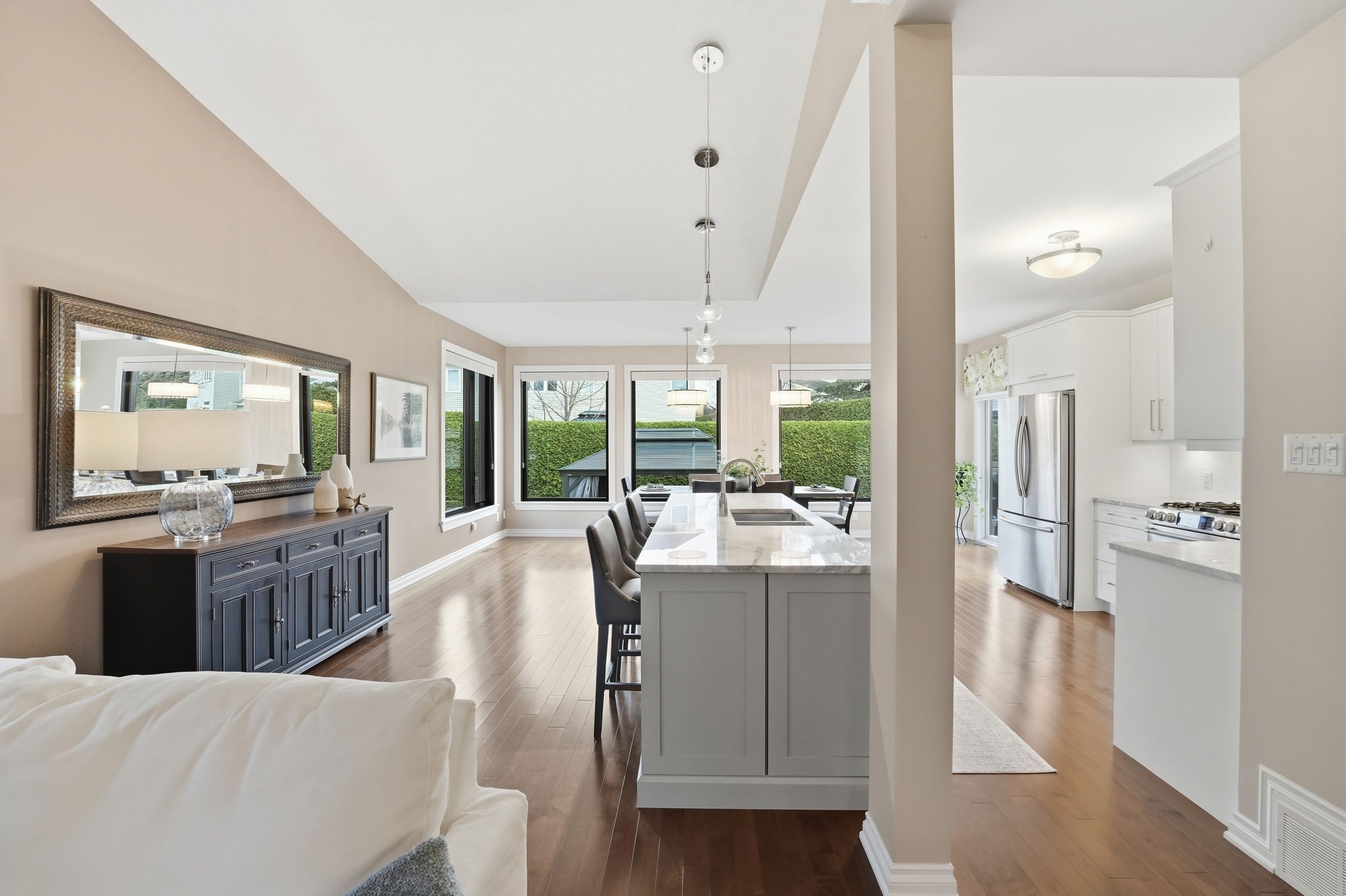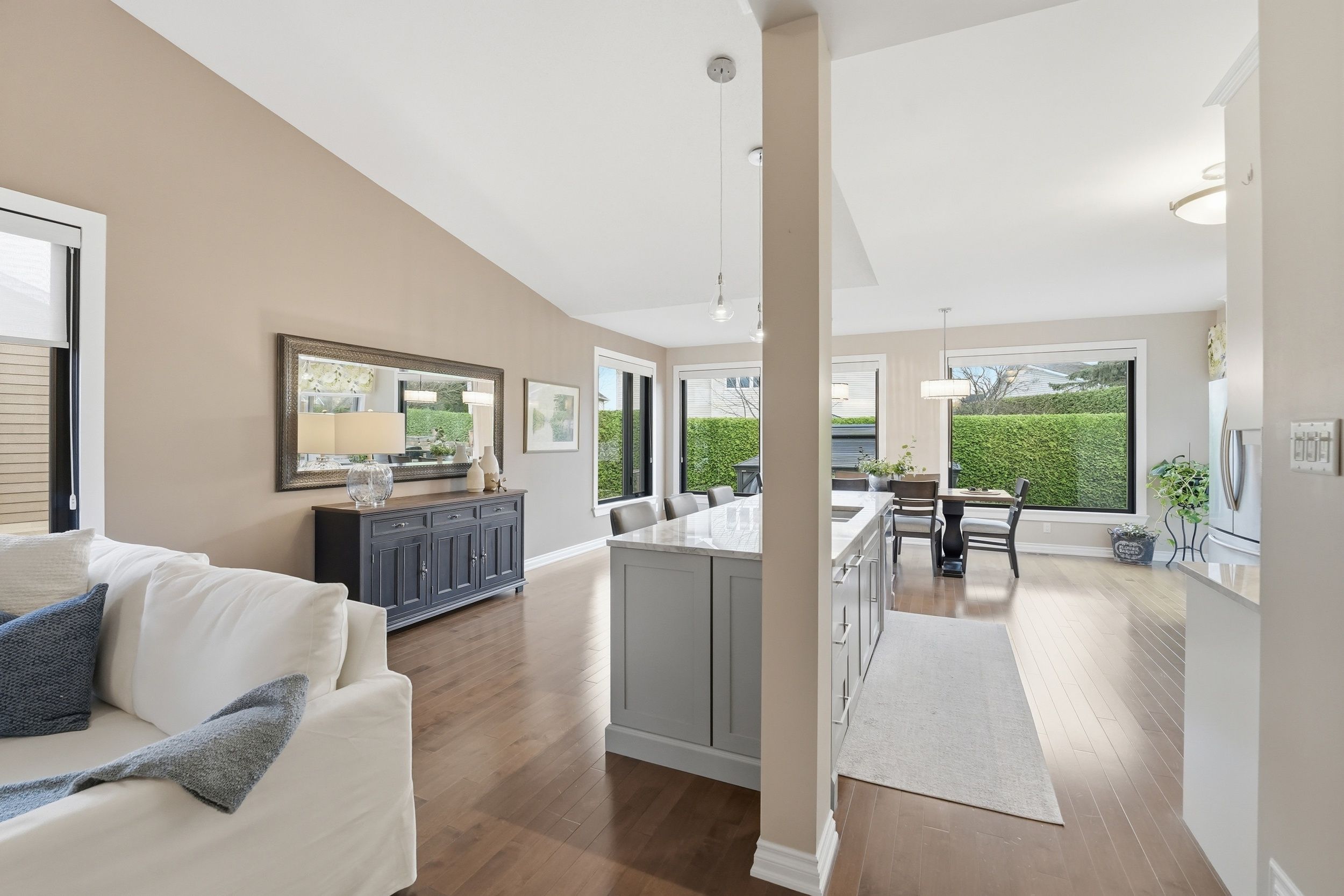• Light-filled open-concept main level with beautiful hardwood floors and vaulted ceilings.