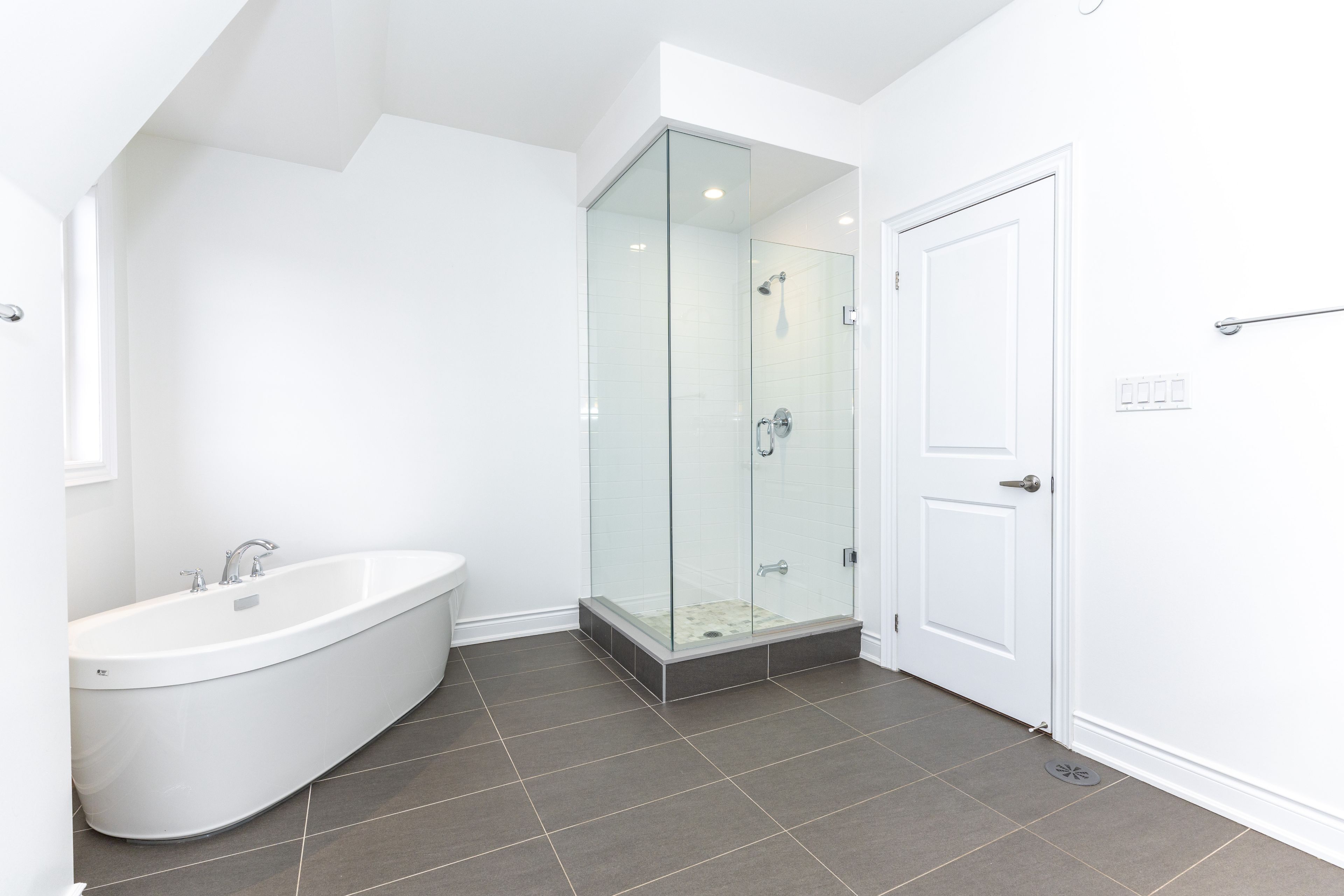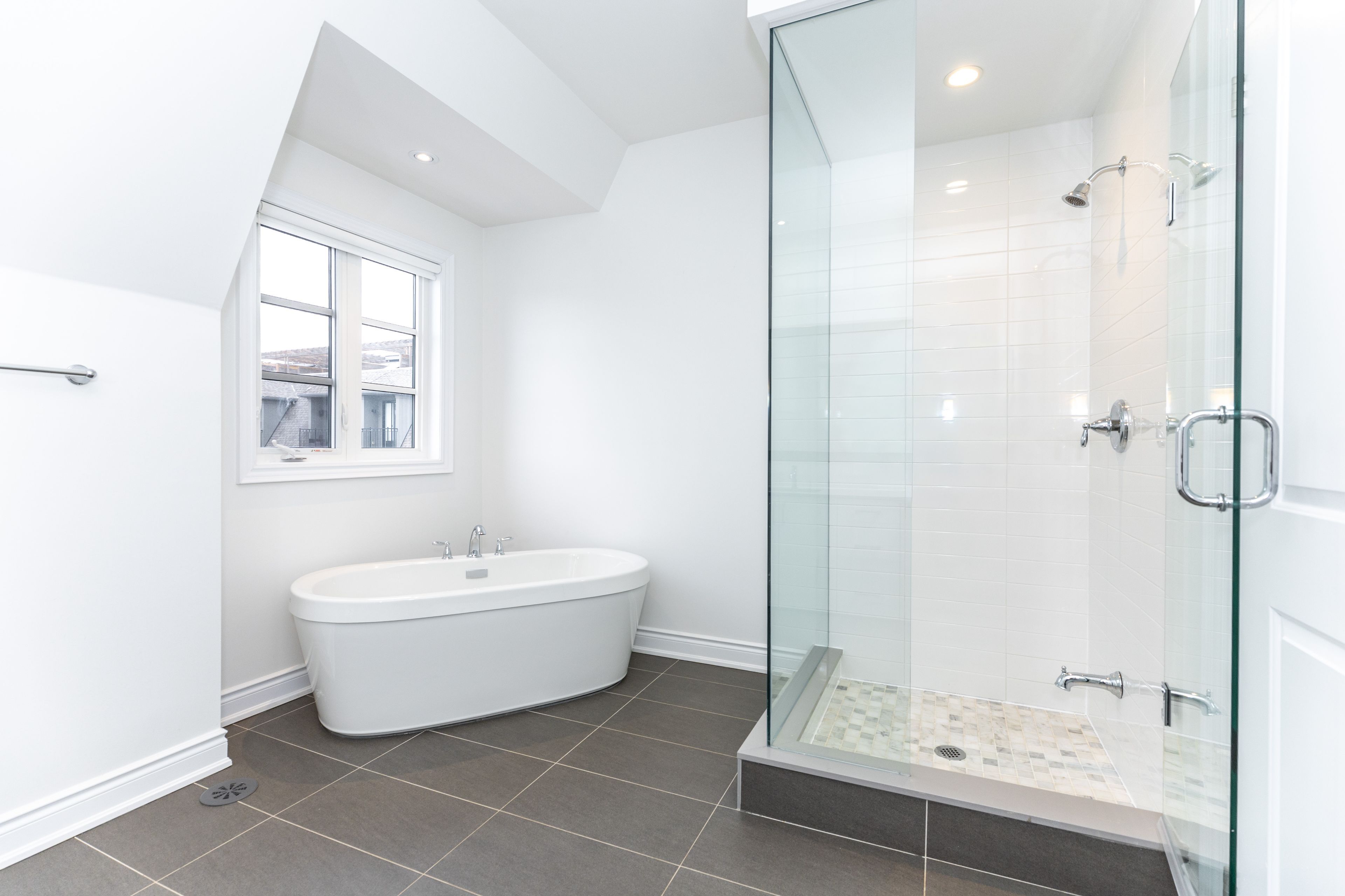 • Master ensuite features double sinks, soaker tub, and frameless shower.