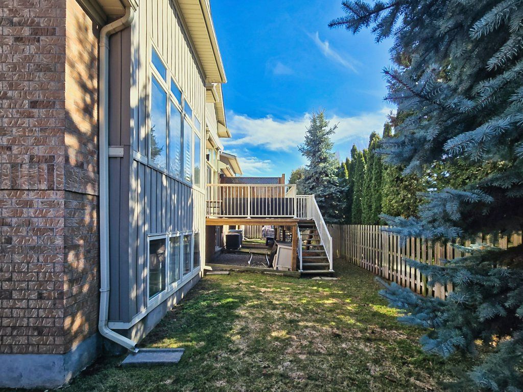 Welcome to prestigious cobblestone gates, an upscale townhome community in the martindale area, backing onto the twelve mile creek corridor. This well maintained end unit has a double concrete driveway with attached double car garage and electric opener. Mature landscaping with private backyard area and side deck, lawn irrigation system. Grand pillars and covered entrance invite you to a spacious tiled foyer, 2-piece powder room and garage access. The bright open concept great room/kitchen, boasts soaring vaulted ceilings with cove molding and pot lights, built in cabinetry, gas fireplace, rich hardwood flooring, garden doors to deck, california shutters, dining area, custom dovetailed maple kitchen cabinets, blue granite countertops, island and counter lighting. The master bedroom has hardwood floors, 4-piece ensuite, separate shower and air tub, walk in closet plus a secondary closet with rough in for laundry. Laundry chute to lower level. Lower level has high ceilings plus 2 finished bedrooms and walk in closets, storage room, shelving, laundry room, 3-piece with sit down shower, sump pump, alarm system, fag, ca, cv. Enjoy this carefree living with exterior maintenance handled for you. Surrounded by nature, walking trails, the merritt trail and only minutes to the city center, restaurants, new hospital, performing arts center, qew, 406 hwy easy access and all amenities.