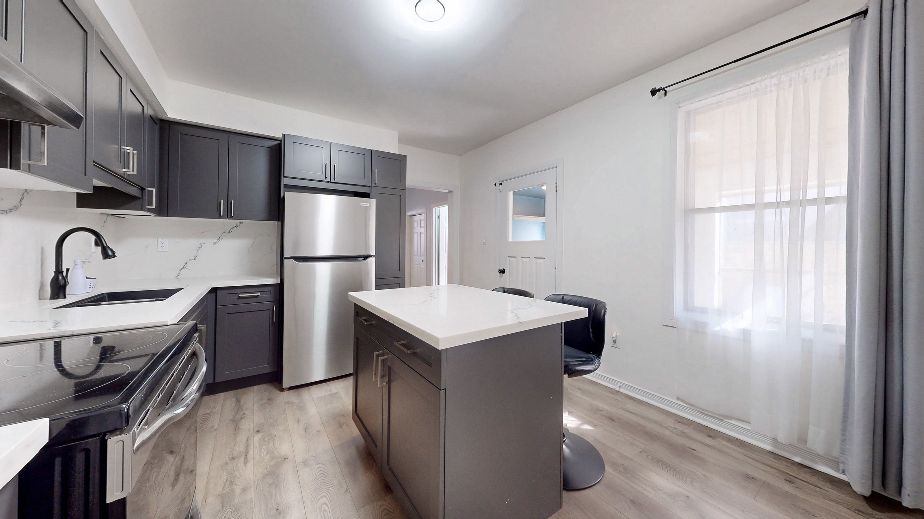 • Updated kitchen with sleek cabinetry and contemporary appliances.