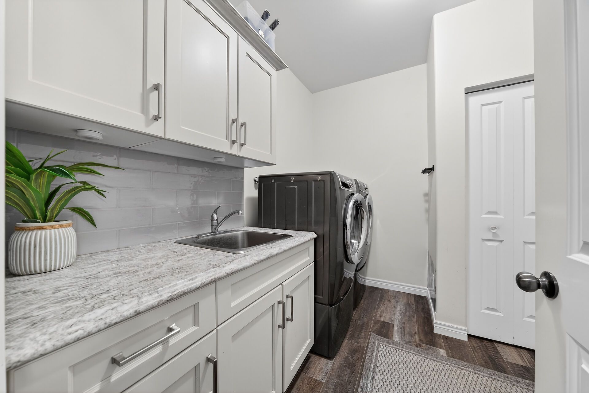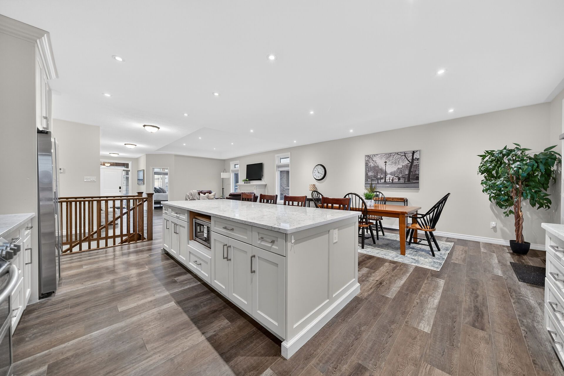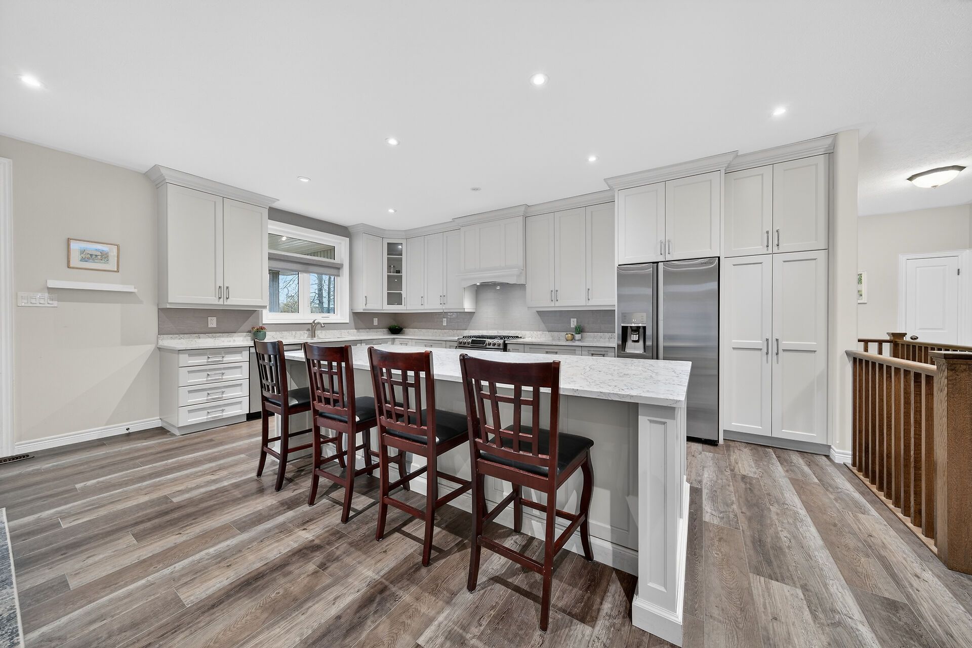 • Chef's kitchen equipped with quartz countertops and stainless steel appliances.