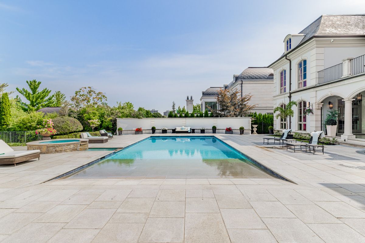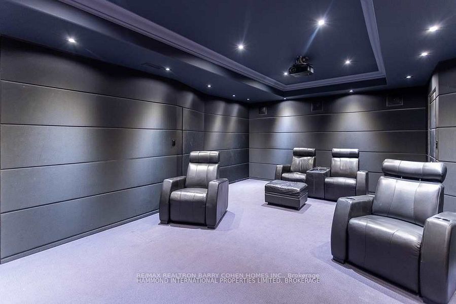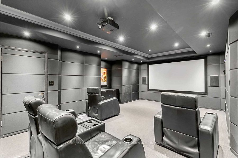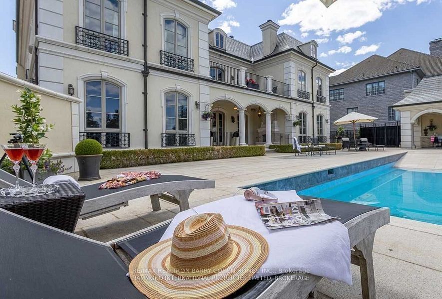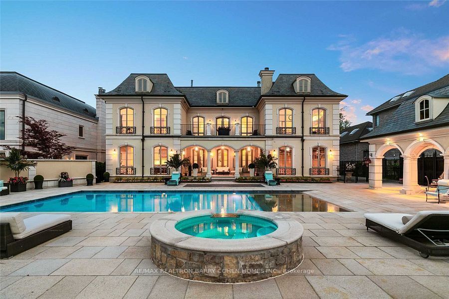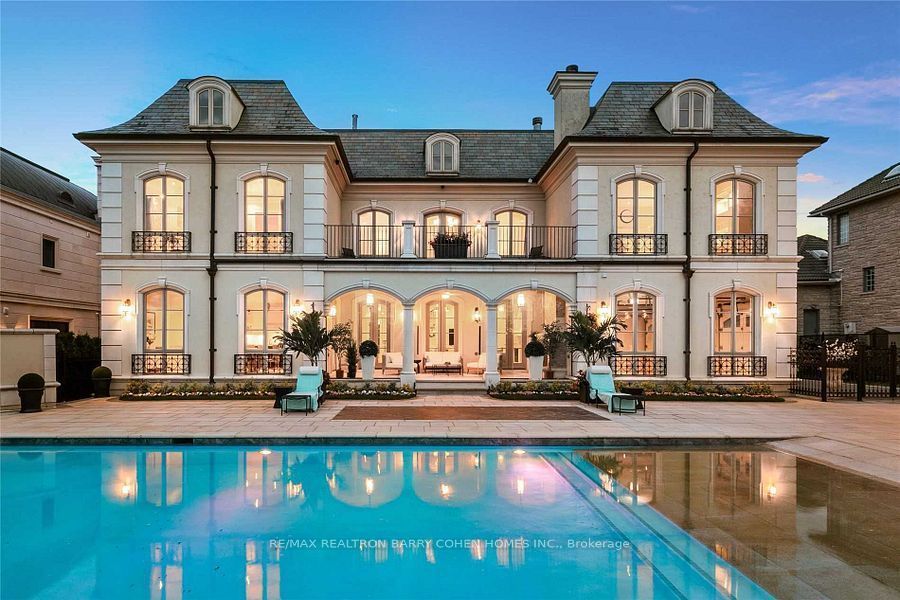 This sprawling, classically designed mansion has a gated front entrance to a circular courtyard with formal gardens with over 10,000 sq-ft liveable area combined "lower & upper levels" and lot size of 100 ft x 302 ft, back to the prestigious"thornhill golf club" professionally interior designed & furnished - 6+1 bedrooms,10 washrooms- showcasing a grand cathedral foyer, magestic archways and 11 ft & 10 ft ceilings with elevator, multiple walk-outs to terraces & enclosed- veranda overlook the backyard retreat & swimming pool oasis, professional landscaping, heated driveway and surrounding wrought iron fencing with an entrance gate, kitchen highlights include a hardwood floor, granite counters, a large centre island/breakfast bar with an integrated sink, a pantry, pot lights, a detailed decorative ceiling, custom backsplash, high-end stainless steel appliances, a built-in desk, arched windows, and a sliding door walkout to a covered patio. Off the kitchen is a covered outdoor loggia in italian with a wood-burning fireplace. The living room features a hardwood floor, crown moulding, a wood-burning fireplace with detailed plaster surround, a ceiling medallion and chandelier, and two arched double garden-door walkouts. In the dining room, highlights include a hardwood floor, a chandelier and two arched windows. The office features rich wood walls, a coffered wood ceiling, wall sconces, floor-to-ceiling built-in shelves, and two double-door walkouts to the front. The backyard has a covered patio, an inground pool, a three-piece bathroom, a cabana, an inground hot tub, a large lanai with a wood-burning fireplace, an outdoor kitchen with stainless steel appliances and a dining area, fountains, gardens, a potting shed, and lawn space. The lower level wine room, a 700-bottle wine cellar, features cabinetry, counter space, exposed brick walls and ceiling, a tile floor, a games room and a sound-proof movie theatre. 3 car garage and 12 parking spaces.