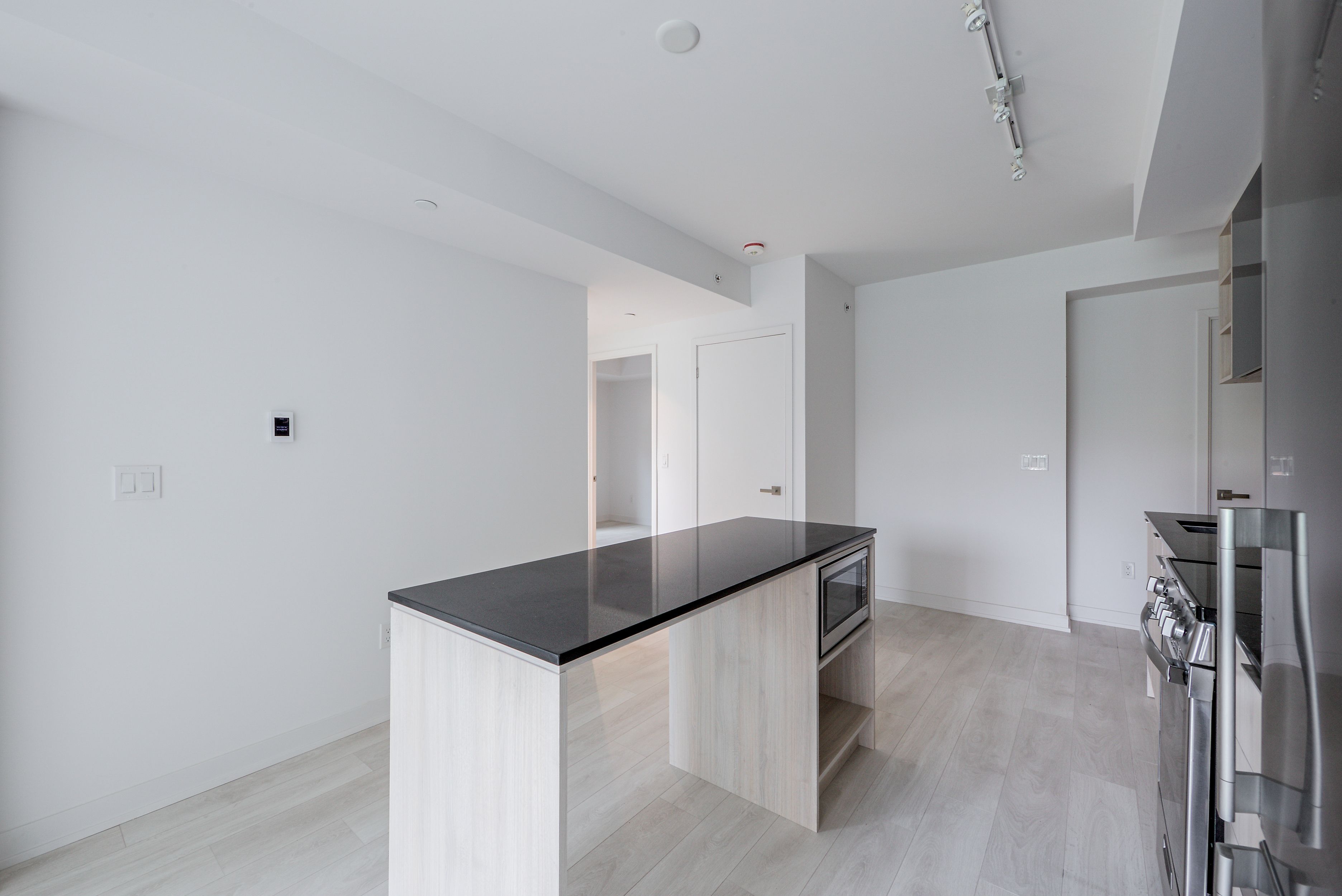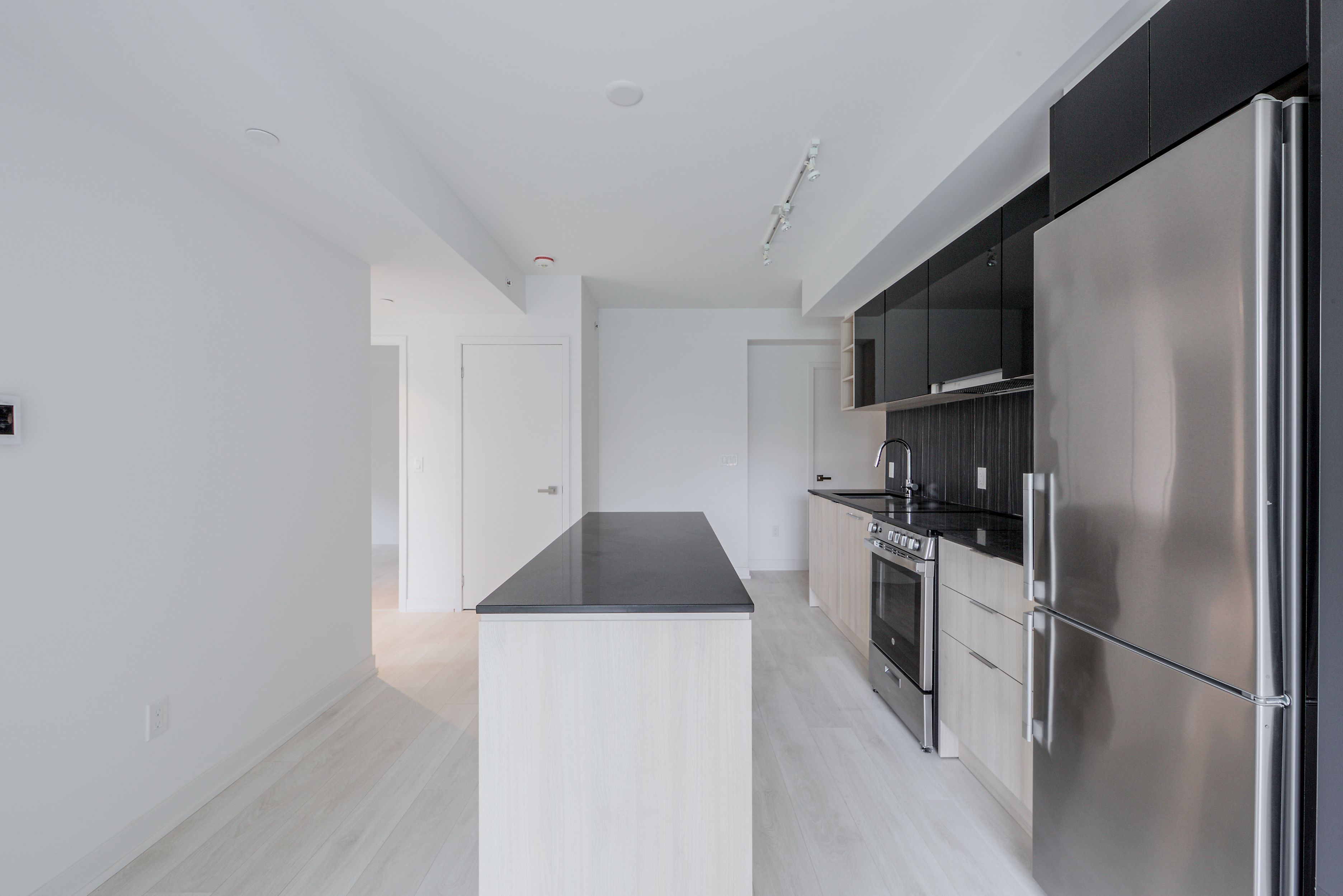 • Modern kitchen with large center island and stainless steel appliances.
