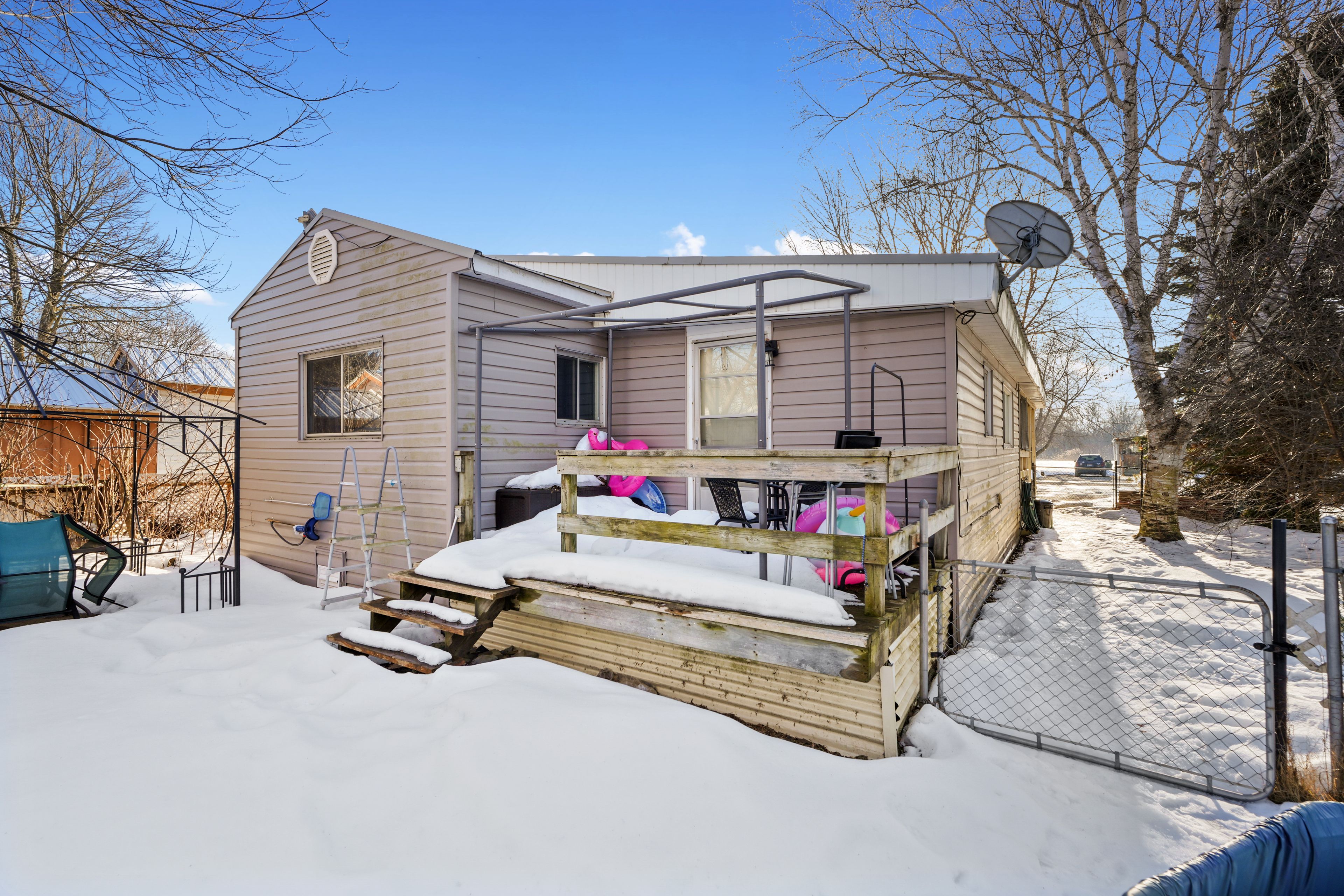 • Large covered deck and open deck overlooking a fenced yard.