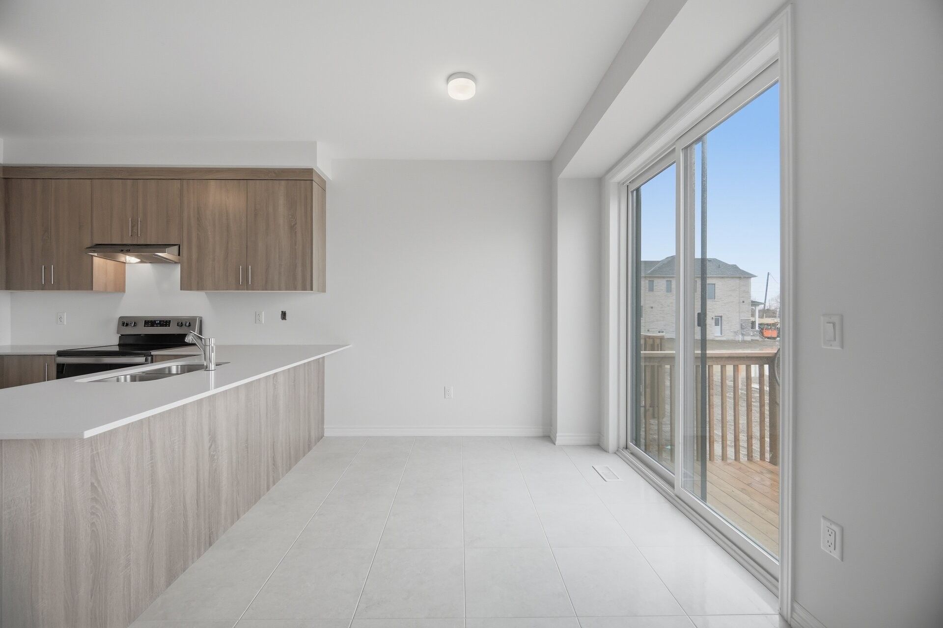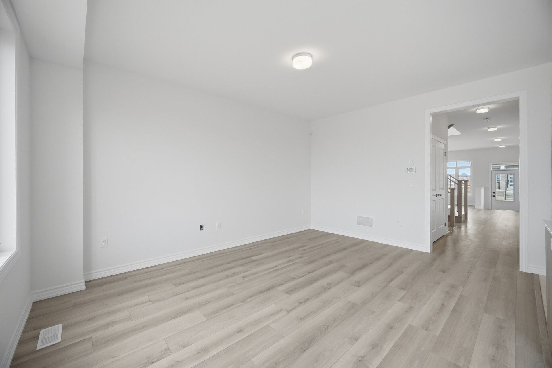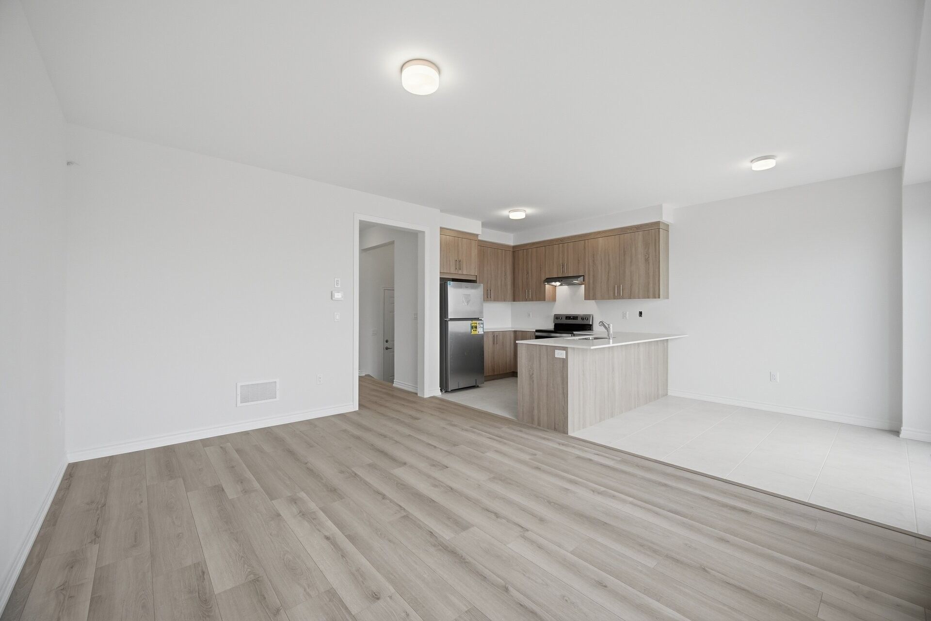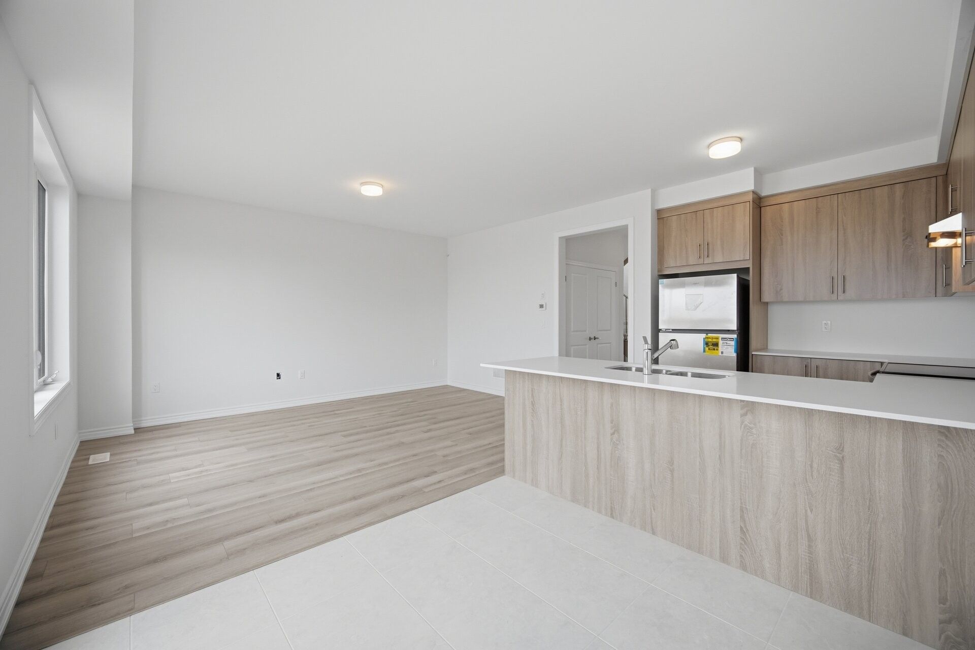 Aprx 2100 sq ft!! Welcome to this brand new never lived in modern style end unit freehold townhouse. Perfectly situated on 30 ft wide lot. Full of natural sunlight. The main floor showcases a bright open concept layout featuring a spacious family room along with combined living & dining room. Upgraded laminate flooring on the main floor paired with a matching oak staircase adds a modern touch. Upgraded kitchen is equipped with stainless steel appliances & breakfast area. Second floor offers 4 good size bedrooms & 2 full washrooms. Master bedroom with ensuite bath & walk-in closet. A rare opportunity to own a brand new end unit home combining modern design, functional layout & exceptional comfort.