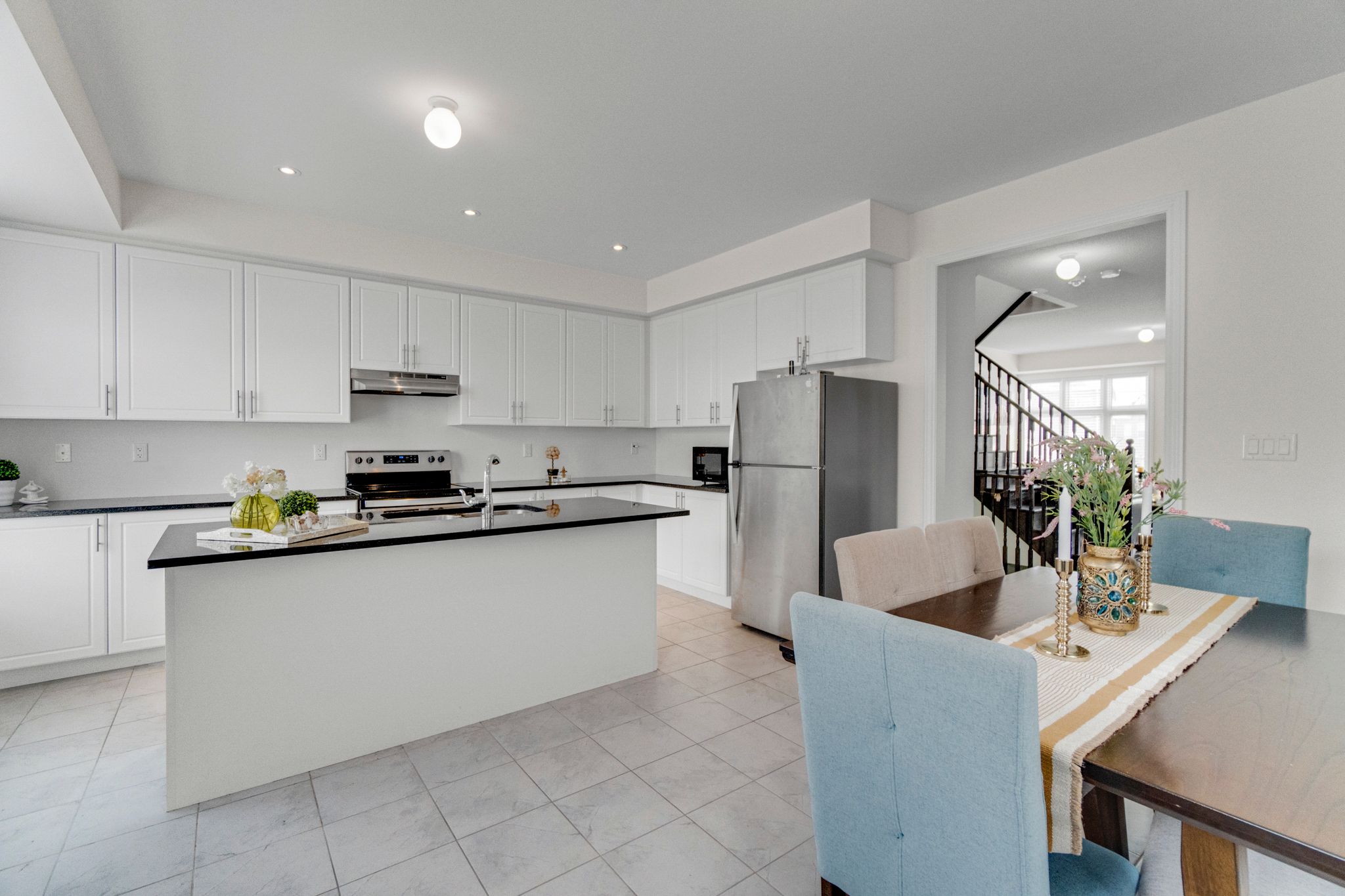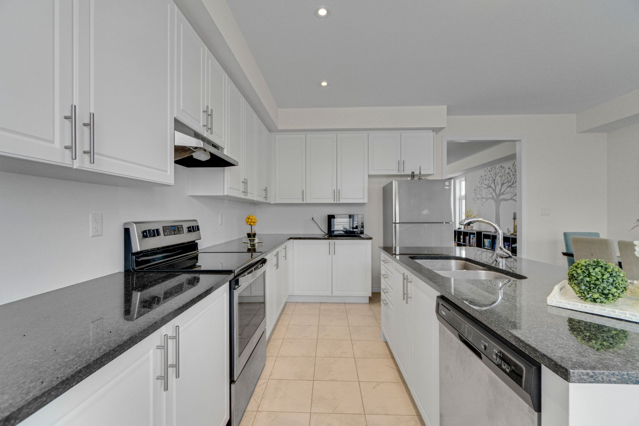 • Modern kitchen with granite countertops and stainless steel appliances.