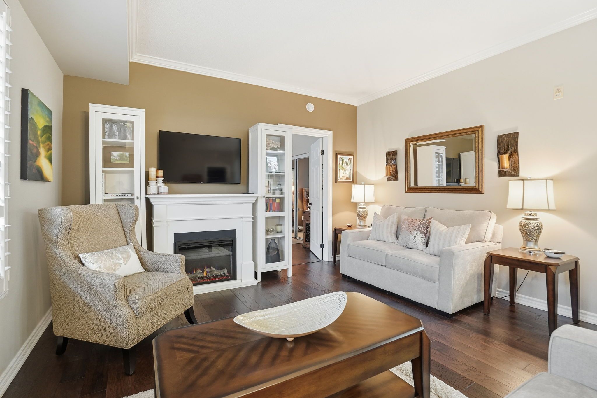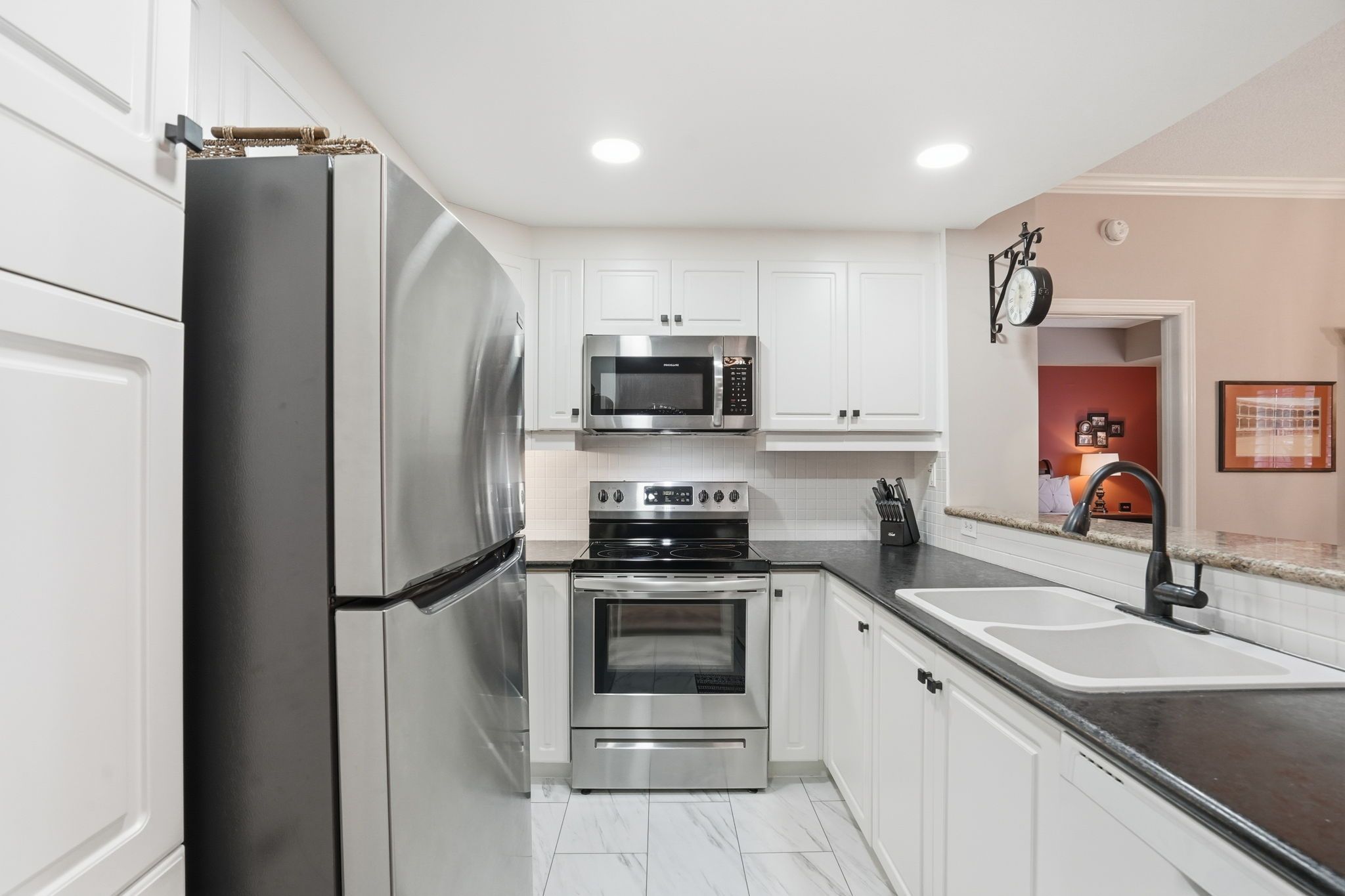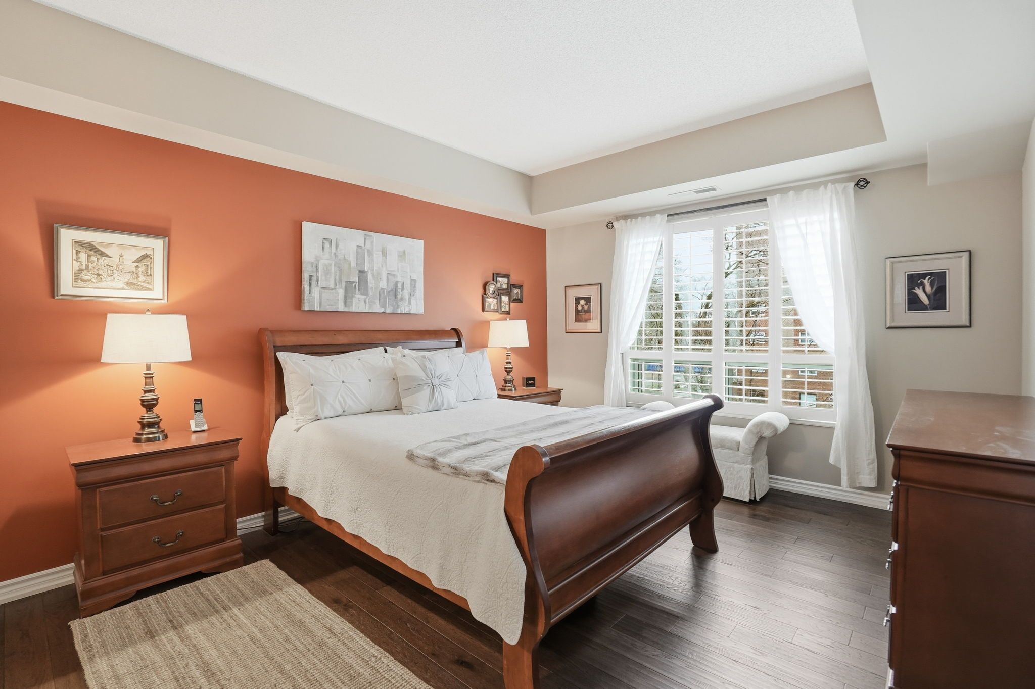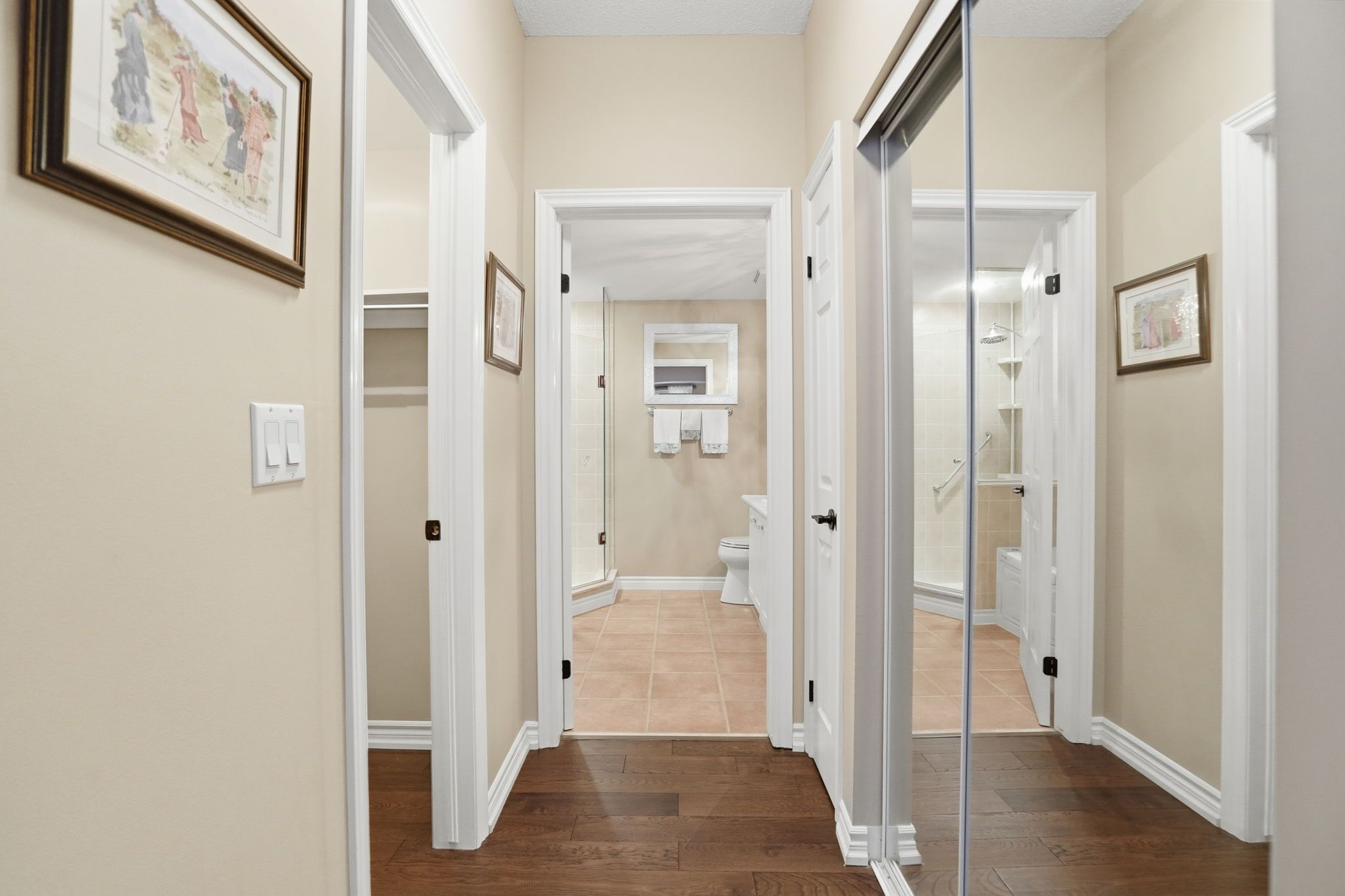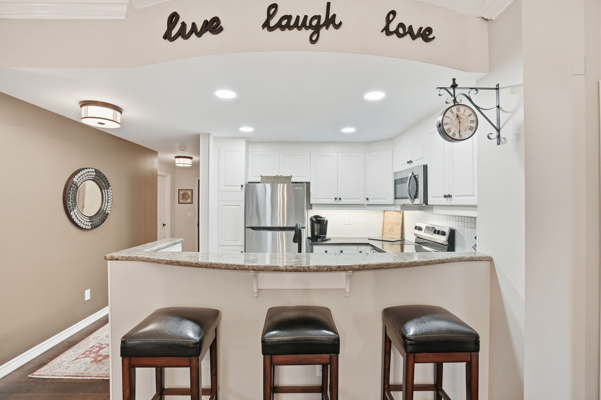 Welcome to this beautifully updated condo offering spacious open-concept living, exceptional finishes, and a spectacular property with water's edge views. Soaring 9-foot ceilings enhance the living and dining rooms, creating a bright and refined space that flows seamlessly to a walk-out balcony. The glass-framed balcony (approximately 100 sq. Ft.) is perfect for relaxing. The kitchen is a standout, featuring a breakfast bar, stainless steel appliances, under-counter task lighting, pot lights, a double-depth pantry, and tasteful finishes. Recent updates include a new countertop, sink, faucet, and backsplash (2021), along with new flooring, fresh paint, four new pot lights, and a new microwave hood fan (2024). This condo features primary suite with a walk-in closet and 5-piece ensuite with a new toilet and vanity counter, and a spacious 2nd bedroom and 4 piece main bathroom. Additional upgrades include new bedroom flooring (2021), new front hall and kitchen flooring, updated closet doors (2022), and freshly painted living and dining room ceilings. Enjoy the convenience of a separate in-suite laundry room and parking located adjacent to the basement entry. The well-maintained building offers outstanding amenities, including a large party room for special events, a walkout patio with bbq area, lakeside gazebo, well-equipped exercise room, large hot tub, and plenty of above-ground visitor parking. This is a rare opportunity to enjoy stylish condo living with exceptional outdoor views and resort-style amenities.