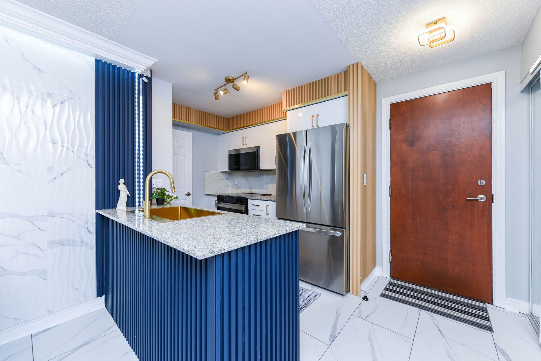 "seeing-is-believing"!!! Masterfully renovated to highest standards. No detail has been left unattended. New marble-look vinyl flooring throughout. Living/dining: crown moulding all around with remote-controlled diffused led lighting for relaxing ambiance. Textured marble-look accent wall to the right, wainscotting encrusted wall to the left. A specially designed tv wall-panel surrounded by led strip lighting with built-in console and full motion tv mount and navy blue fluted panels. Kitchen: brand new white melamine kitchen cabinets with soft-close doors, elegant golden handles and under-cabinet motion sensor lights. All new high-end lg/samsung major appliances, over the range panasonic microwave with built-in exhaust. Large modern rectangular gold-look metal kitchen sink with golden gooseneck faucet. Faux wood fluted panels along the ceiling and right wall. Primary bedroom: artistic head-board wall has black granite-look panel in the middle with fluted panels on either side, walk-in closet with cupboard. Attached ensuite washroom has moulded one-piece toilet and gold accent sink faucet. 2nd bedroom: has fluted side panels and marble-look panel under the window. Den: (a separate room with door, can be used as a bedroom)) : has backwall with part fluted panels and part black granite look panel. Main washroom: has white quartz vanity with gold/black designer faucet, molded one-piece toilet, 2 towel bars and a glass enclosed shower stall. All 3 bedrooms have exquisite led ceiling lights with remote controls.