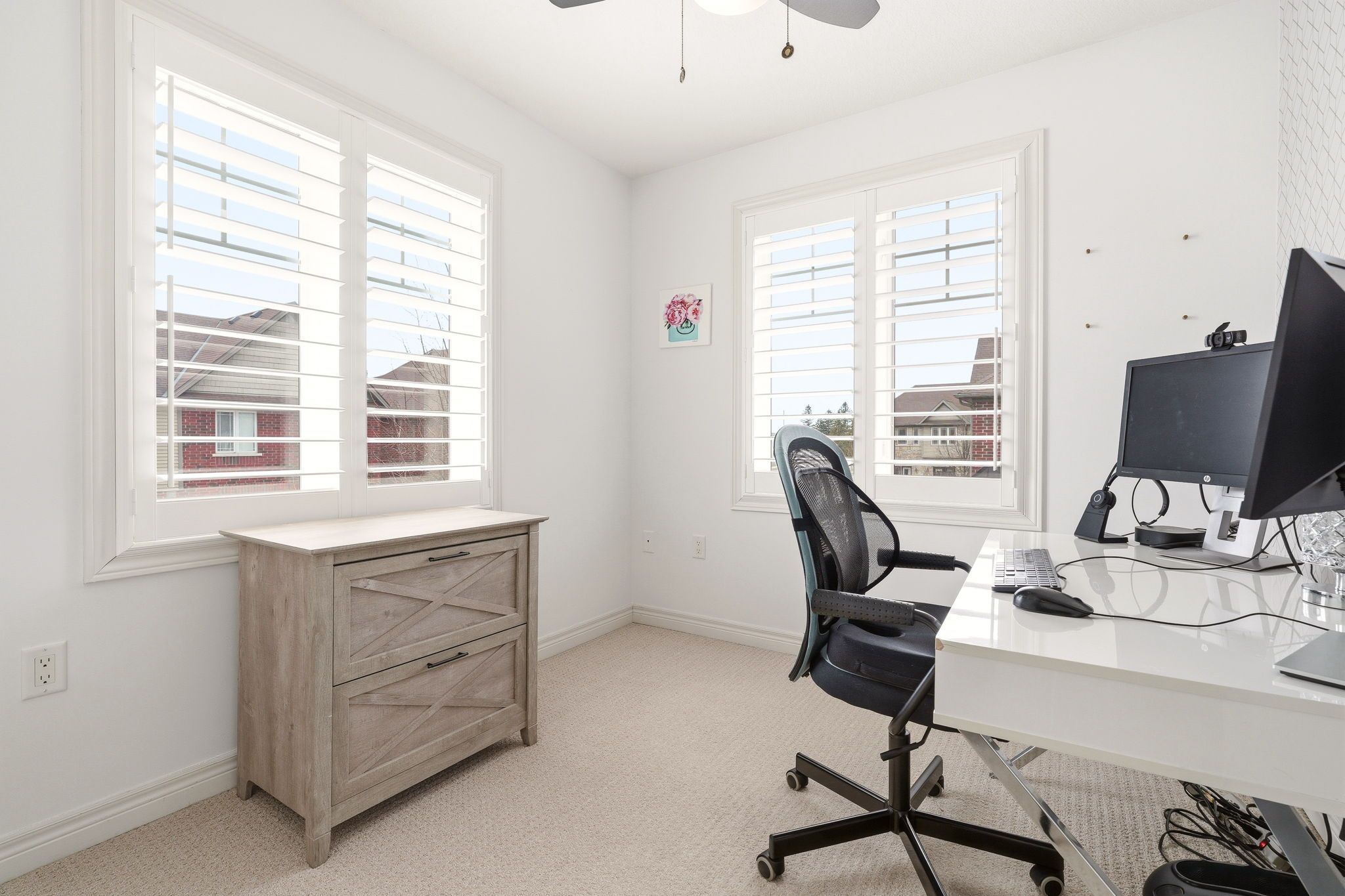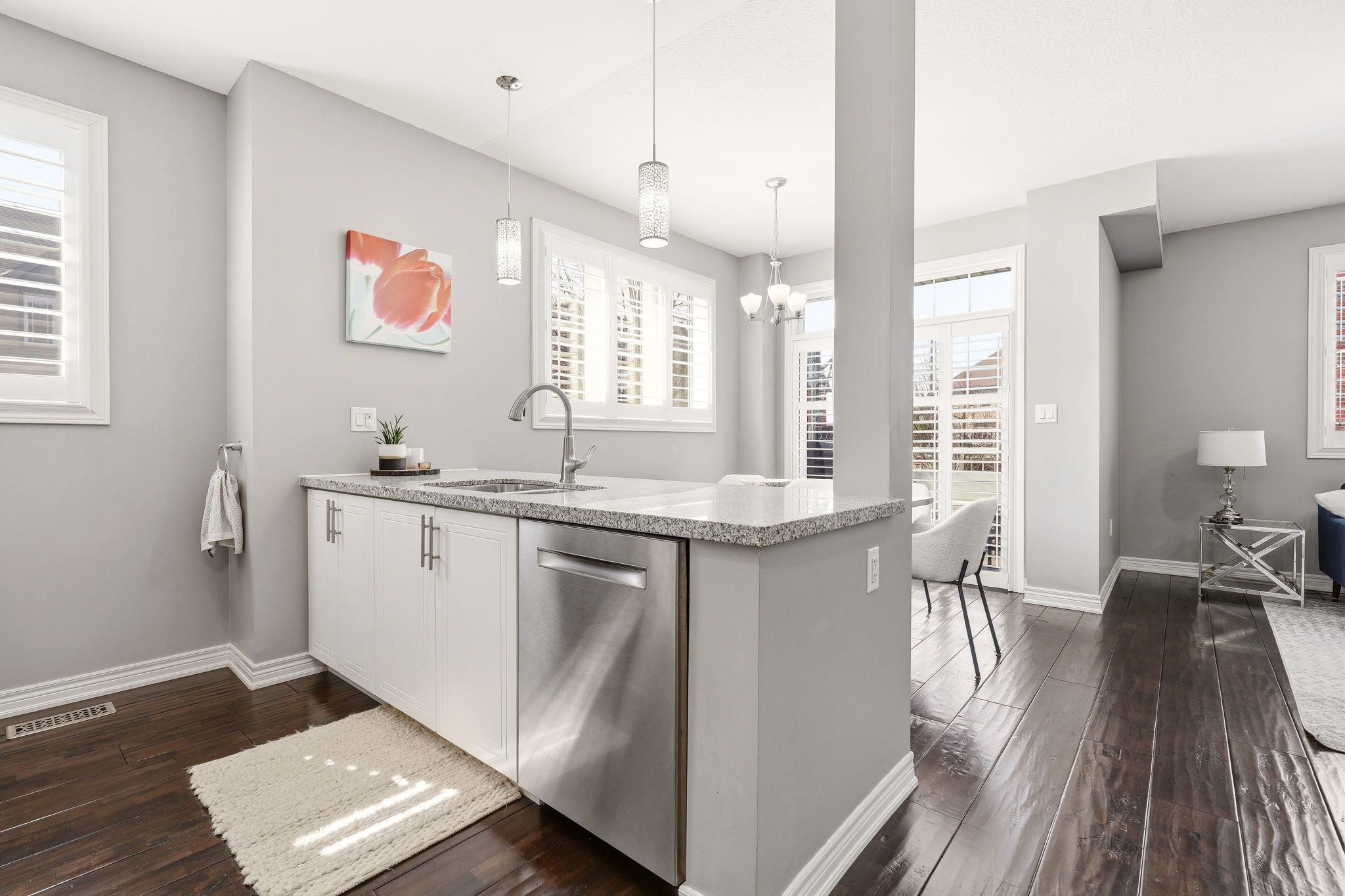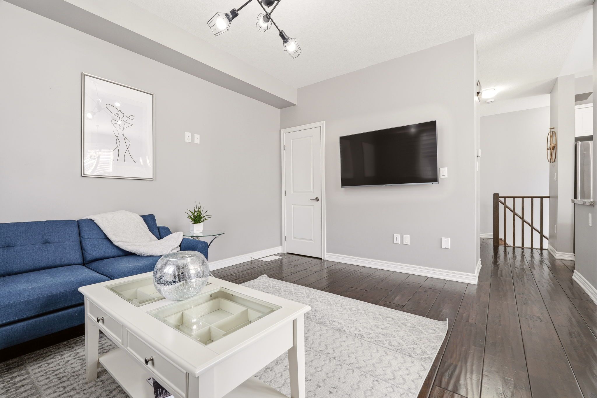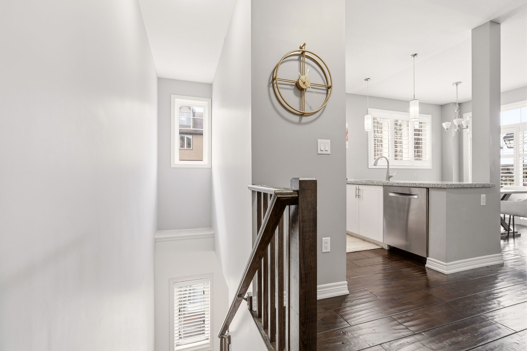Clean & bright 3 bedroom, end unit freehold townhome with low road maintenance fee, built in 2012 in the desirable binbrook neighbourhood! Offering many upgrades, perfect for first-time home buyers. Enter into the bright main level with a spacious den or office, access to the garage andstorage. The second level features engineered hardwood flooring in an open concept living room and dining room with a walk-out to the balcony,immaculate white kitchen cabinets with granite counter tops & stainless steel appliances and a renovated powder room. Ideal layout forentertaining and daily living, don't miss the walk-in pantry on this level, great additional storage! The third floor offers 3 well-sized bedrooms anda newly painted 4-piece bathroom with a soaker tub and new vanity. Laundry is conveniently located on the second level. Custom california shuttersthroughout the second & third levels. One-car garage with inside entry and roughed-in central vacuum.