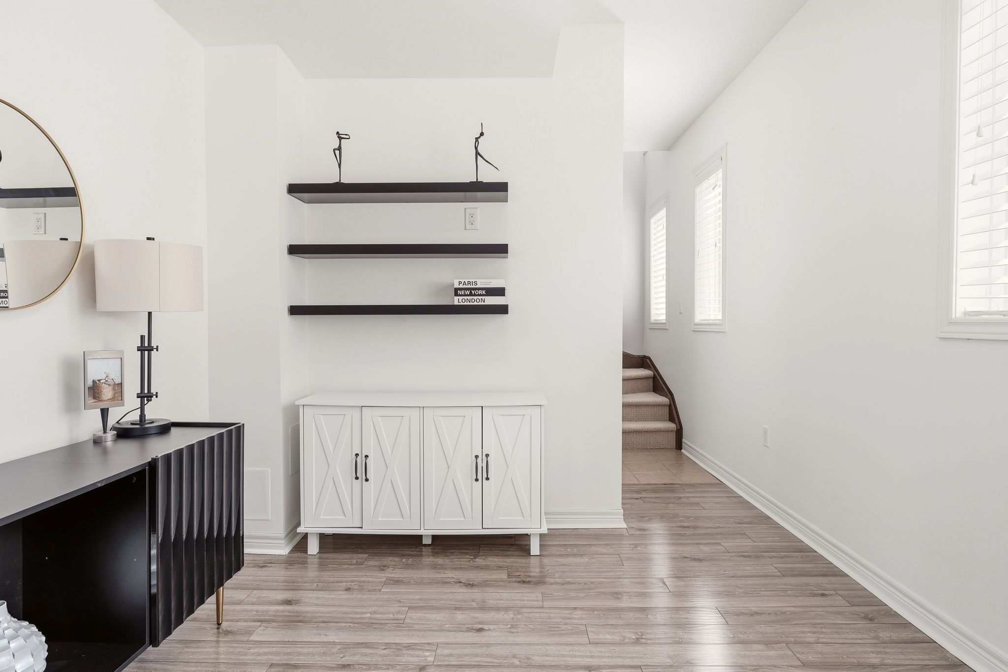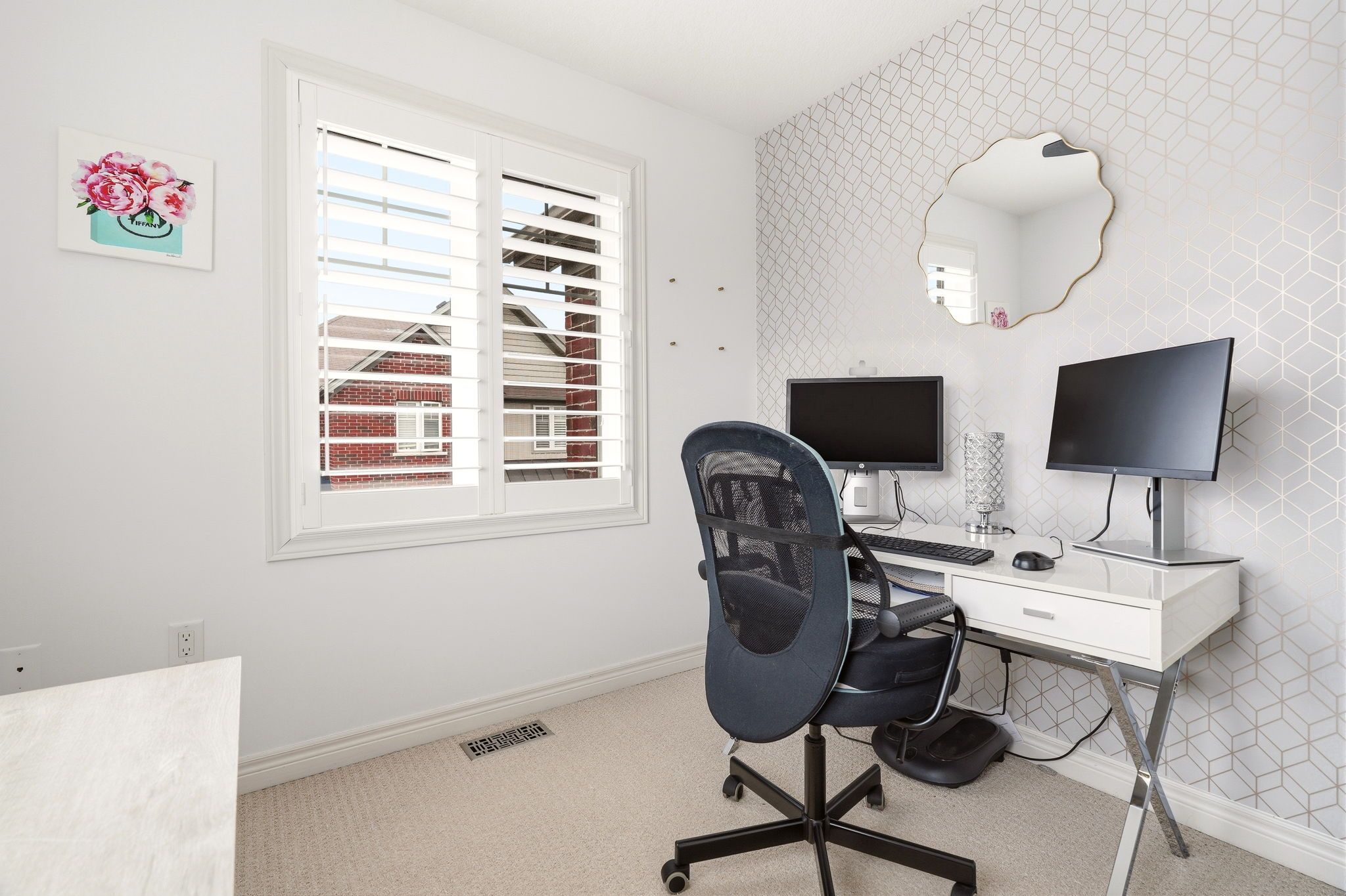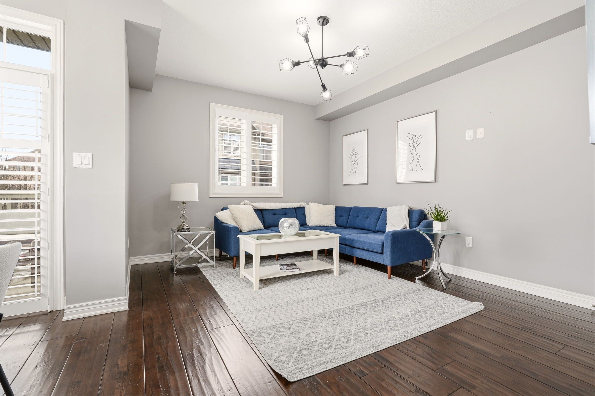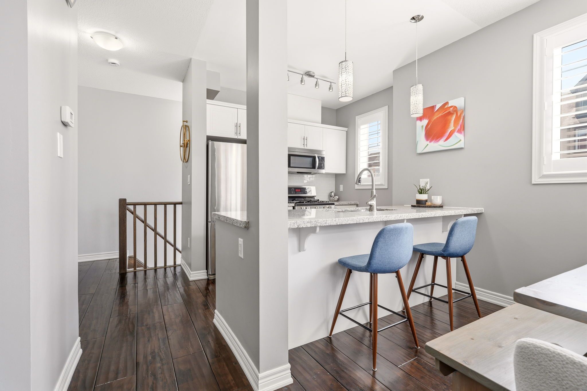 Clean & bright 3 bedroom, end unit freehold townhome with low road maintenance fee, built in 2012 in the desirable binbrook neighbourhood! Offering many upgrades, perfect for first-time home buyers. Enter into the bright main level with a spacious den or office, access to the garage andstorage. The second level features engineered hardwood flooring in an open concept living room and dining room with a walk-out to the balcony,immaculate white kitchen cabinets with granite counter tops & stainless steel appliances and a renovated powder room. Ideal layout forentertaining and daily living, don't miss the walk-in pantry on this level, great additional storage! The third floor offers 3 well-sized bedrooms anda newly painted 4-piece bathroom with a soaker tub and new vanity. Laundry is conveniently located on the second level. Custom california shuttersthroughout the second & third levels. One-car garage with inside entry and roughed-in central vacuum.