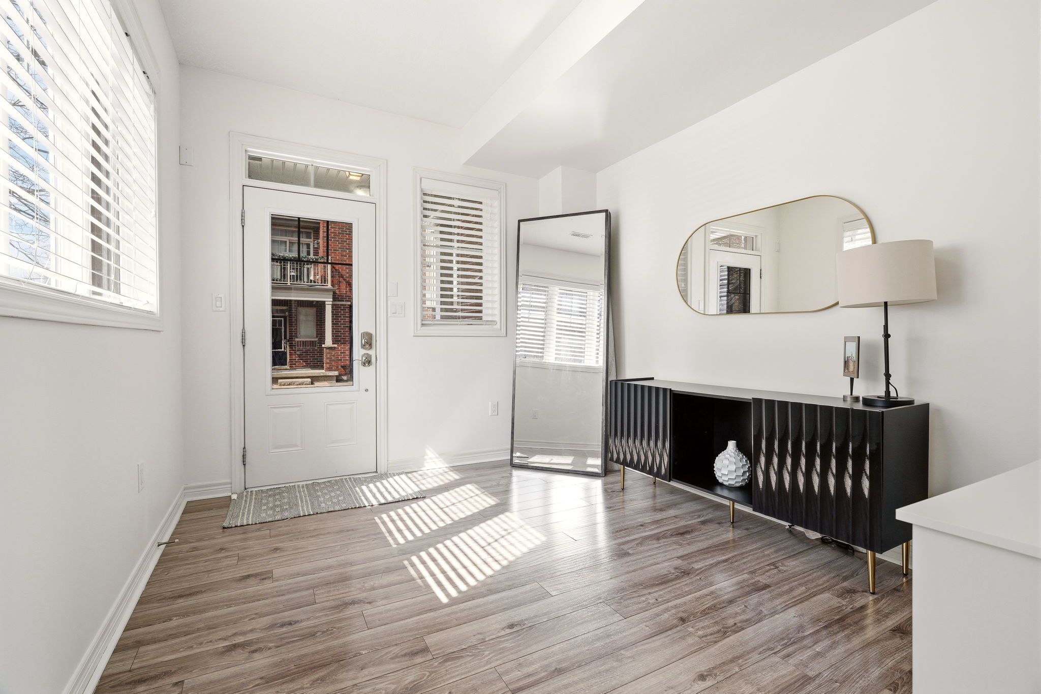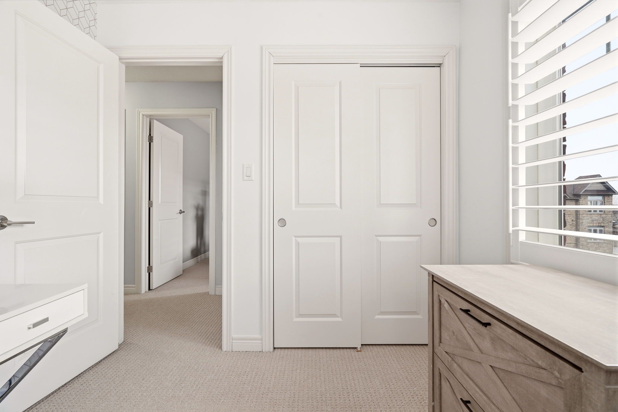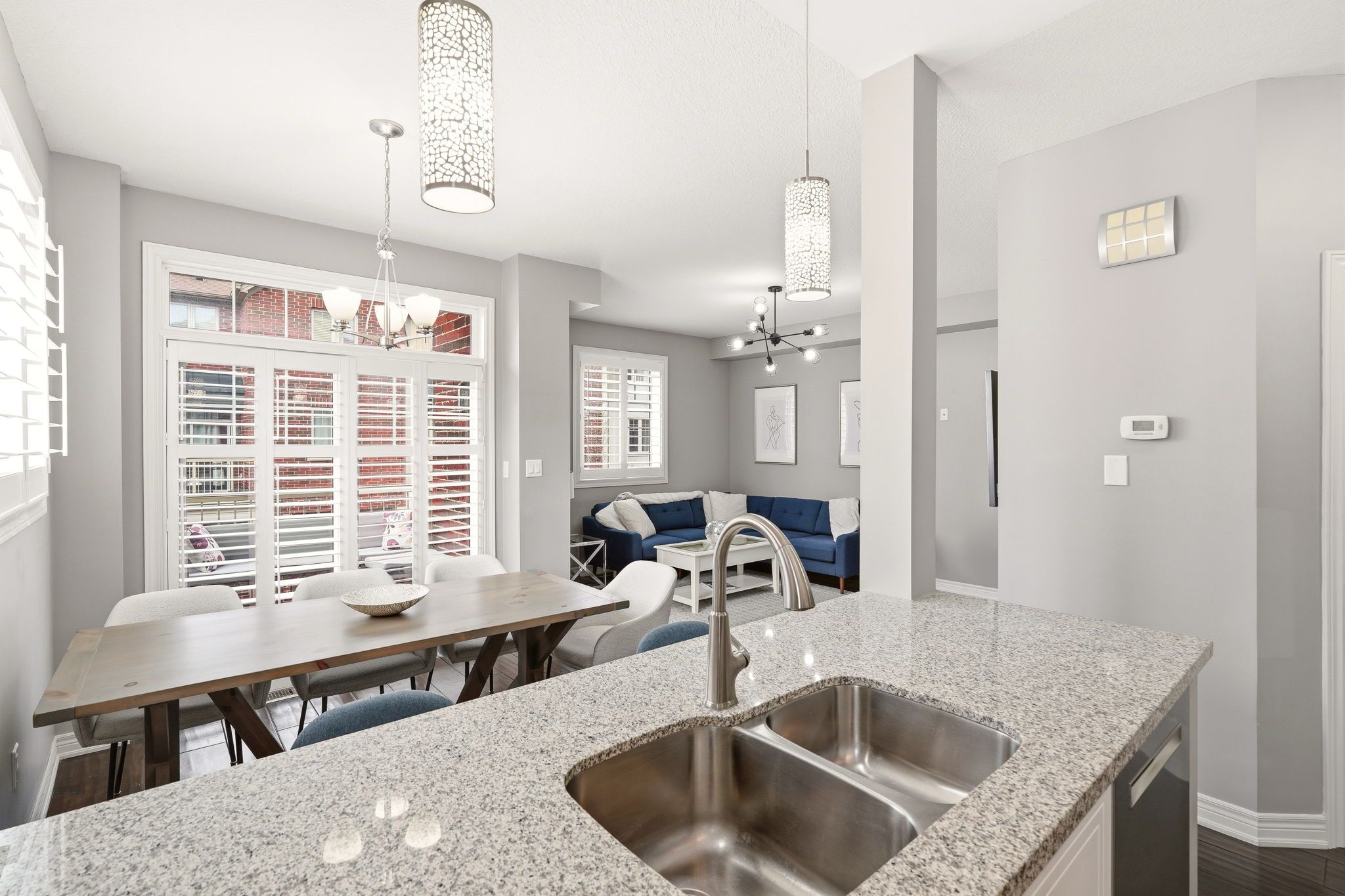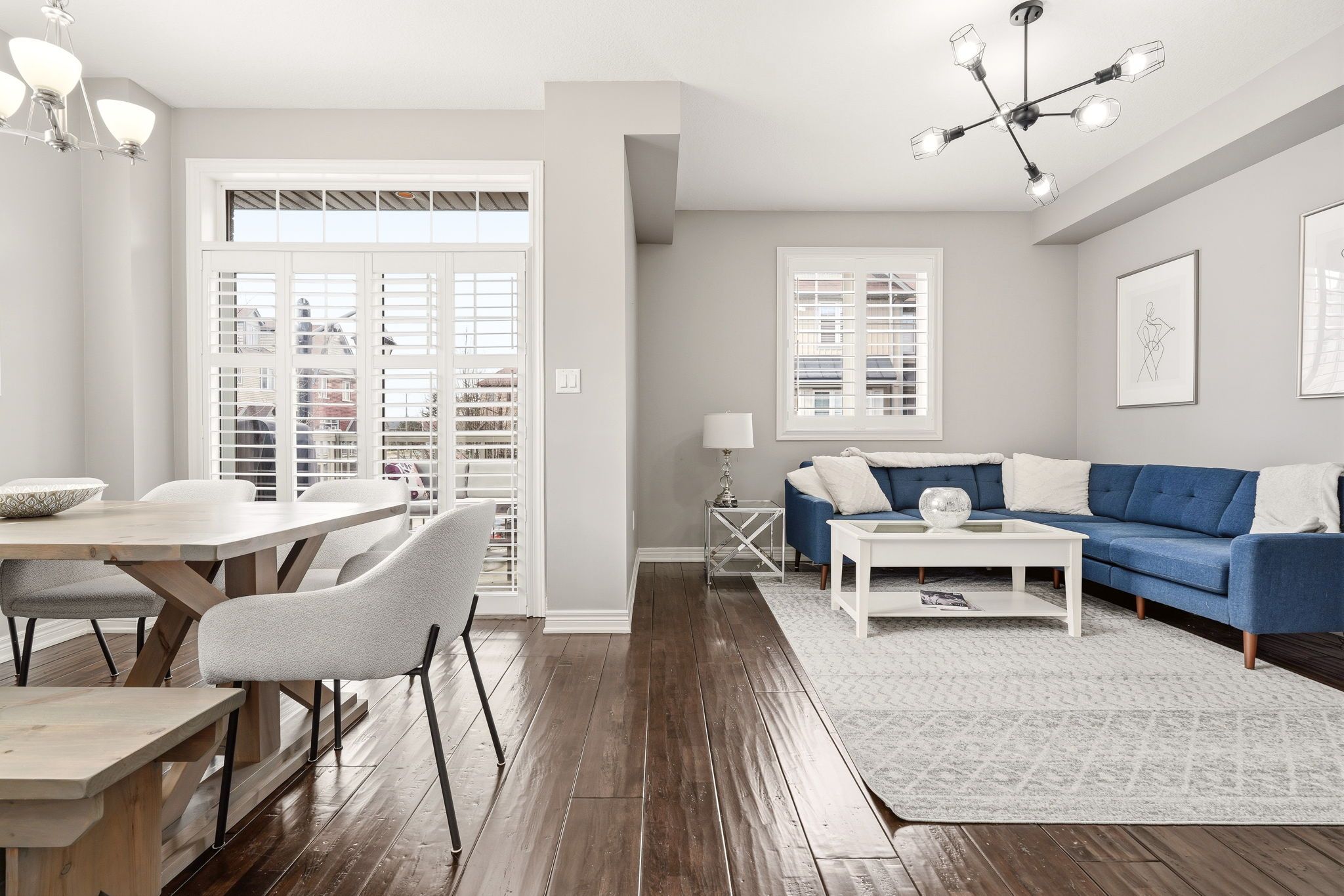 Clean & bright 3 bedroom, end unit freehold townhome with low road maintenance fee, built in 2012 in the desirable binbrook neighbourhood! Offering many upgrades, perfect for first-time home buyers. Enter into the bright main level with a spacious den or office, access to the garage andstorage. The second level features engineered hardwood flooring in an open concept living room and dining room with a walk-out to the balcony,immaculate white kitchen cabinets with granite counter tops & stainless steel appliances and a renovated powder room. Ideal layout forentertaining and daily living, don't miss the walk-in pantry on this level, great additional storage! The third floor offers 3 well-sized bedrooms anda newly painted 4-piece bathroom with a soaker tub and new vanity. Laundry is conveniently located on the second level. Custom california shuttersthroughout the second & third levels. One-car garage with inside entry and roughed-in central vacuum.