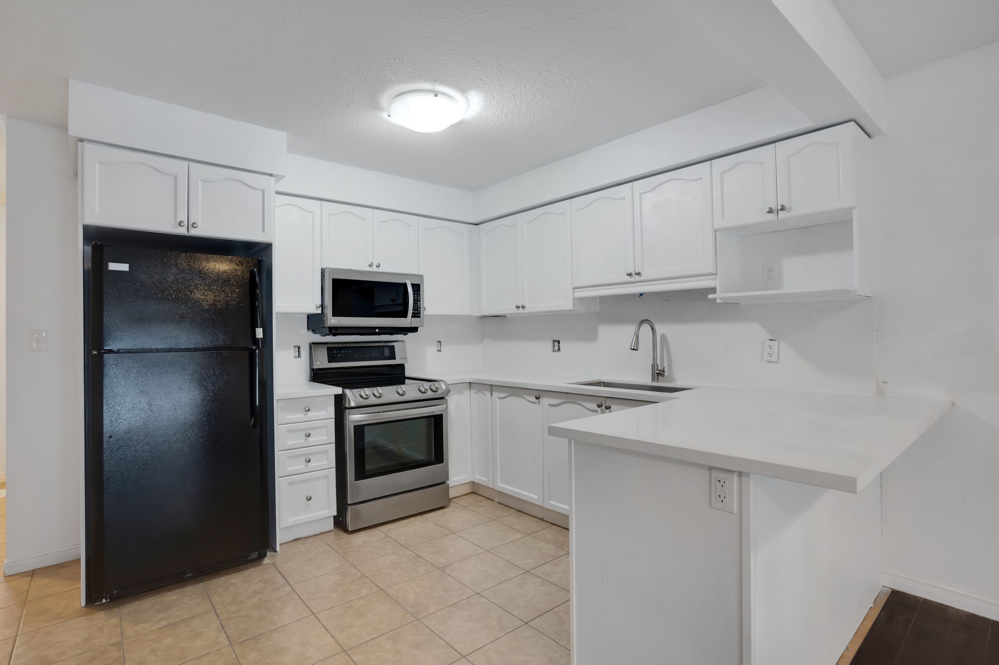 • Modern kitchen with stylish white cabinetry and seating for casual meals.