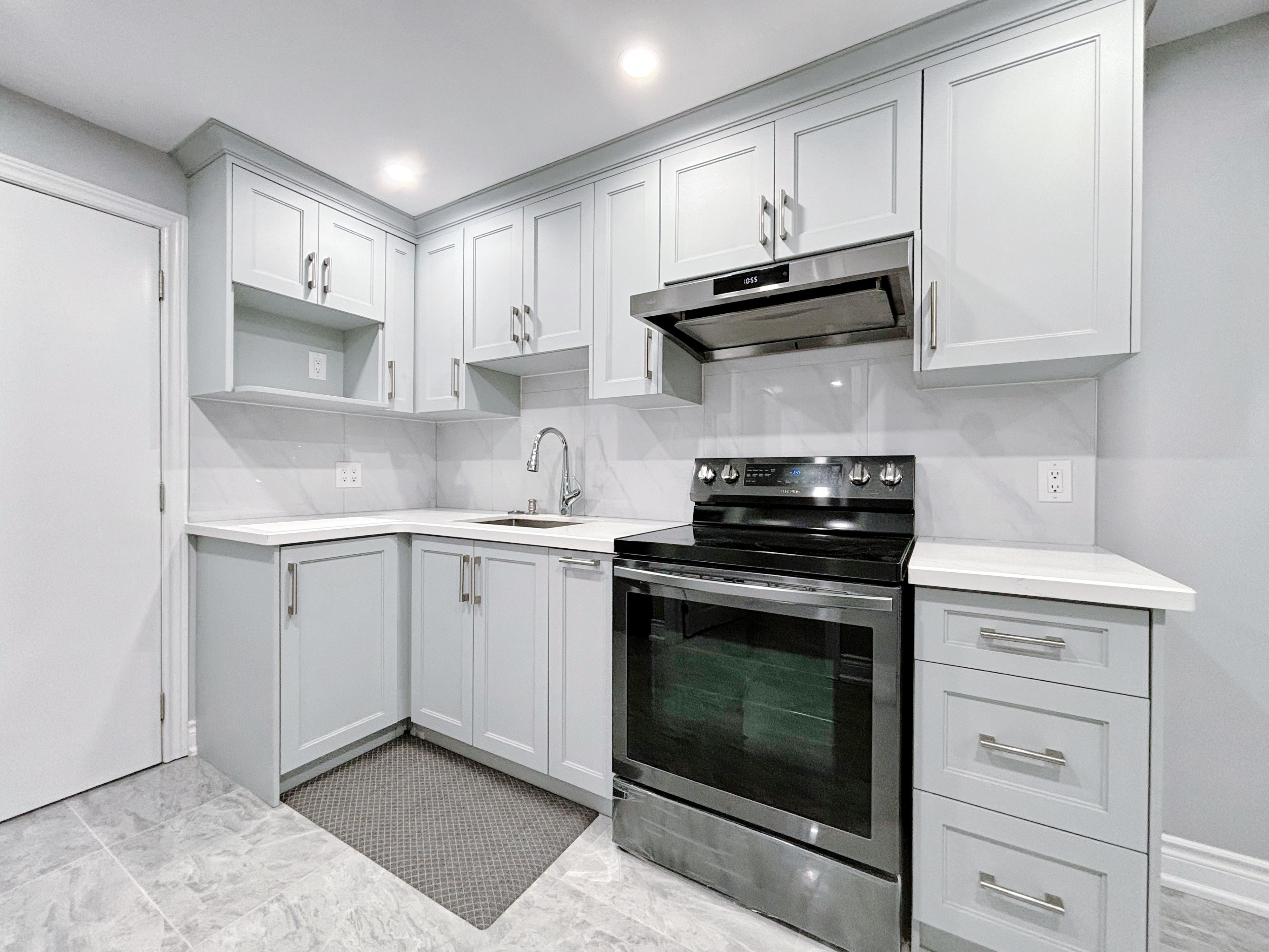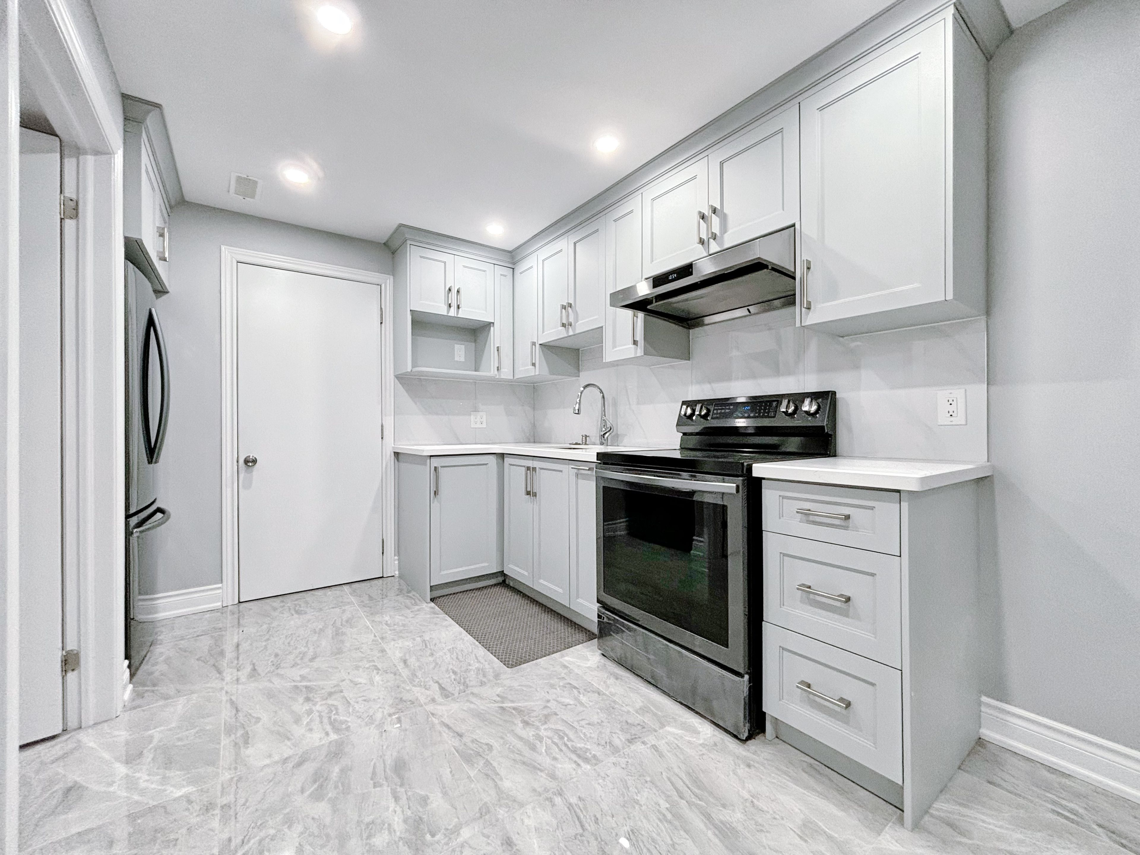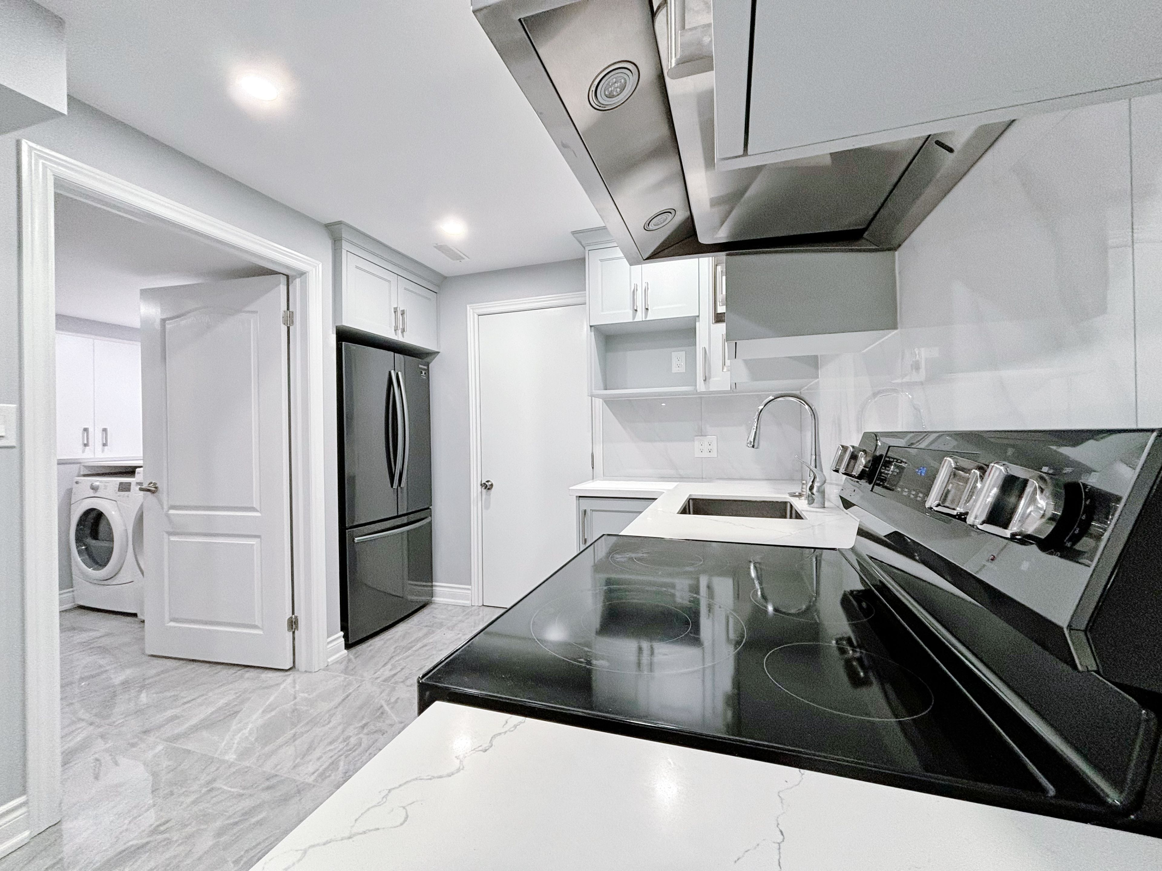 • Stylish kitchen with quartz countertops and modern pot lights.