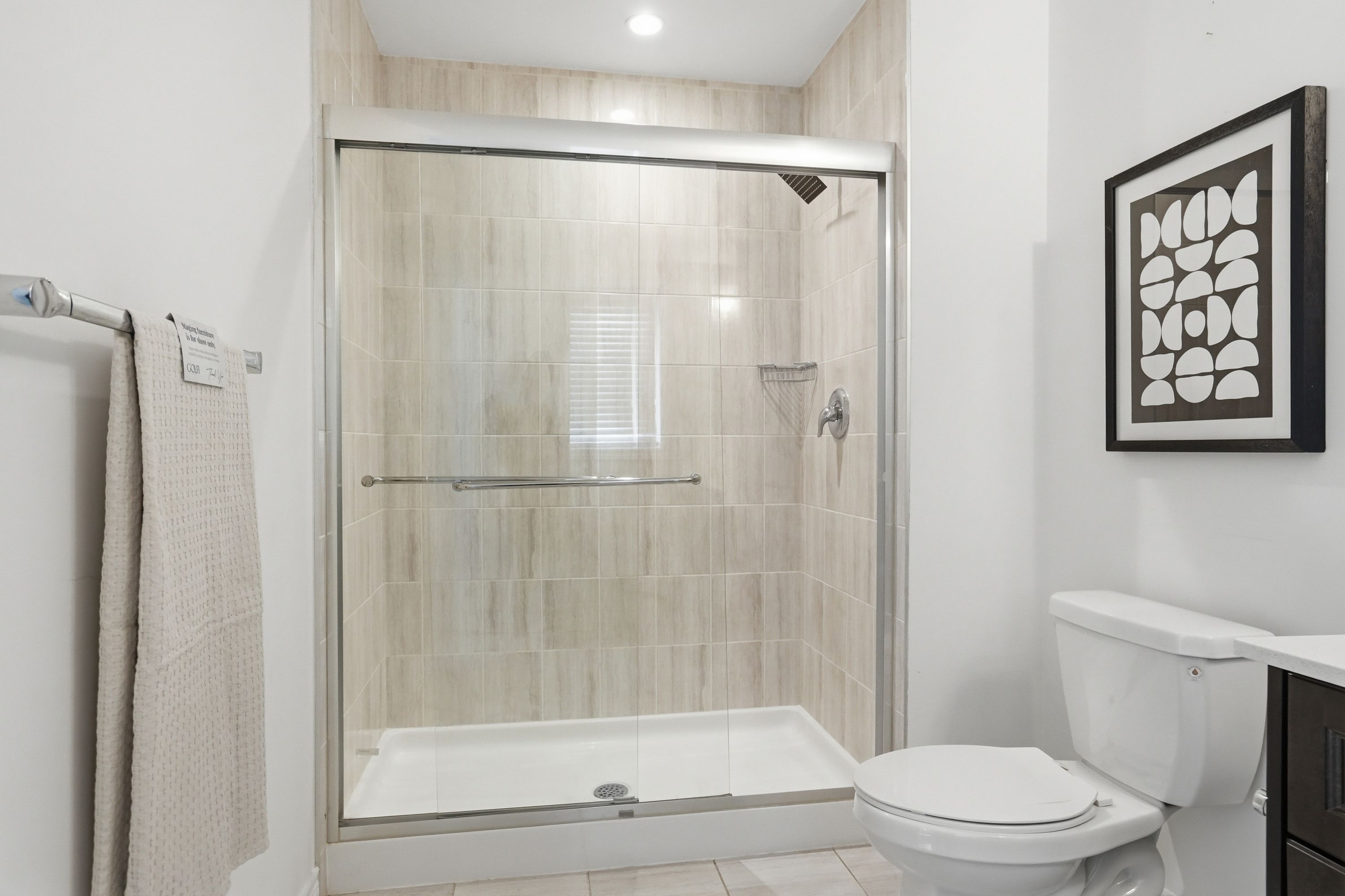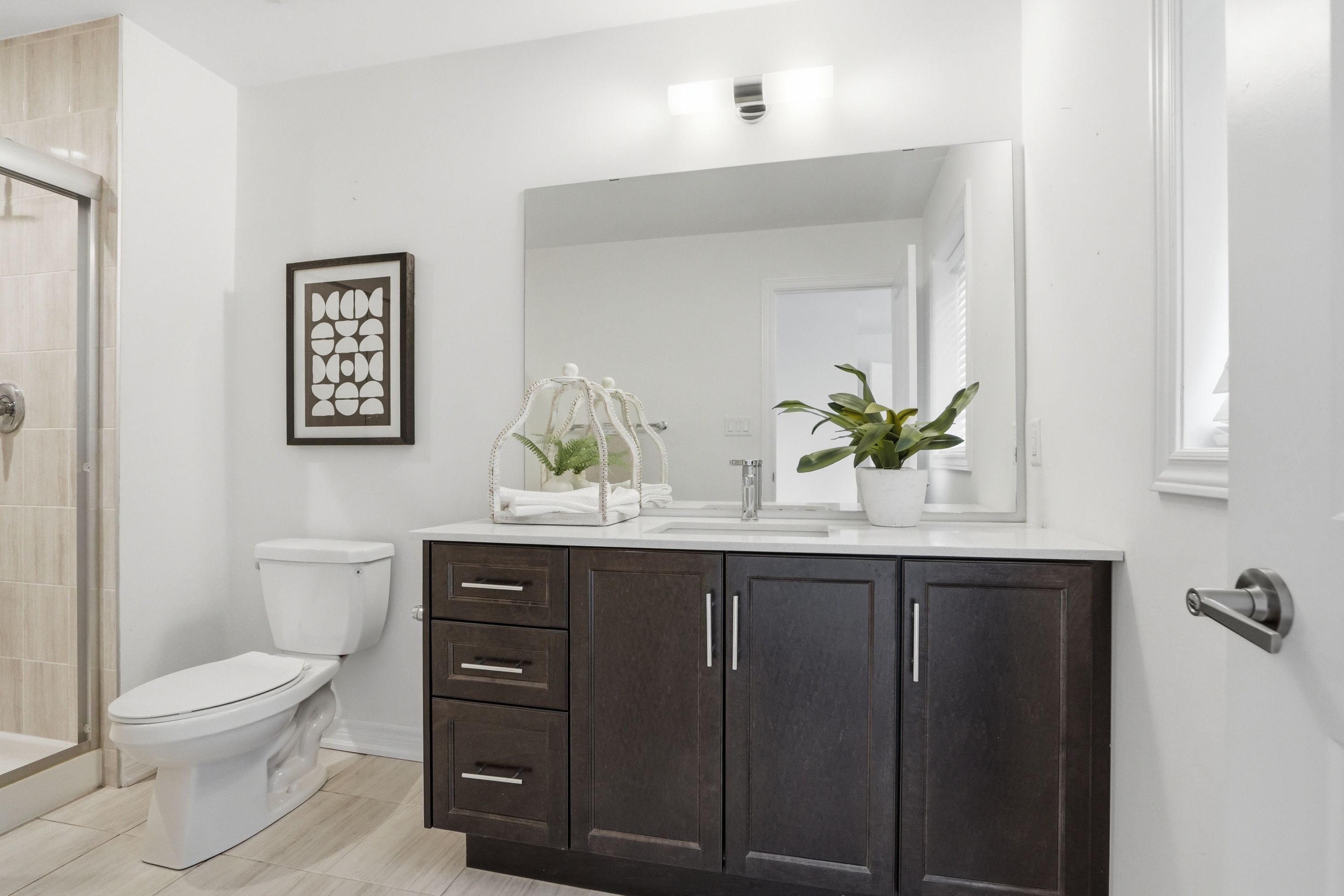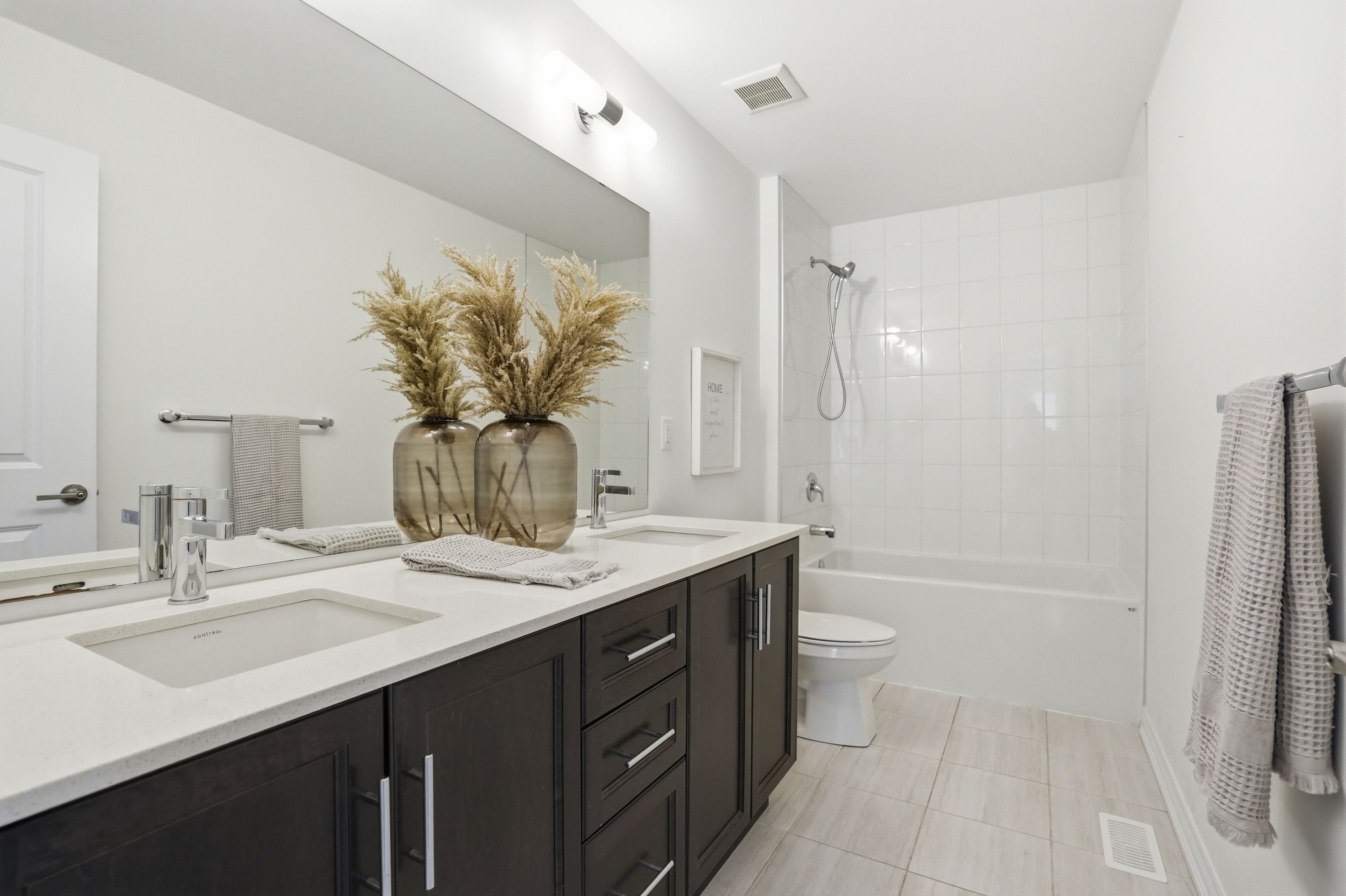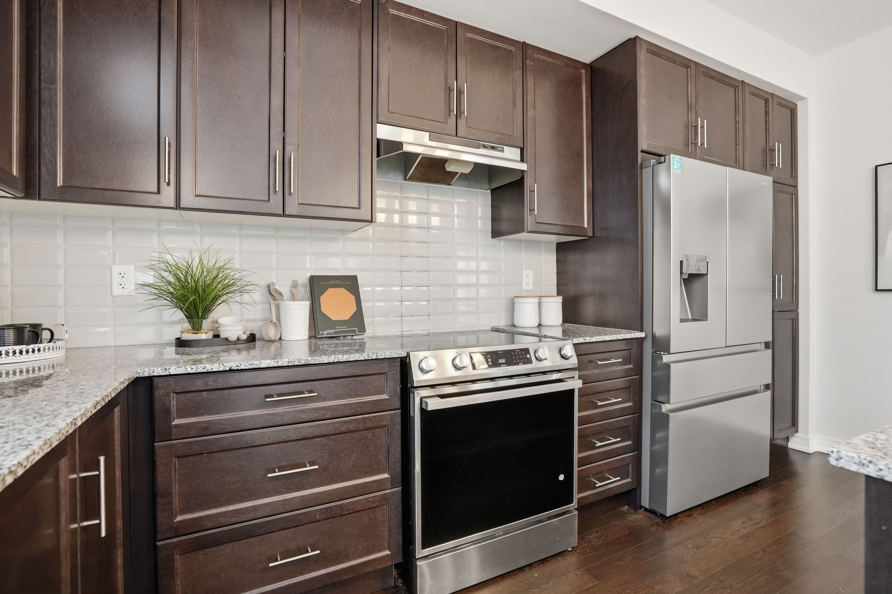 • Eat-in kitchen with quartz countertops and large island for cooking and dining.
