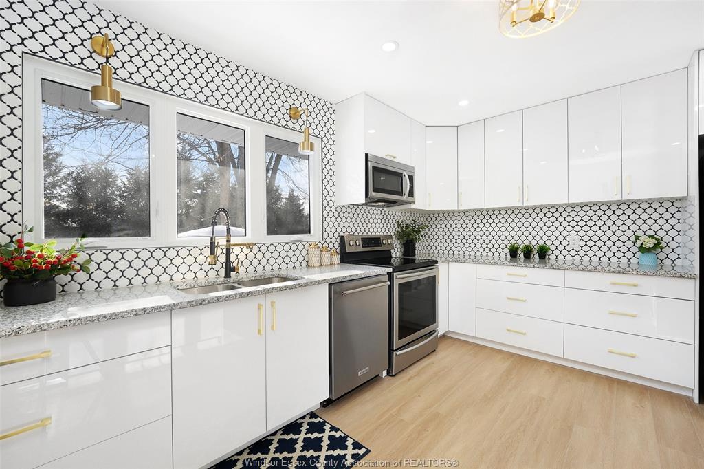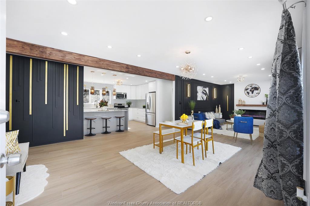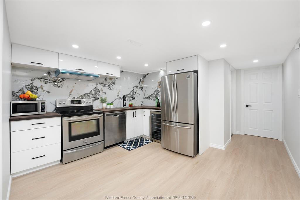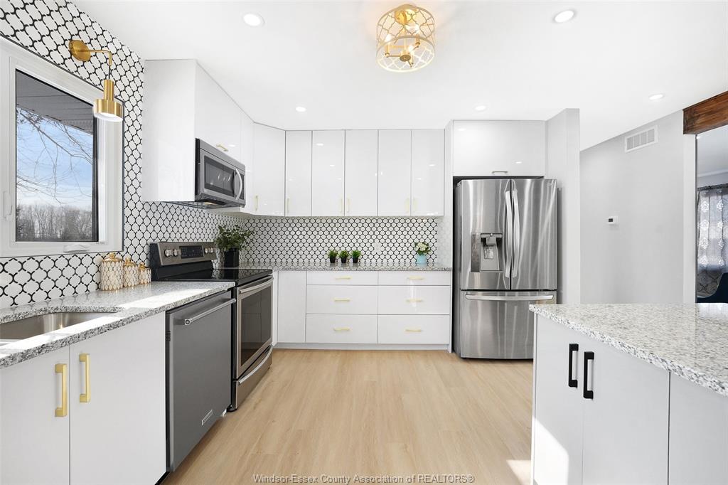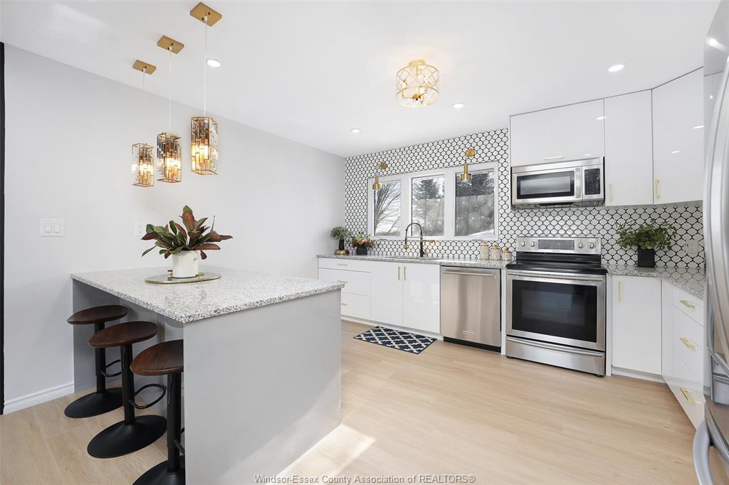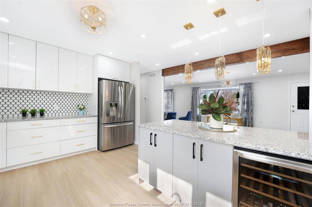 neighbourhood. Step inside to a luxury open-concept layout with breathtaking finishes, top-of-the-line flooring, & over 100 brand-new light fixtures throughout. The living room features three custom-made accent walls, including pvc panelling, electric fireplace, wood beam and mantel. Elegant open concept kitchen/dining with granite countertops, mona sara diamond backsplash, an oversized island with seating for three, brand-new custom soft-close cabinetry, complete with stainless steel appliances and wine cooler. Main floor also features a master bedroom with ensuite bathroom, 2 more bedrooms and a full guest bathroom. Lower level offers a family room complete with a stunning accent wall with electric fireplace, beautifully designed pvc panelling hidden door to lower level primary bedroom, custom-made kitchen/wet bar, two bedrooms, full bathroom, dining room and laundry/utility room. 13 appliances included! Highly desired heated multi-car garage featuring epoxy flooring. Designed for year-round use with ample space for multiple vehicles, storage, or a workshop. Huge double concrete driveway. Fully fenced and private backyard with no rear neighbours and mature trees. Upgraded plumbing/hvac. This home is loaded with updates, updates sheet attached in docs tab. Home inspection report in docs tab. Close proximity to shopping, schools, parks, & all essential amenities.