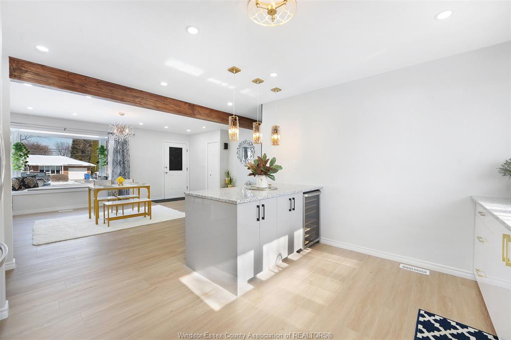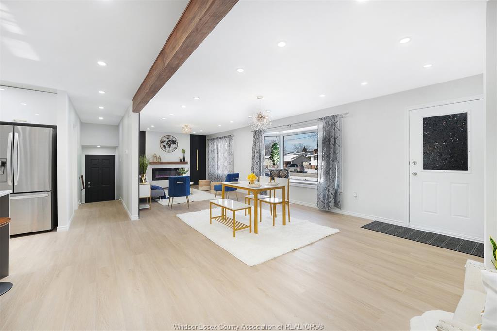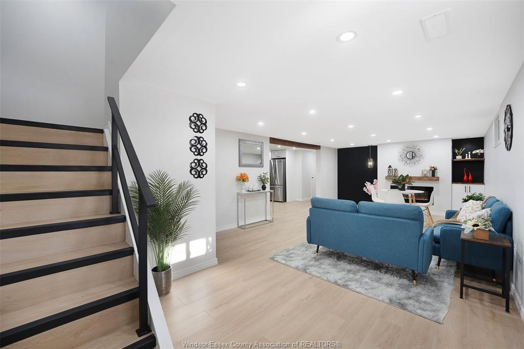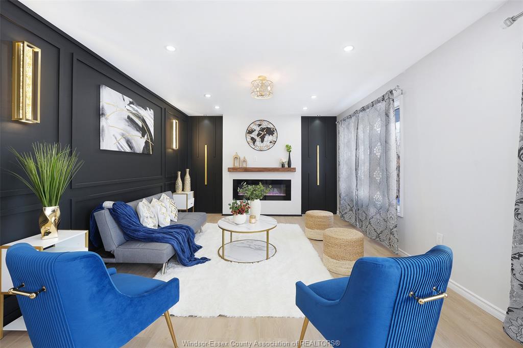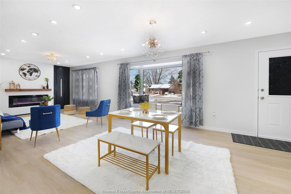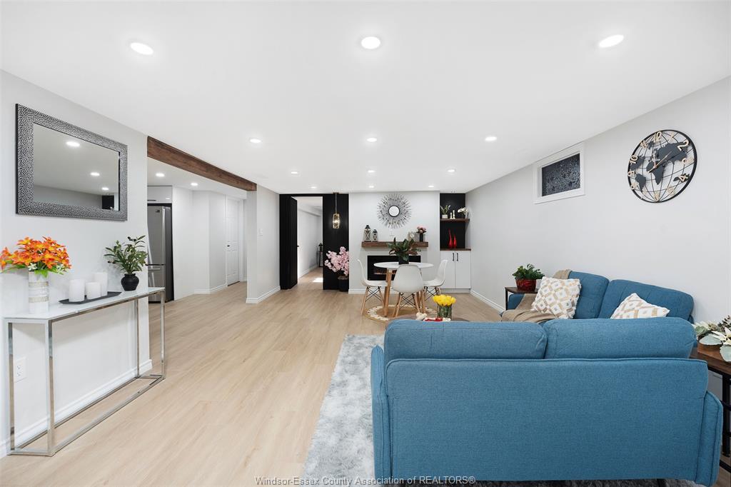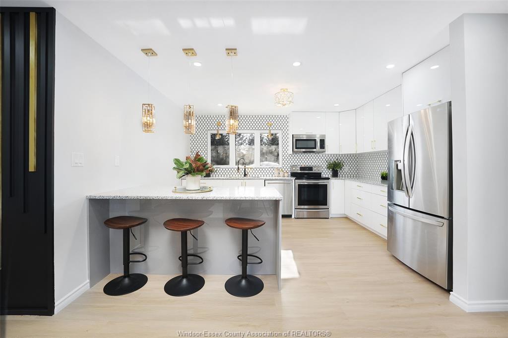 neighbourhood. Step inside to a luxury open-concept layout with breathtaking finishes, top-of-the-line flooring, & over 100 brand-new light fixtures throughout. The living room features three custom-made accent walls, including pvc panelling, electric fireplace, wood beam and mantel. Elegant open concept kitchen/dining with granite countertops, mona sara diamond backsplash, an oversized island with seating for three, brand-new custom soft-close cabinetry, complete with stainless steel appliances and wine cooler. Main floor also features a master bedroom with ensuite bathroom, 2 more bedrooms and a full guest bathroom. Lower level offers a family room complete with a stunning accent wall with electric fireplace, beautifully designed pvc panelling hidden door to lower level primary bedroom, custom-made kitchen/wet bar, two bedrooms, full bathroom, dining room and laundry/utility room. 13 appliances included! Highly desired heated multi-car garage featuring epoxy flooring. Designed for year-round use with ample space for multiple vehicles, storage, or a workshop. Huge double concrete driveway. Fully fenced and private backyard with no rear neighbours and mature trees. Upgraded plumbing/hvac. This home is loaded with updates, updates sheet attached in docs tab. Home inspection report in docs tab. Close proximity to shopping, schools, parks, & all essential amenities.