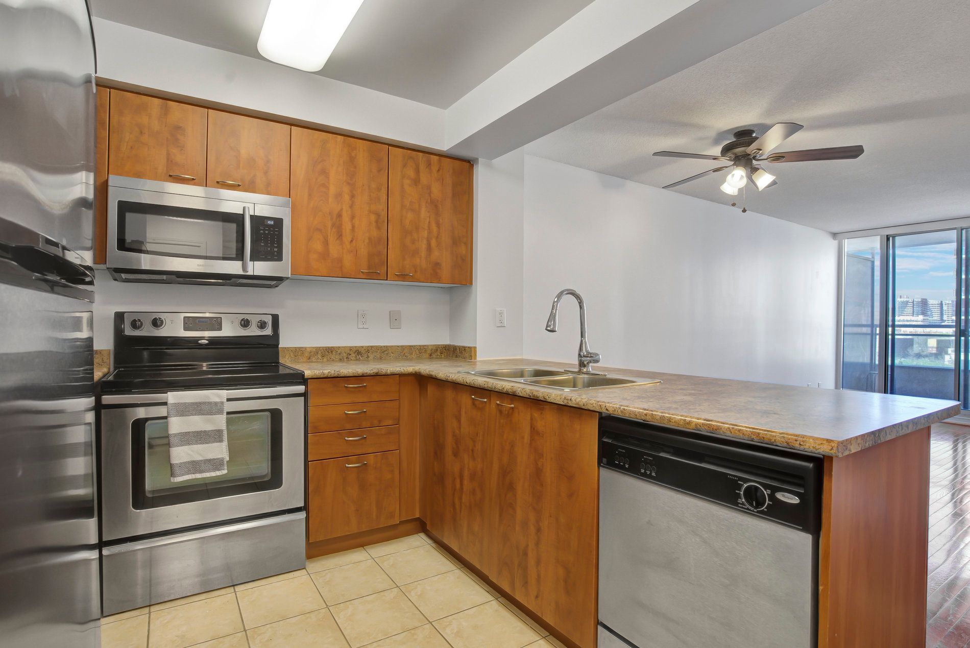 • Functional kitchen features stainless steel appliances and breakfast bar.