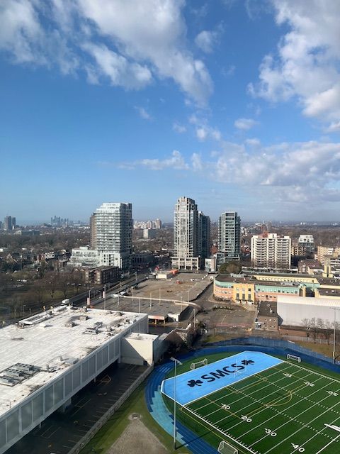 "the heathview" is morguard's award winning community where daily life unfolds w/remarkable style in one of toronto's most esteemed neighbourhoods forest hill village! *spectacular 2br 3bth s/w corner suite w/balcony+high ceilings! *abundance of floor to ceiling windows+light w/panoramic lake+cityscape+cn tower views! *unique+beautiful spaces+amenities for indoor+outdoor entertaining+recreation! *approx 1445'! **extras** stainless steel fridge+stove+b/i dw+micro,stacked washer+dryer,elf,roller shades,new luxury vinyl tile flooring,quartz,bike storage,optional parking $195/mo,optional locker $65/mo,24hrs concierge++