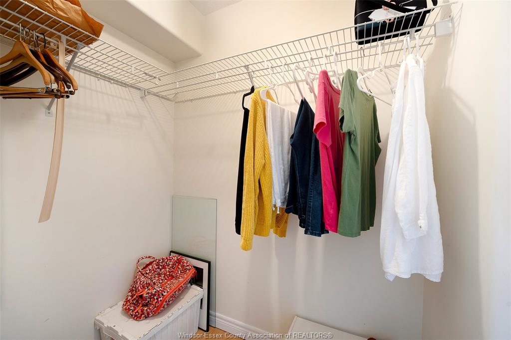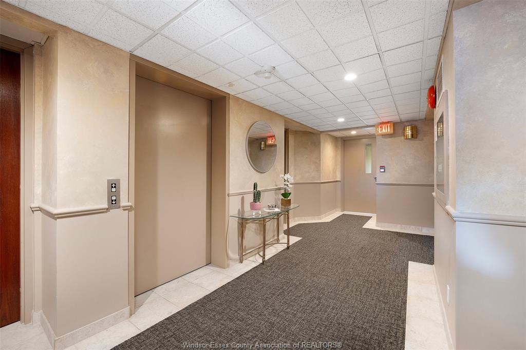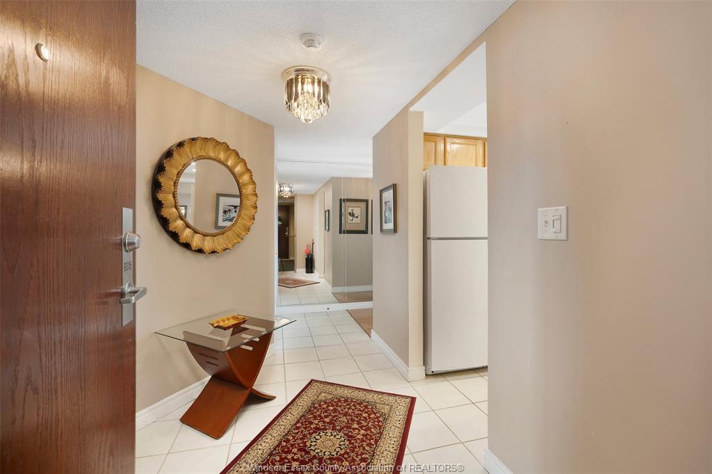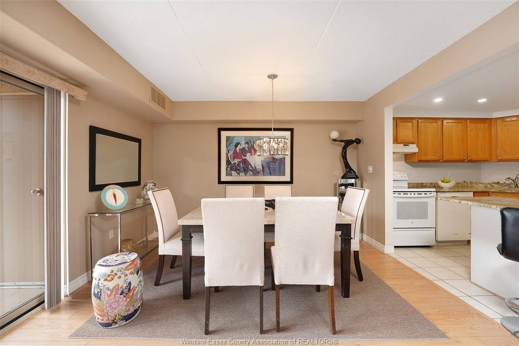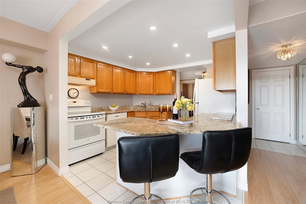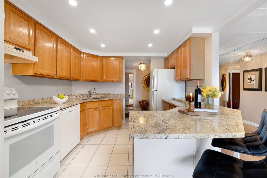 Experience refined, maintenance-free living in the prestigious st. Clair beach/tecumseh community, ideally situated within the highly sought-after village grove—just steps from lakewood park, boutique shopping, banking, professional services, and an array of dining options. This stylish corner residence showcases two-bedroom, two-bathroom, an upgraded kitchen featuring oak cabinetry, granite countertops, and bright & modern pot lighting (no fluorescent ceiling). Spacious open concept living & dining room with mirror accent walls to boost the natural light from the wide patio doors. South facing tiled balcony offers additional living space to enjoy outdoor entertaining all summer long. The primary suite boasts a walk-in closet and a private ensuite, while in-suite laundry with additional storage enhances everyday convenience. Residents enjoy the benefits of dual entrances (east and west), each serviced by its own elevator, and only four suites per floor per side— ensuring privacy and exclusivity. Underground parking and a dedicated storage locker are included. Exceptional amenities complete the offering, including an outdoor pool, tennis / pickle ball courts, a stylish party room with a full kitchen, and a well-appointed fitness centre with sauna. Elevate your lifestyle in a residence that perfectly balances comfort, convenience, and sophistication.