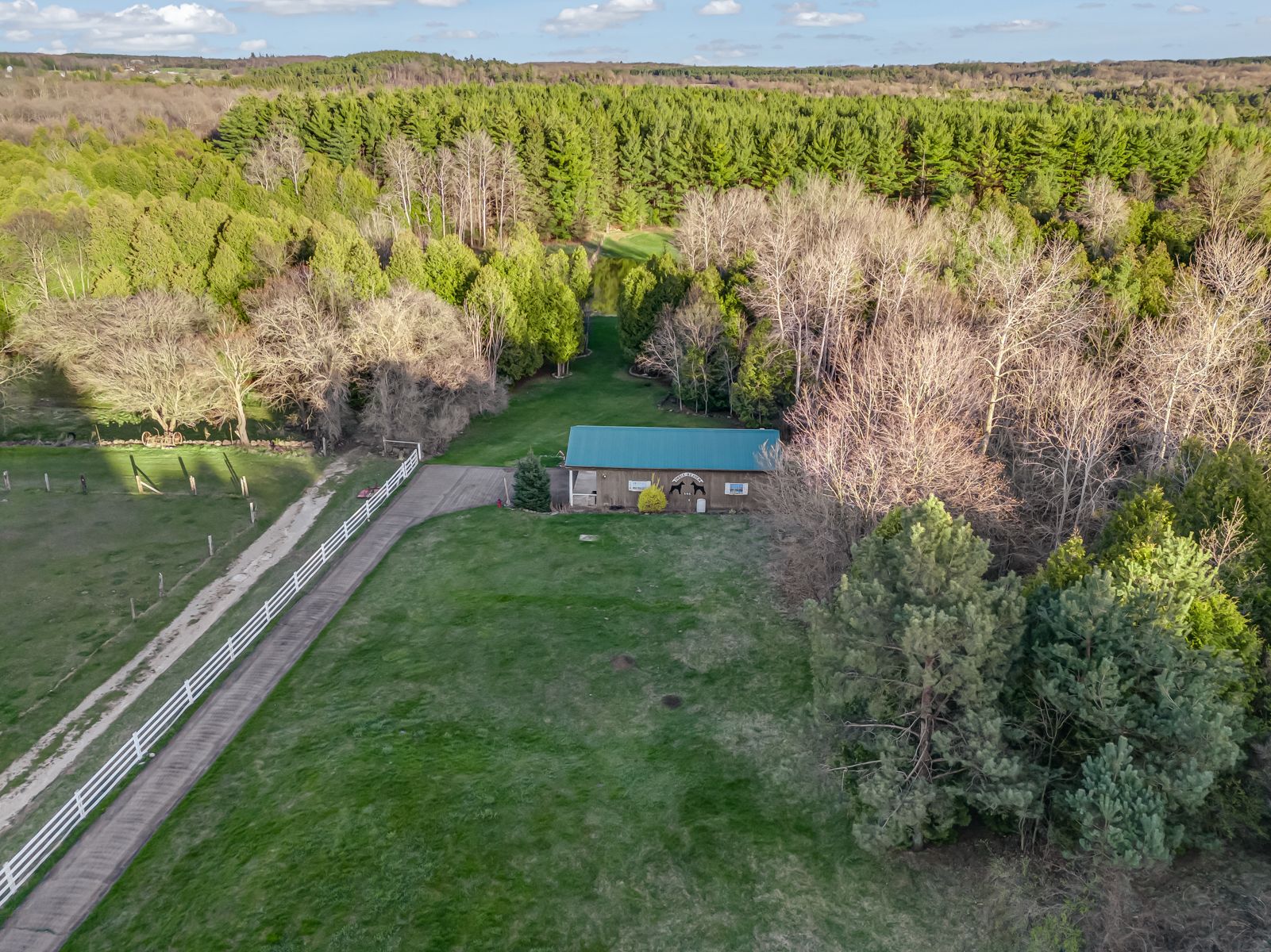 • Includes a large outbuilding, several sheds, a gazebo, and a pond.