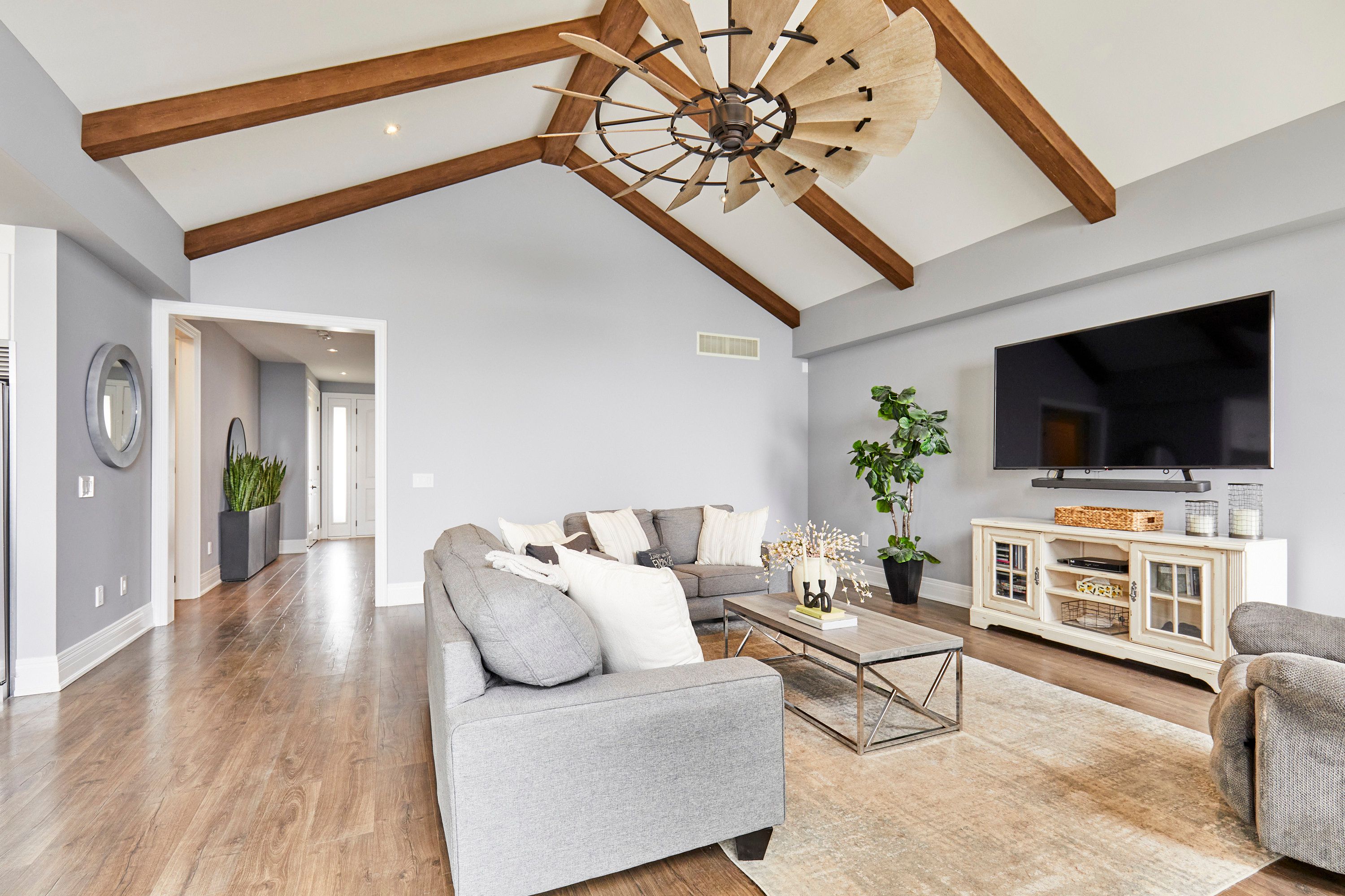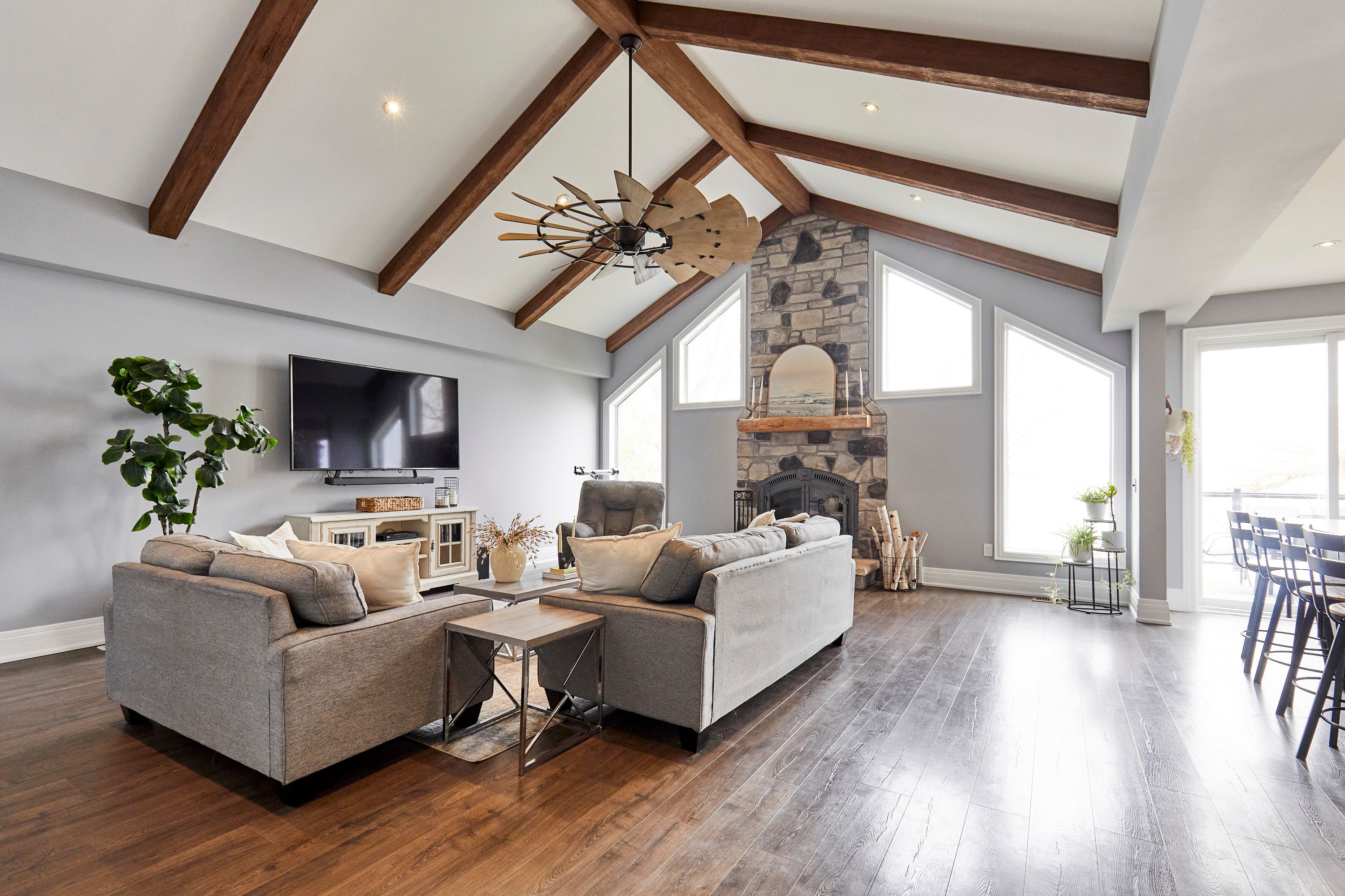 • Open-concept living space with cathedral ceilings and a cozy fireplace.