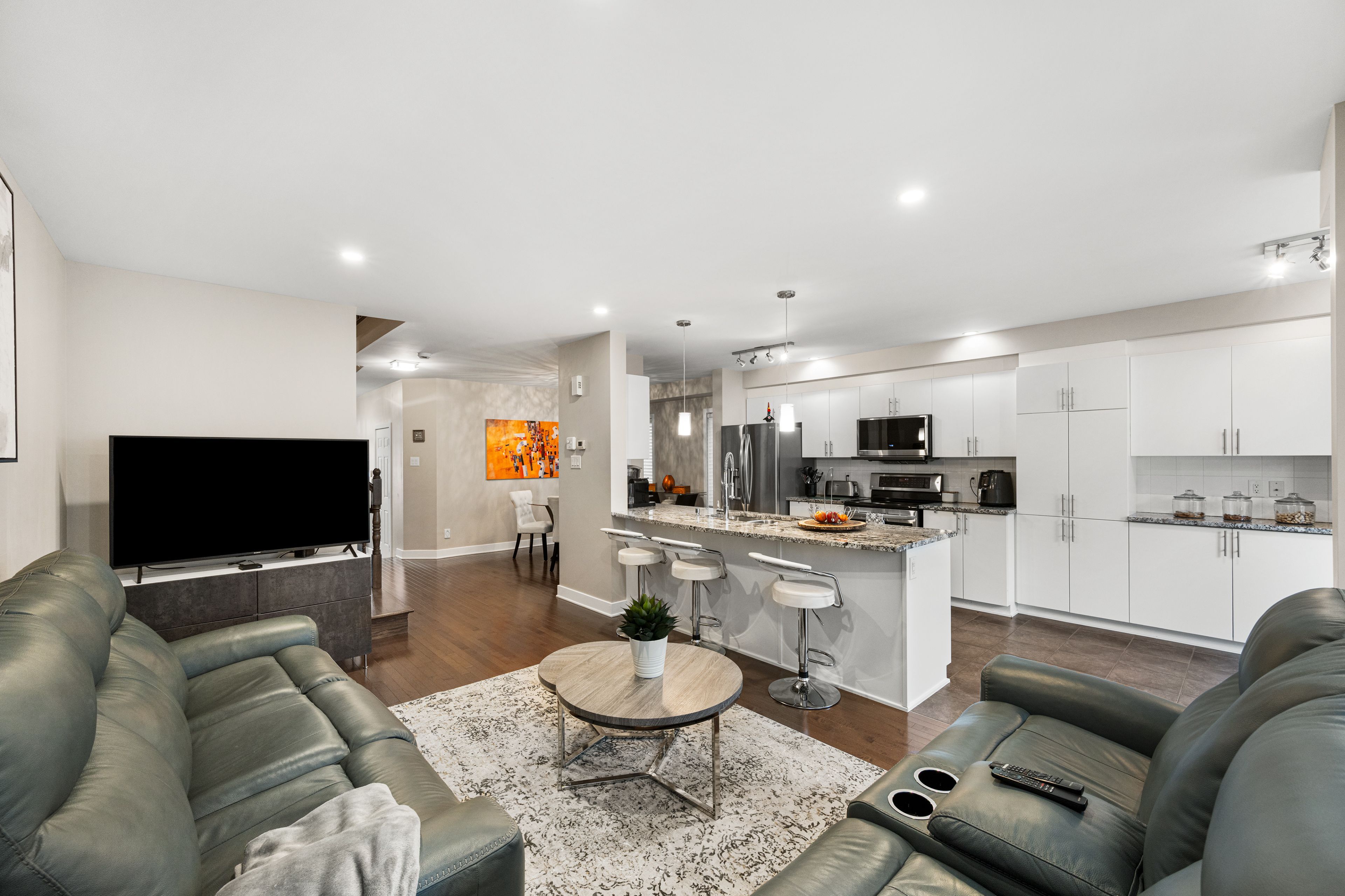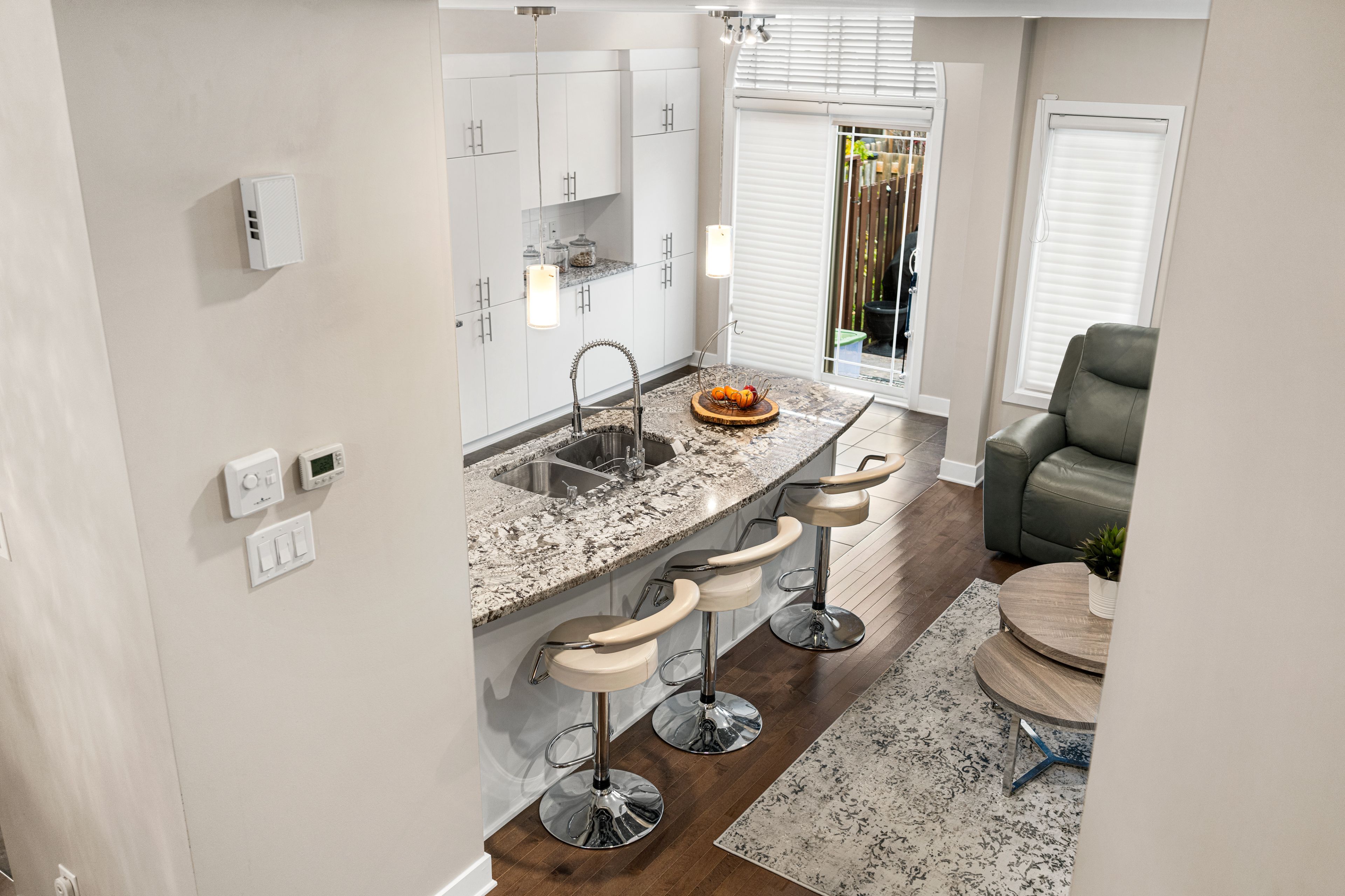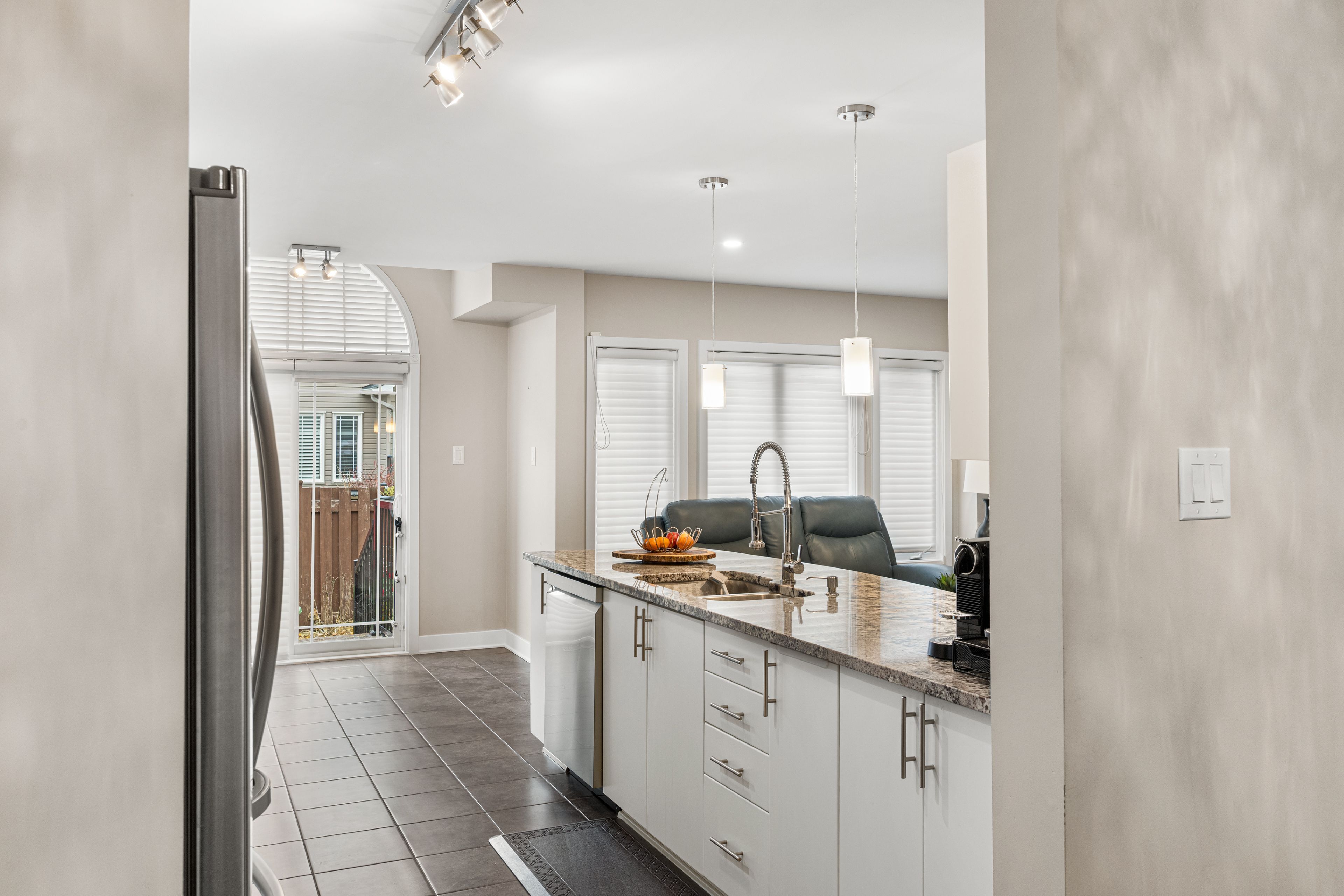 Welcome to this stunning end-unit freehold townhouse offering a perfect blend of comfort and style. This beautifully maintained home features three spacious bedrooms, including a luxurious master suite complete with a private ensuite bathroom. The main level boasts gleaming hardwood and elegant ceramic floors, while the upper-level bedrooms and finished basement are warmly carpeted for added comfort. The modern kitchen is a chef's delight with sleek granite countertops and ample cabinetry. Step outside to enjoy the professionally designed stamped concrete patio, ideal for entertaining or relaxing in your private outdoor space. This home combines functionality and sophistication, making it a perfect choice for families or professionals seeking a turnkey property in a desirable neighborhood. Next day notice for showings