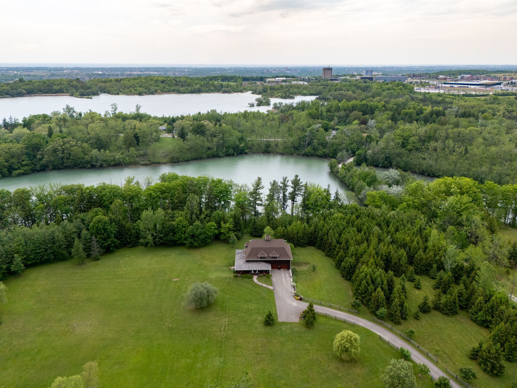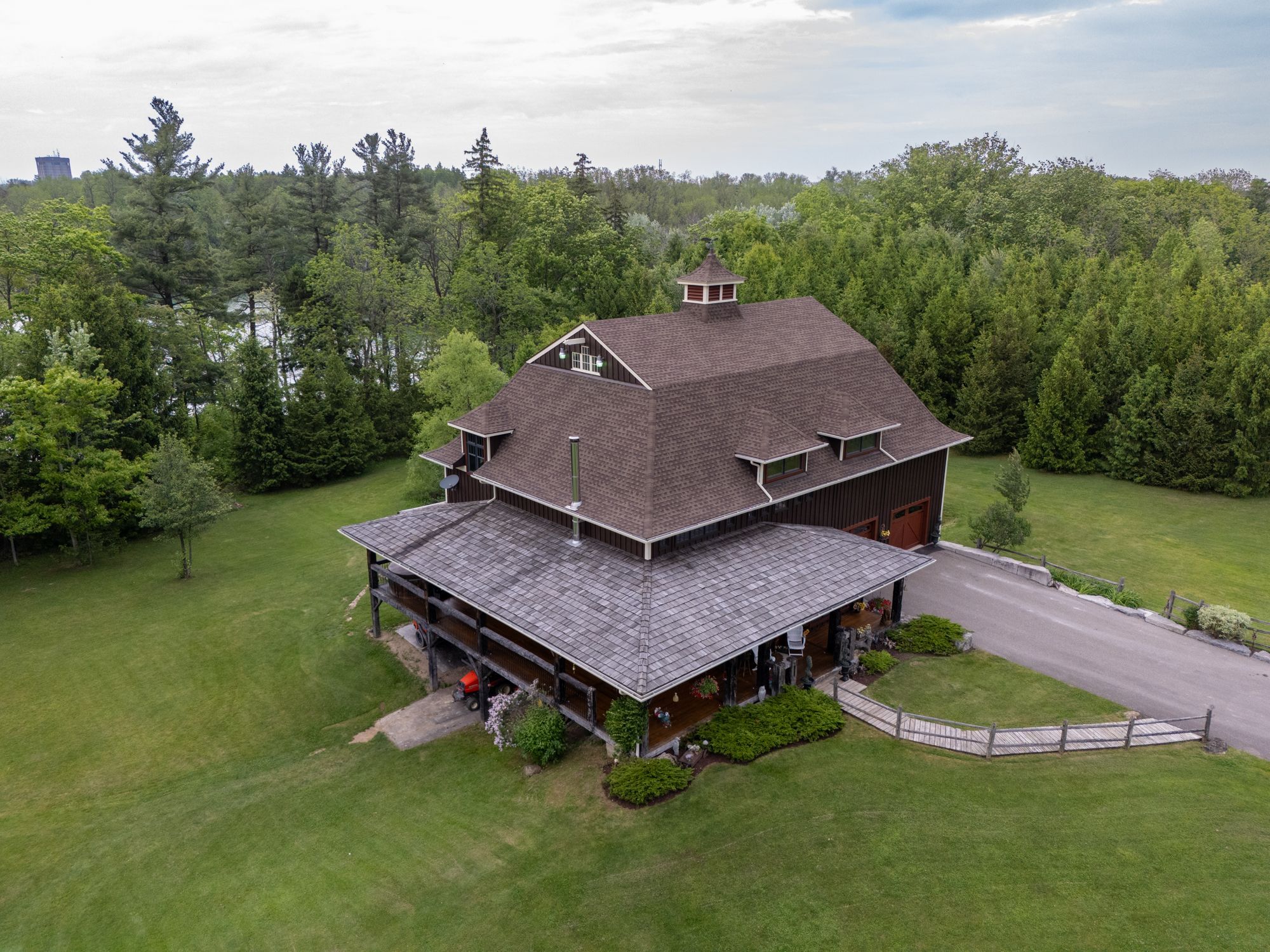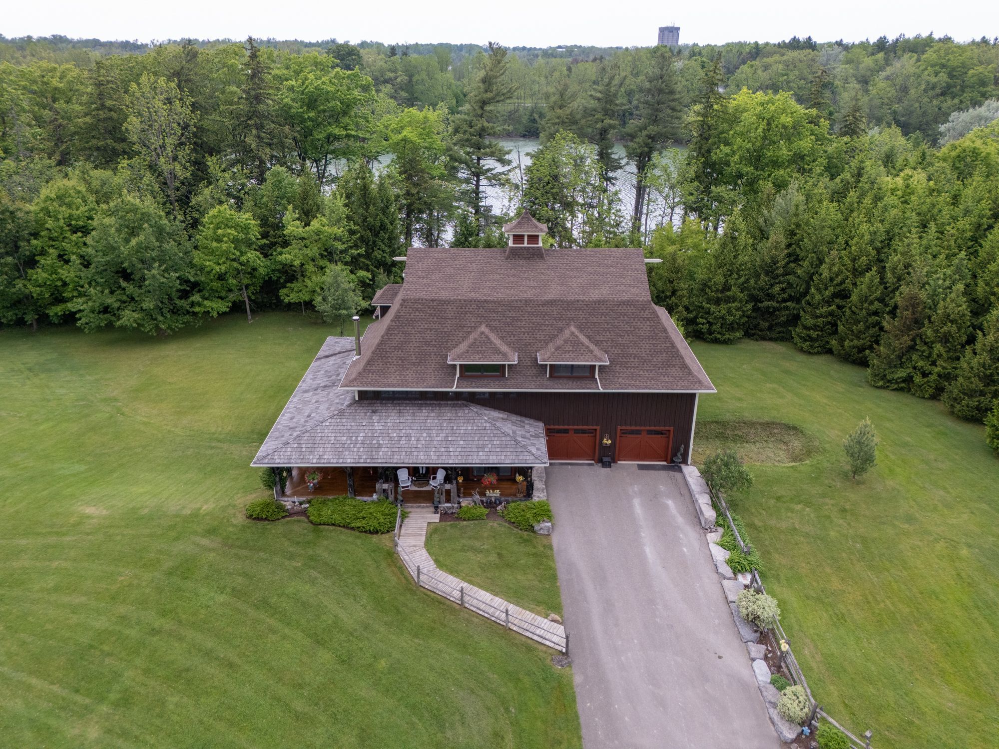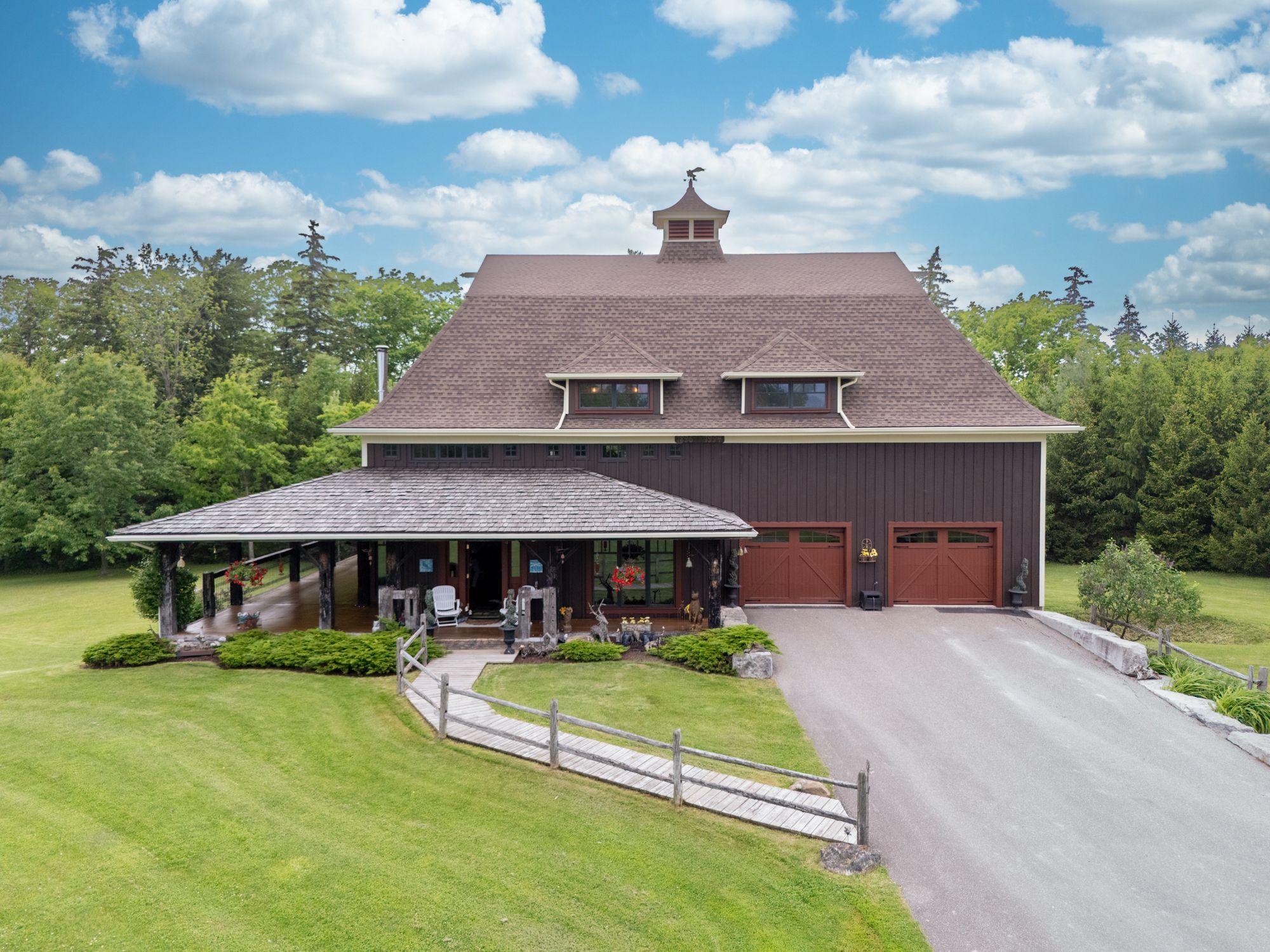 Welcome to 3111 faywell road situation in the quaint town of fonthill. Once known as the 1896 "old seedbarn" this country barn style home has been reclaimed and rebuilt on this 17 acres parcel of land that boasts walking trails, a private waterfront pond, a long winding driveway and a golfing green. With nearly 1200 feet of lake gibson waterfront, enjoy your coffee with morning waterfront views on your wraparound covered porch and veranda. Make your way inside, the main features a stunning open concept dinning, living and kitchen area with nearly 17 foot ceilings. Custom wainscotting and panels cover every inch of this character home. With exposed beam construction you are able to take in the detailed craftsmanship of this build. Primary bedroom, ensuite and custom walk in closet conveniently located on the main level. Make your way up the staircase to the loft entertainment area with a wet bar. Additionally you will find another bedroom and full bathroom. The home features nearly 10,000 sq/ft; 2550 sq/ft of finished living space, 2400 sq/ft drive in basement, three car garage and additional 4661 sq/ft of constructed spaces. The lower level features a workshop, entertainment area and plenty of space for the car enthusiast. Not to mention the three car attached garage with a second storey waiting for your finishing touches.