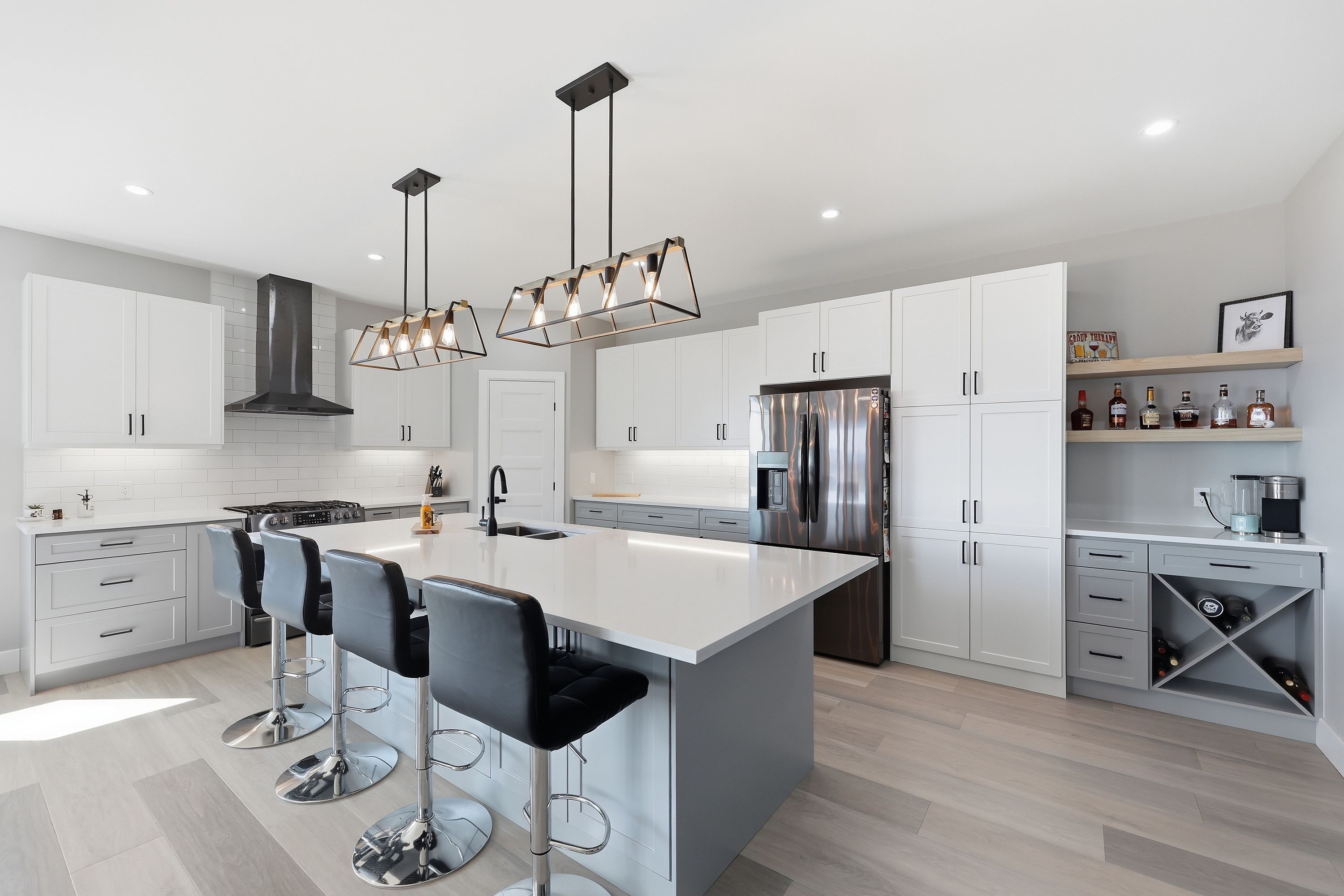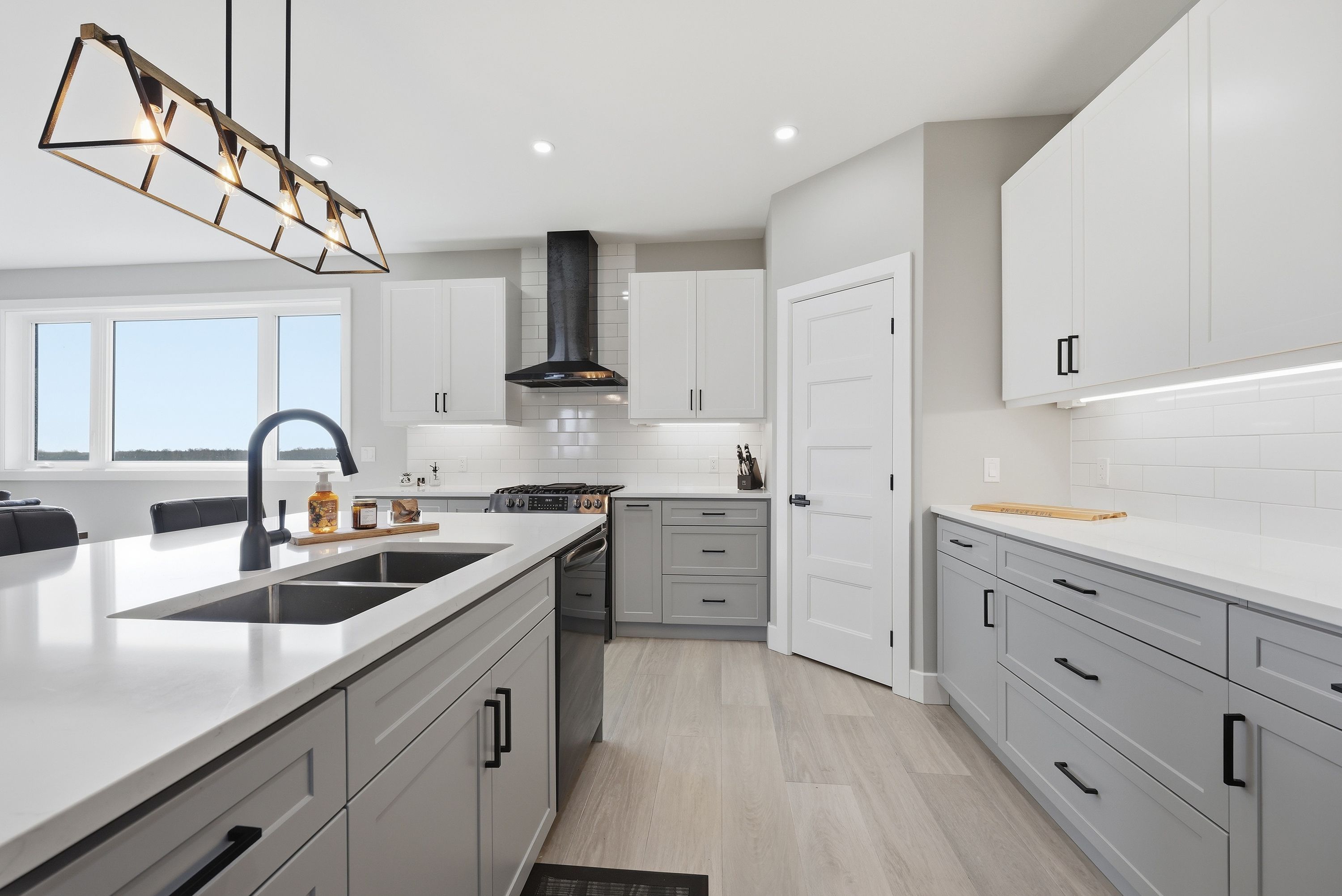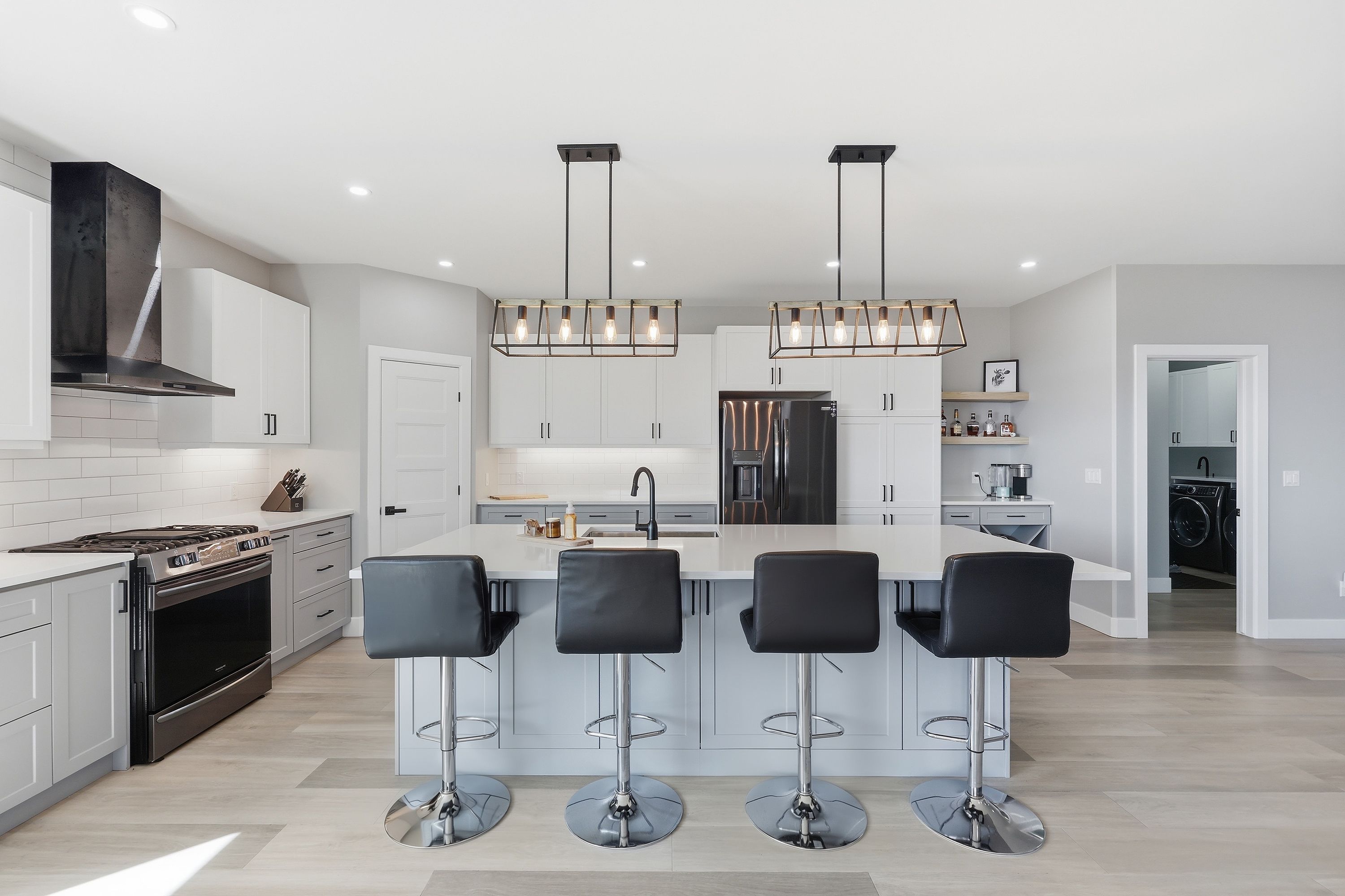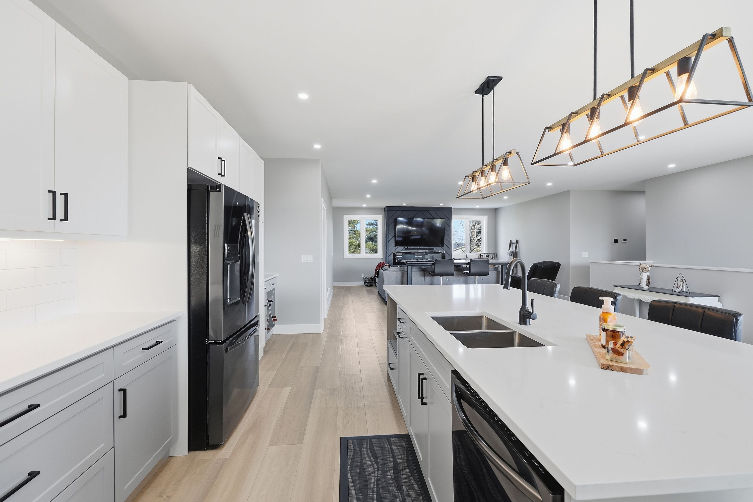• Spacious open-concept kitchen with quartz countertops and stainless steel appliances.