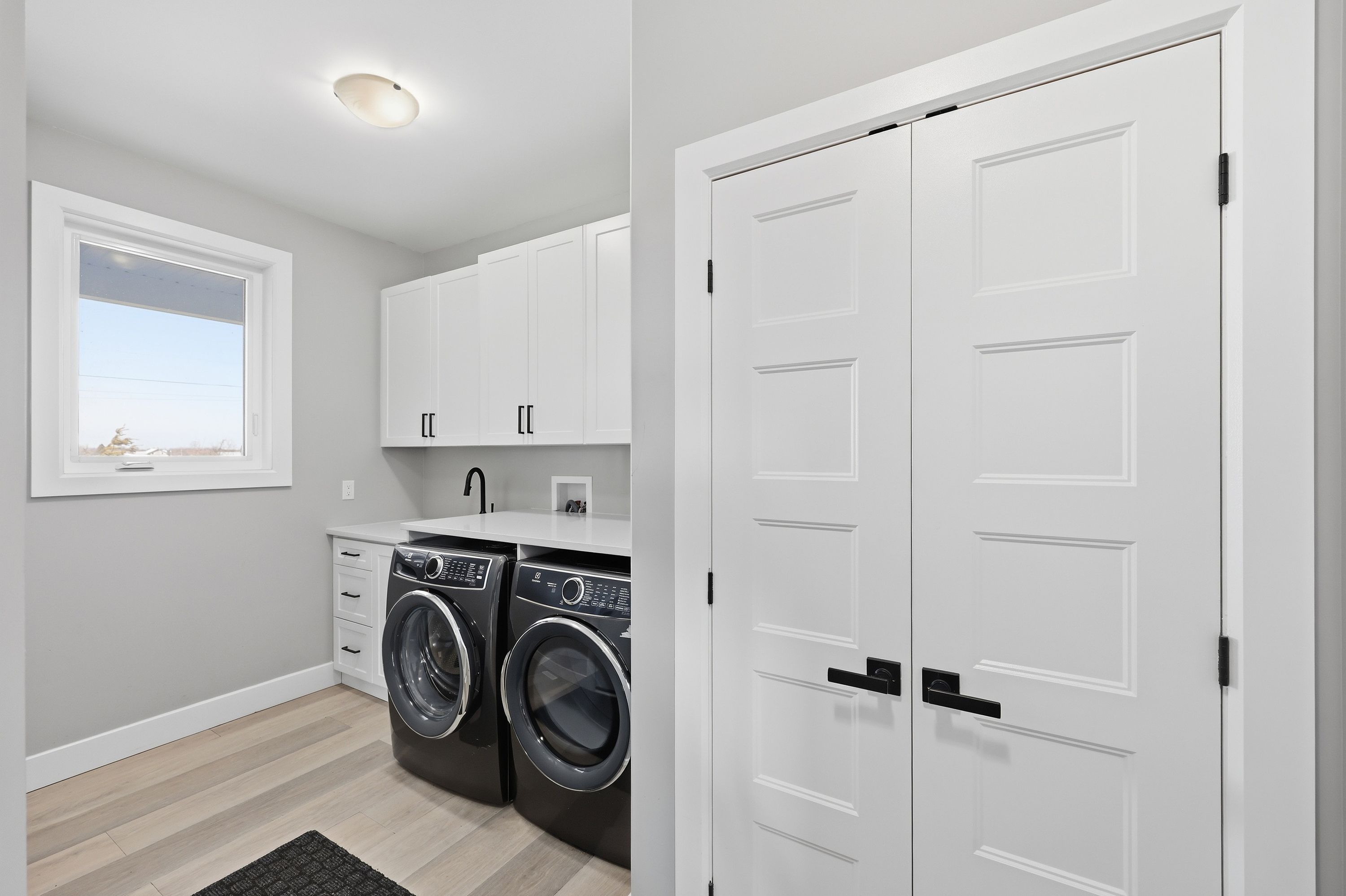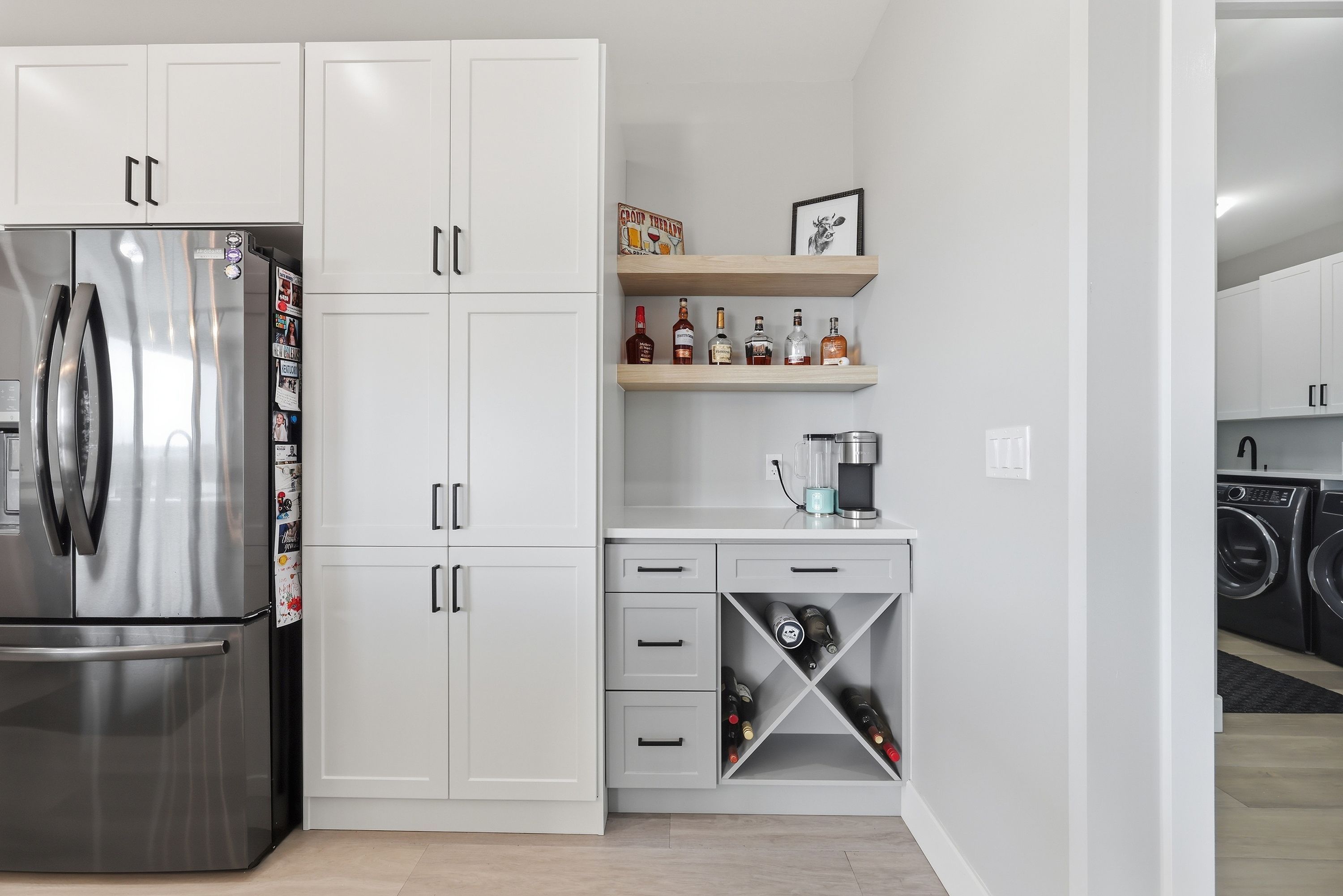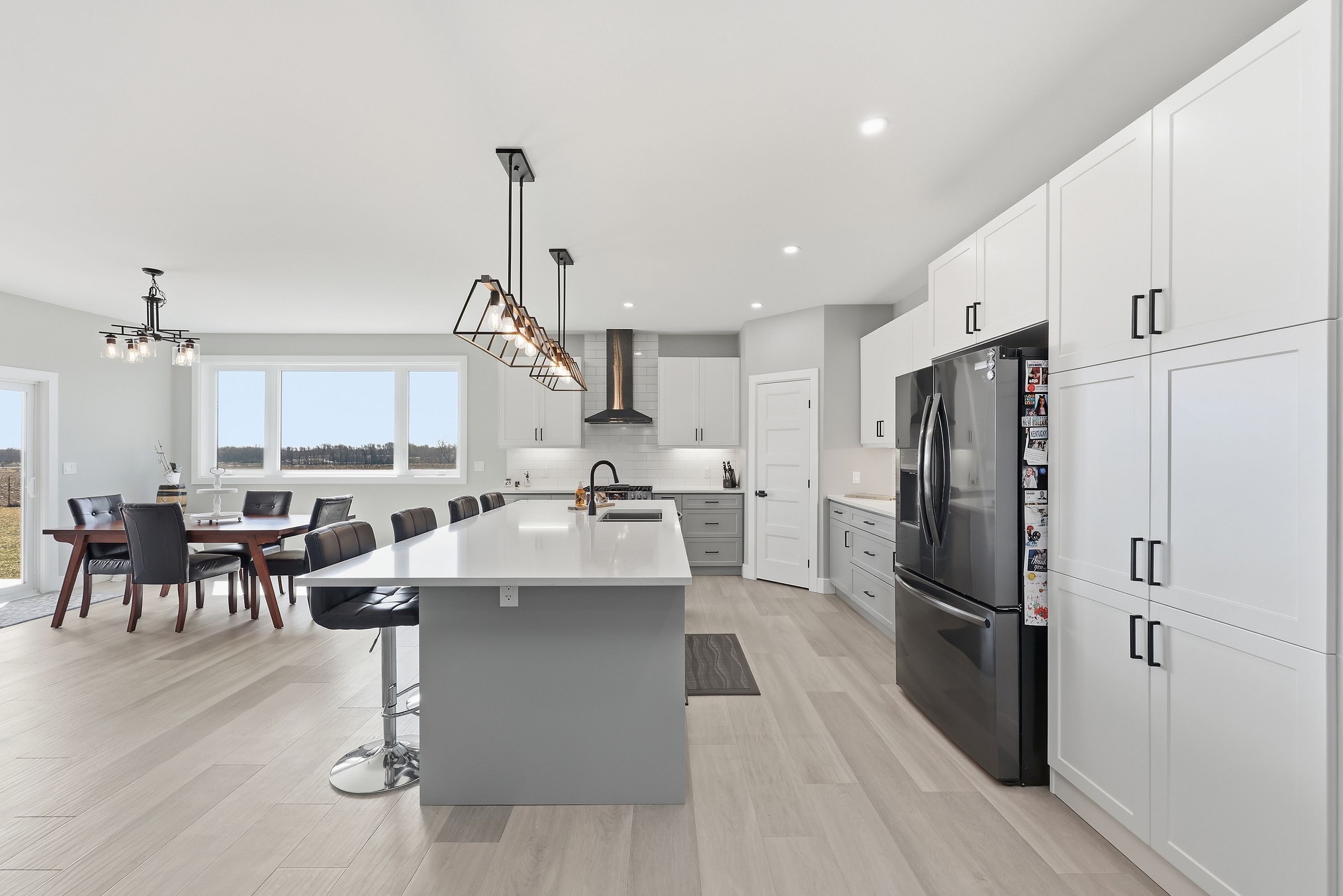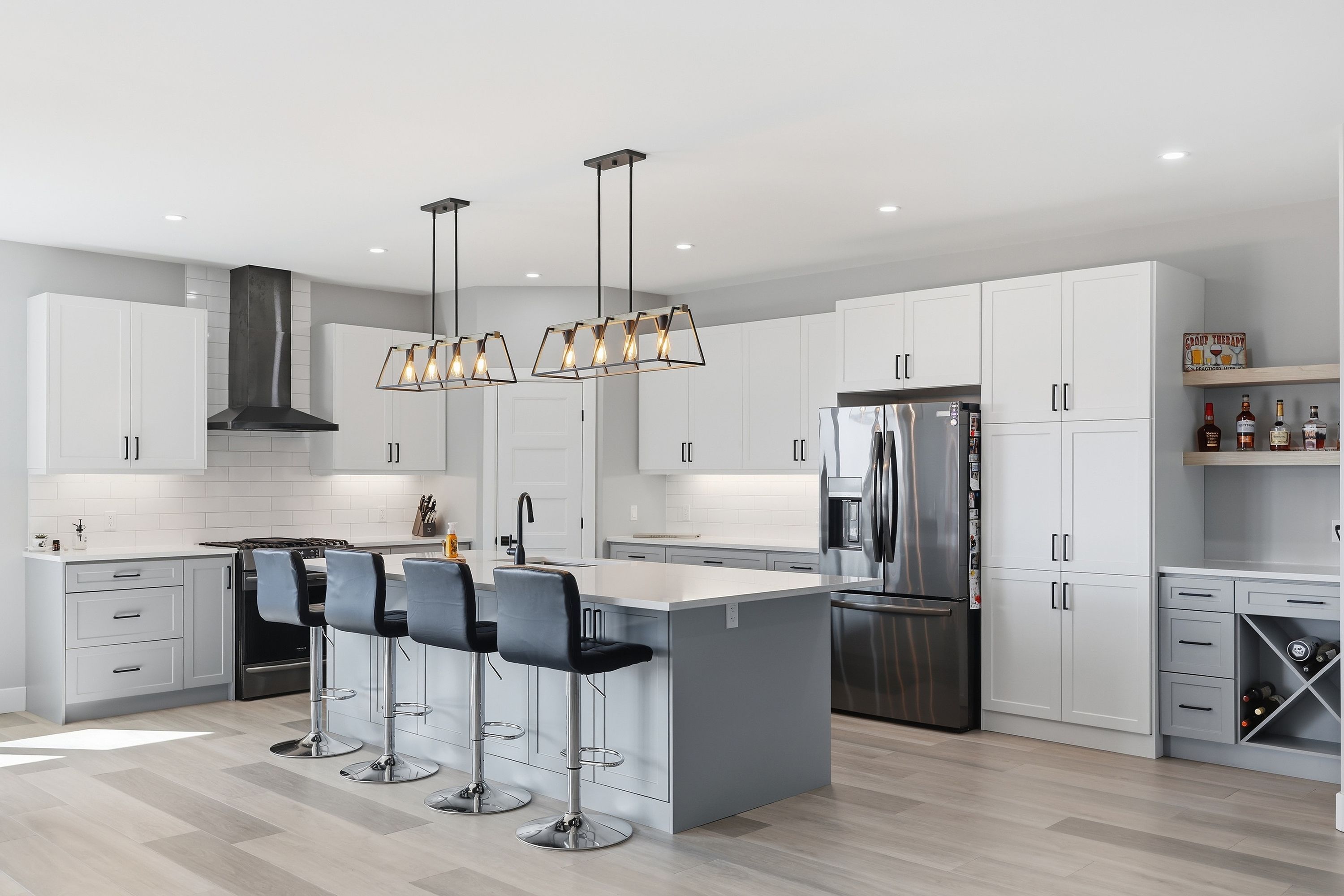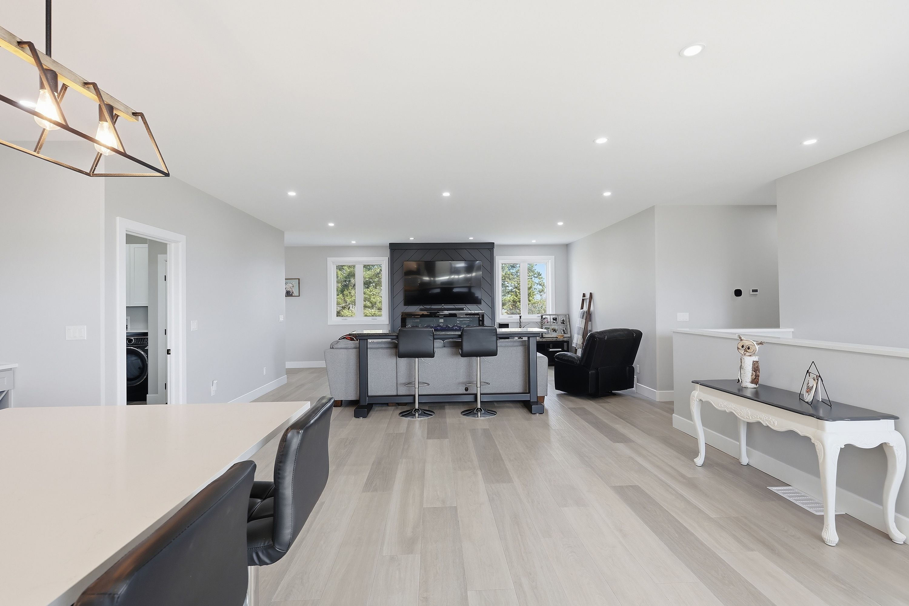 • Spacious open-concept kitchen with quartz countertops and stainless steel appliances.