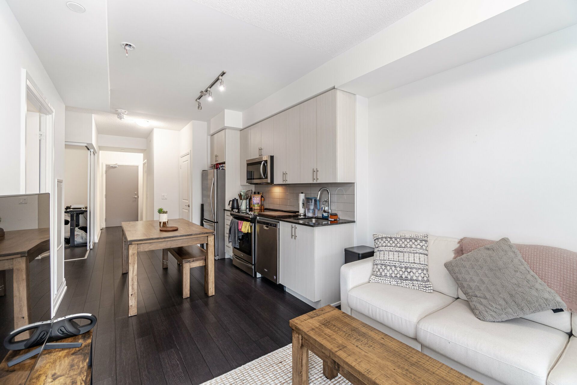 Welcome to unit 307 at wish condos - a modern, sun-filled one-bedroom + den suite offering two full washrooms and an exceptional layout designed for comfort, flexibility, and style. Only three years new, this contemporary residence showcases an open-concept design that maximizes space and natural light, highlighting elegant finishes and sleek stainless steel appliances throughout. The spacious den is large enough to function as a second bedroom or private home office, making this unit perfect for professionals, couples, or small families seeking versatile living. The bright living and dining area seamlessly extends to a private balcony - an ideal retreat for morning coffee or unwinding at sunset. This unit includes one owned parking space and a conveniently located locker on the same floor, providing valuable extra storage and everyday convenience. Residents enjoy access to premium building amenities including a fully equipped fitness centre, yoga studio, sports lounge, games and cards room, party room with dining area, recreation room, guest suites, and a stunning rooftop terrace perfect for entertaining or relaxing with panoramic views. The location is unbeatable. Transit is literally at your doorstep with bus stops just outside the building offering direct routes to scarborough town centre and cf fairview mall. Commuters will appreciate easy access to highways 401 and 404, connecting you quickly across the gta. Enjoy nearby shopping, dining, parks, schools, and everyday essentials all within minutes. A perfect blend of modern design, premium amenities, and outstanding convenience - this is an exceptional rental opportunity you won't want to miss.