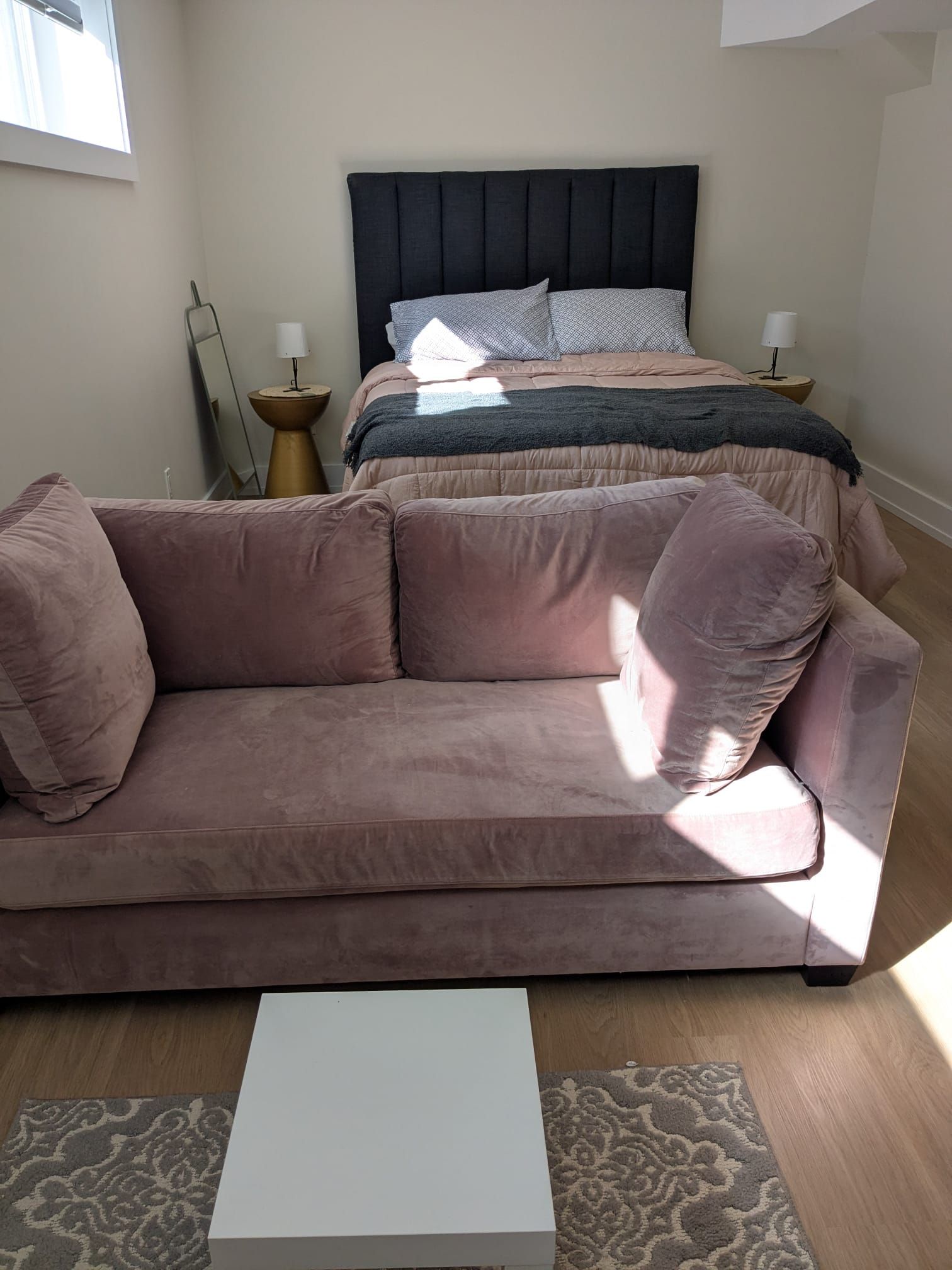 • Furnished studio apartment with modern amenities and chic design.