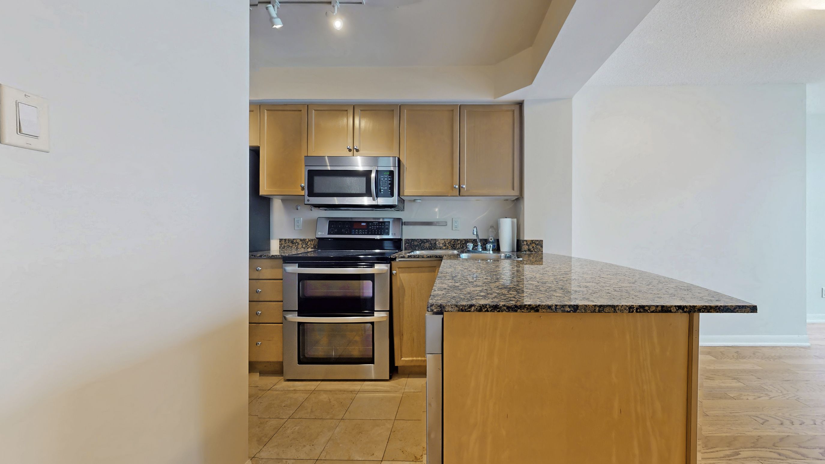 • Features stainless steel appliances and granite countertops in kitchen.