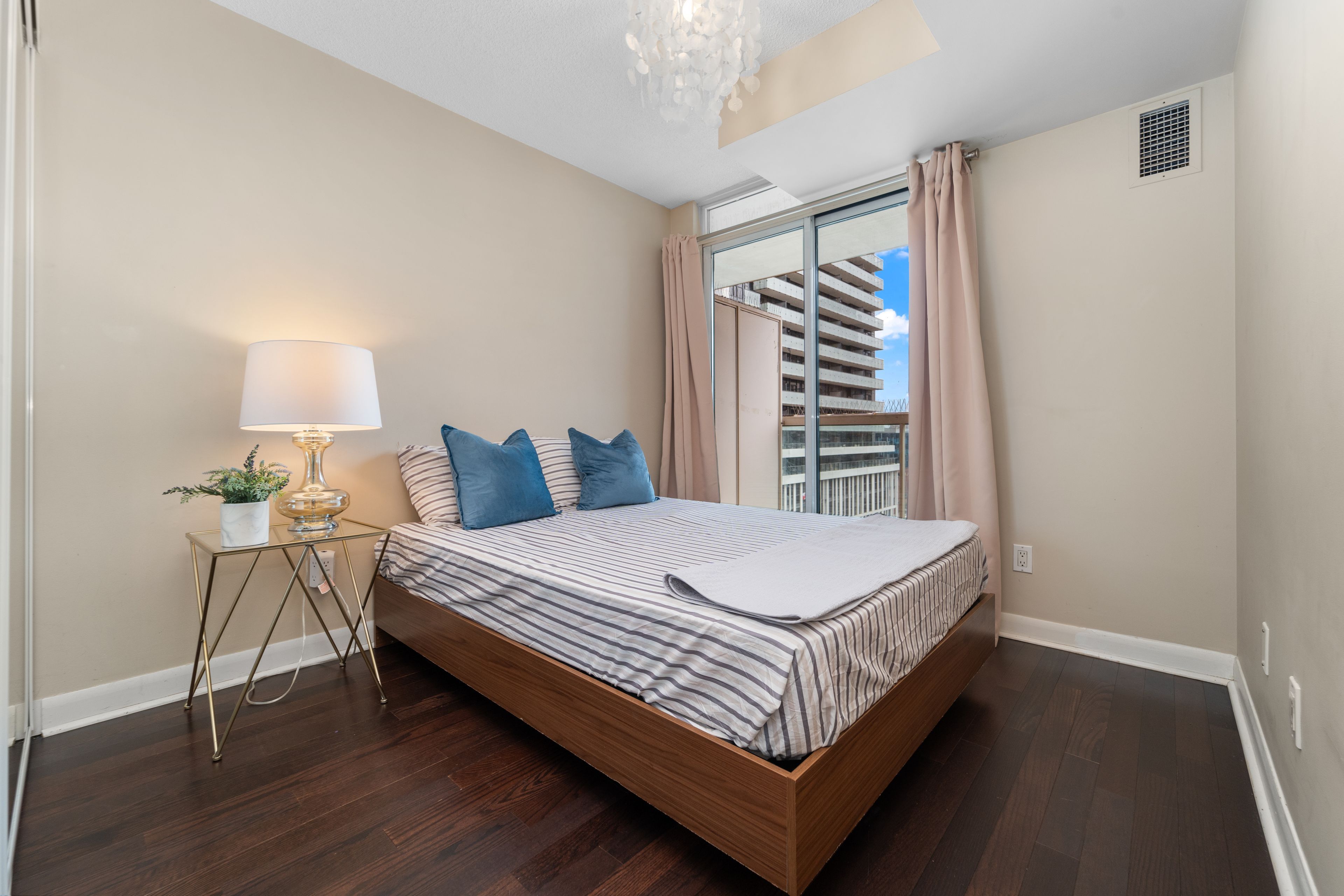 • Generous bedroom with floor-to-ceiling windows and access to a private balcony.