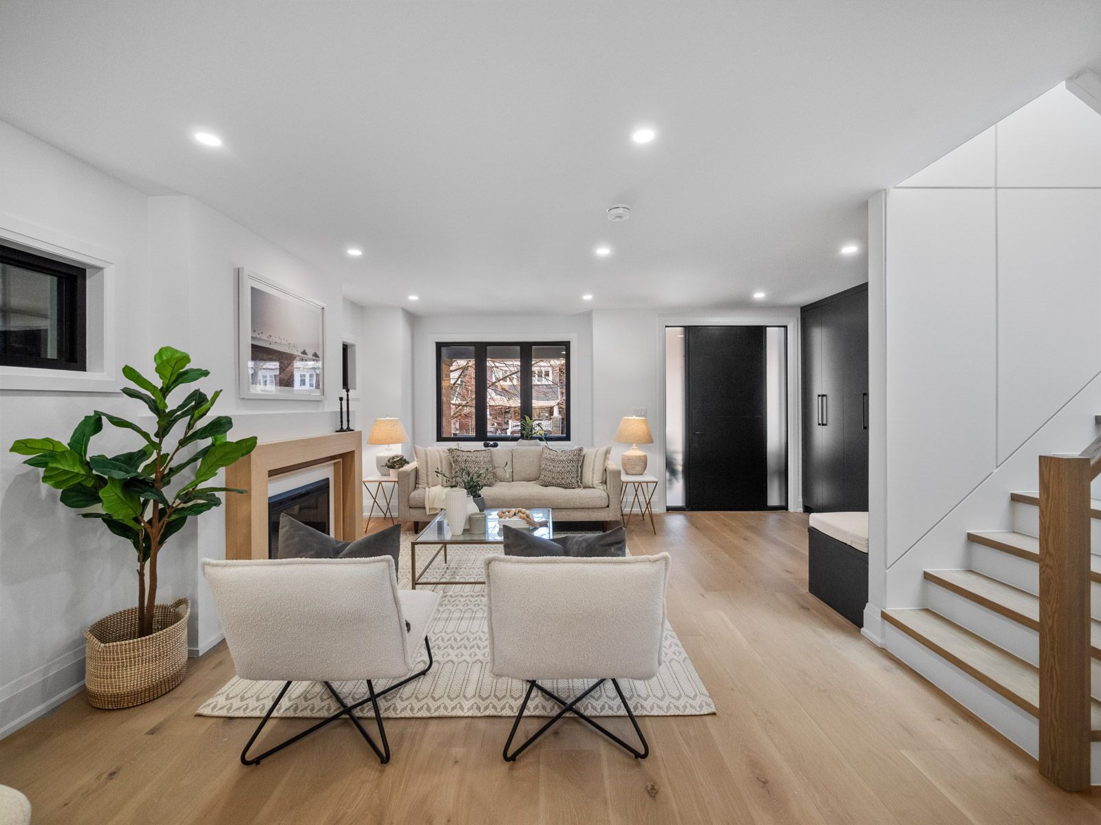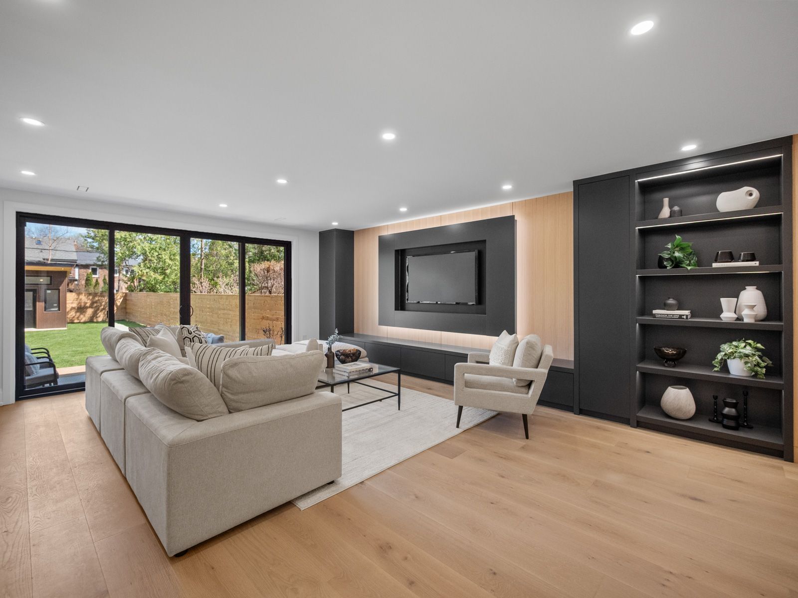 • Open concept main floor with a striking light-filled staircase and custom millwork.