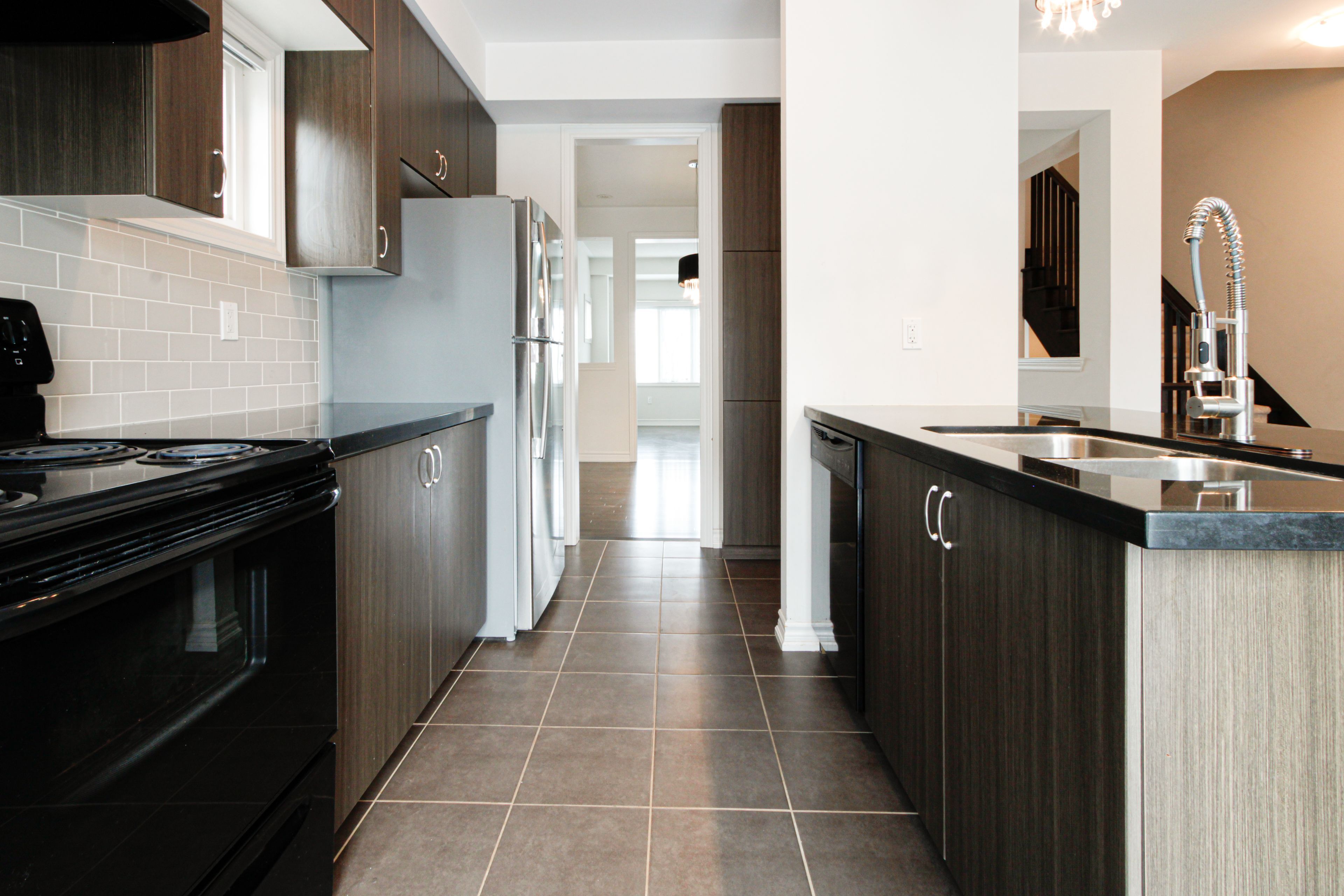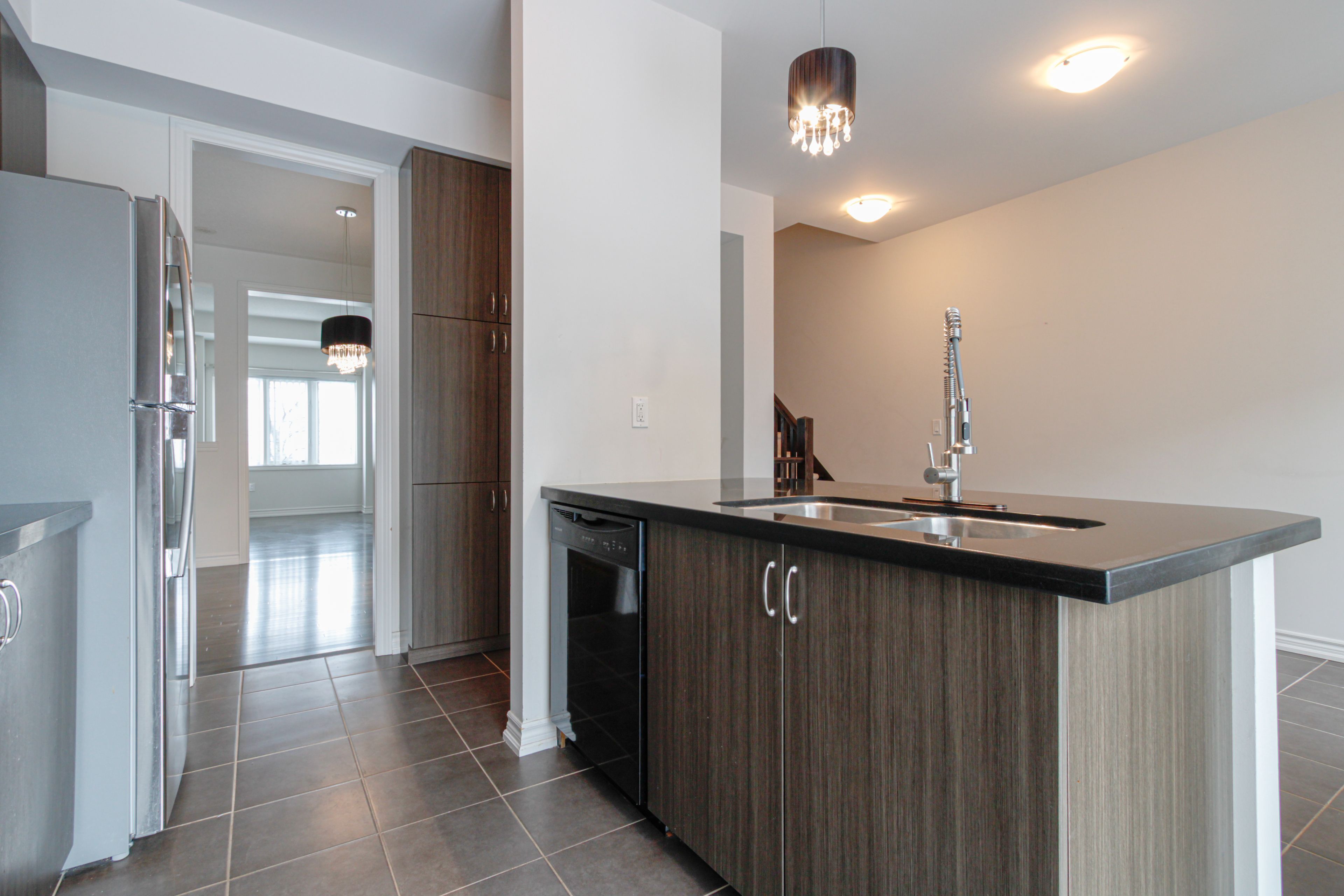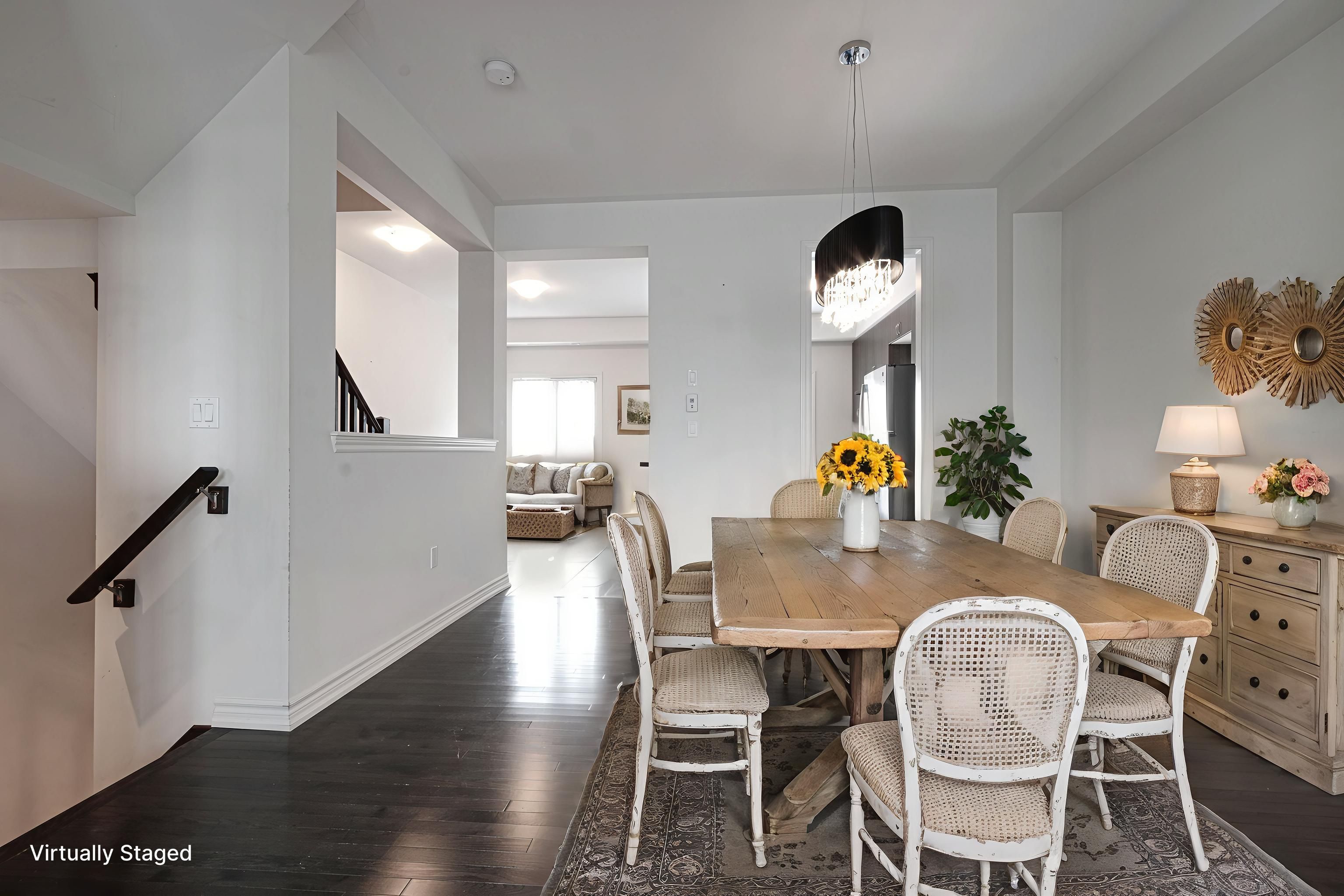 This beautiful and large 1,996 sq. Ft. (above grade), 9 year-old daniels end unit townhome offers refined living spaces and modern amenities. 3 bedrooms on the 3rd floor and a versatile 4th bedroom or den on the main floor complemented by a two-piece ensuite and provides a separate rear entrance with direct access to winston churchill boulevard. Features include elegant dark stained hardwood floors, dark oak staircases with runners from the main to the second floor, and from the second to the third floor. The second floor boasts soaring 9-foot ceilings, granite countertops, and a ceramic backsplash in the kitchen. Recently (december 2025) installed upscale vinyl flooring enhances the second floor. Primary bedroom includes a large 5 piece ensuite plus his & hers closets (one is a large walk-in, probably "hers"!) the unfinished basement includes a roughed in washroom and bright oversized windows. Perfect for a 5th bedroom or comfy rec room! Additional highlights include a spacious deck off the kitchen, proximity to shopping, convenient transit access at your doorstep, and easy connection to highway 403. Pics with furniture are virtually staged.