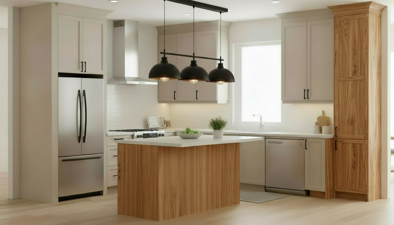 • Open-concept kitchen with stylish cabinetry and ample storage.